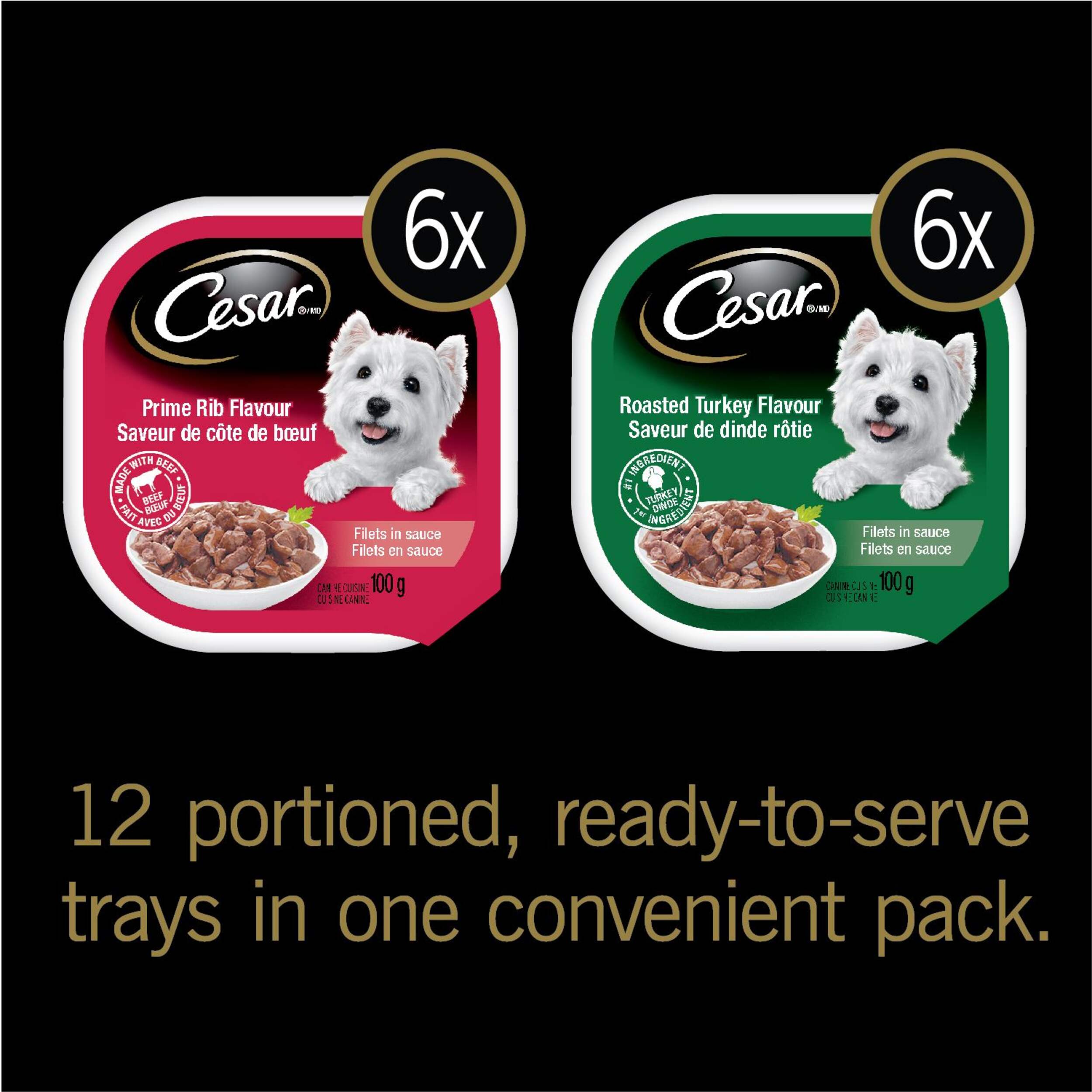 Contains twelve 100 gram trays of a Cesar Slices Variety Pack with Roast Turkey Flavour and Filet Mignon Flavour