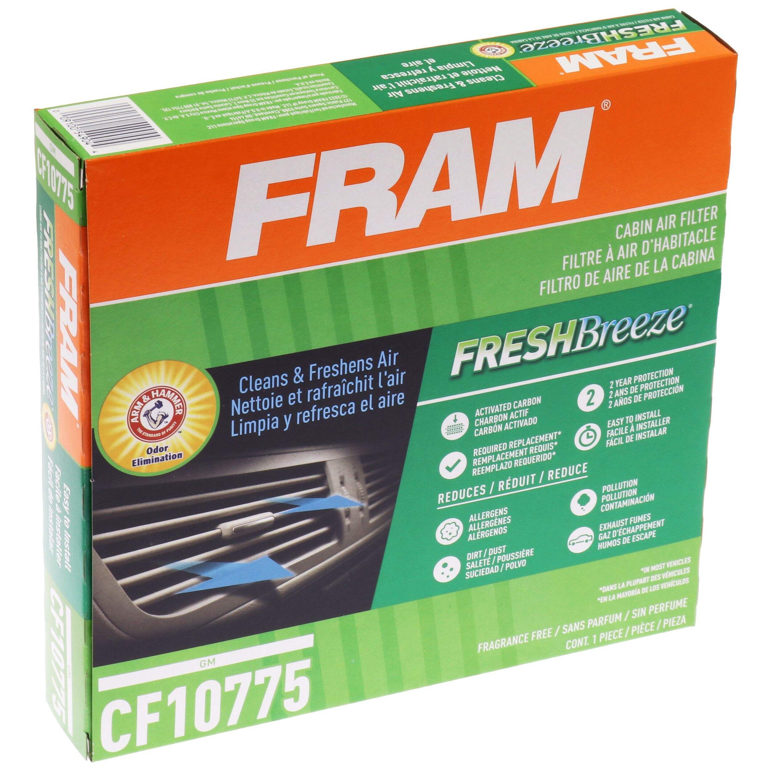 You and your passengers can breathe easier with FRAM® Fresh Breeze cabin air filters. These easy-to-install, fragrance-free air filters are designed to prevent up to 98% of road dust and pollen particles from entering your vehicle. They are the only activated carbon cabin air filters that harness the natural deodorizing properties of ARM & HAMMER™ baking soda to help clean and freshen the air throughout your vehicle.