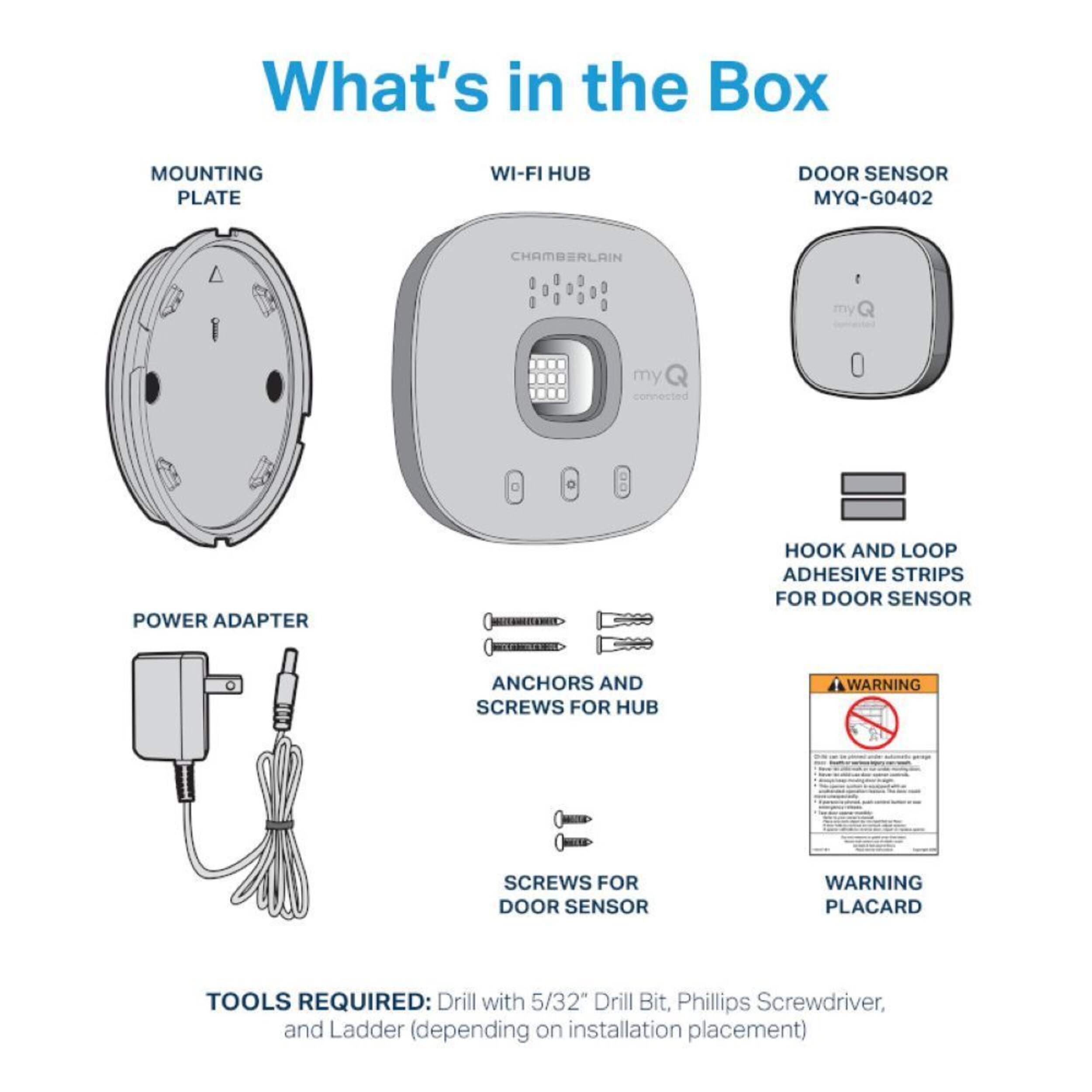 Box includes: Smart Garage™ Control hub, door sensor and mounting hardware.