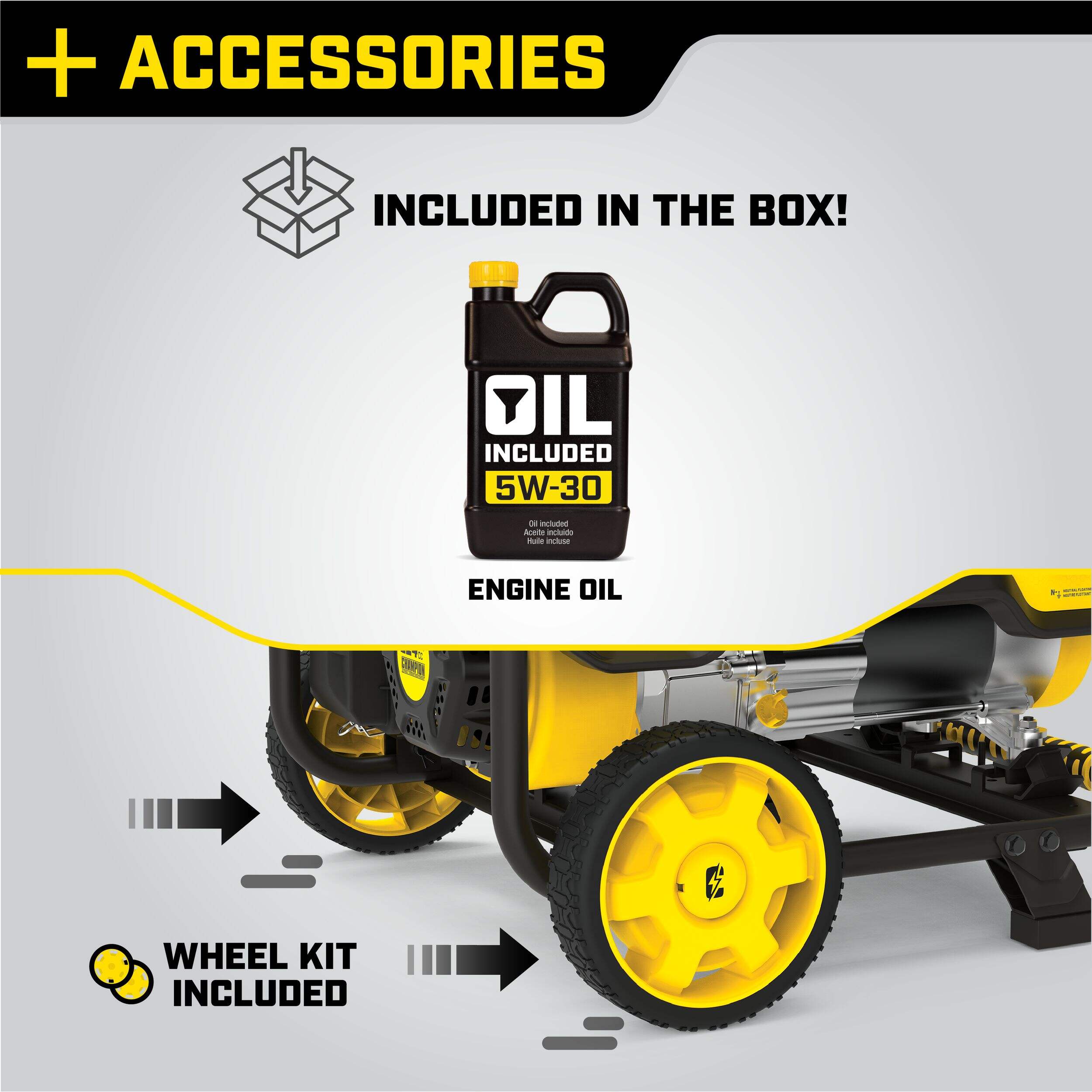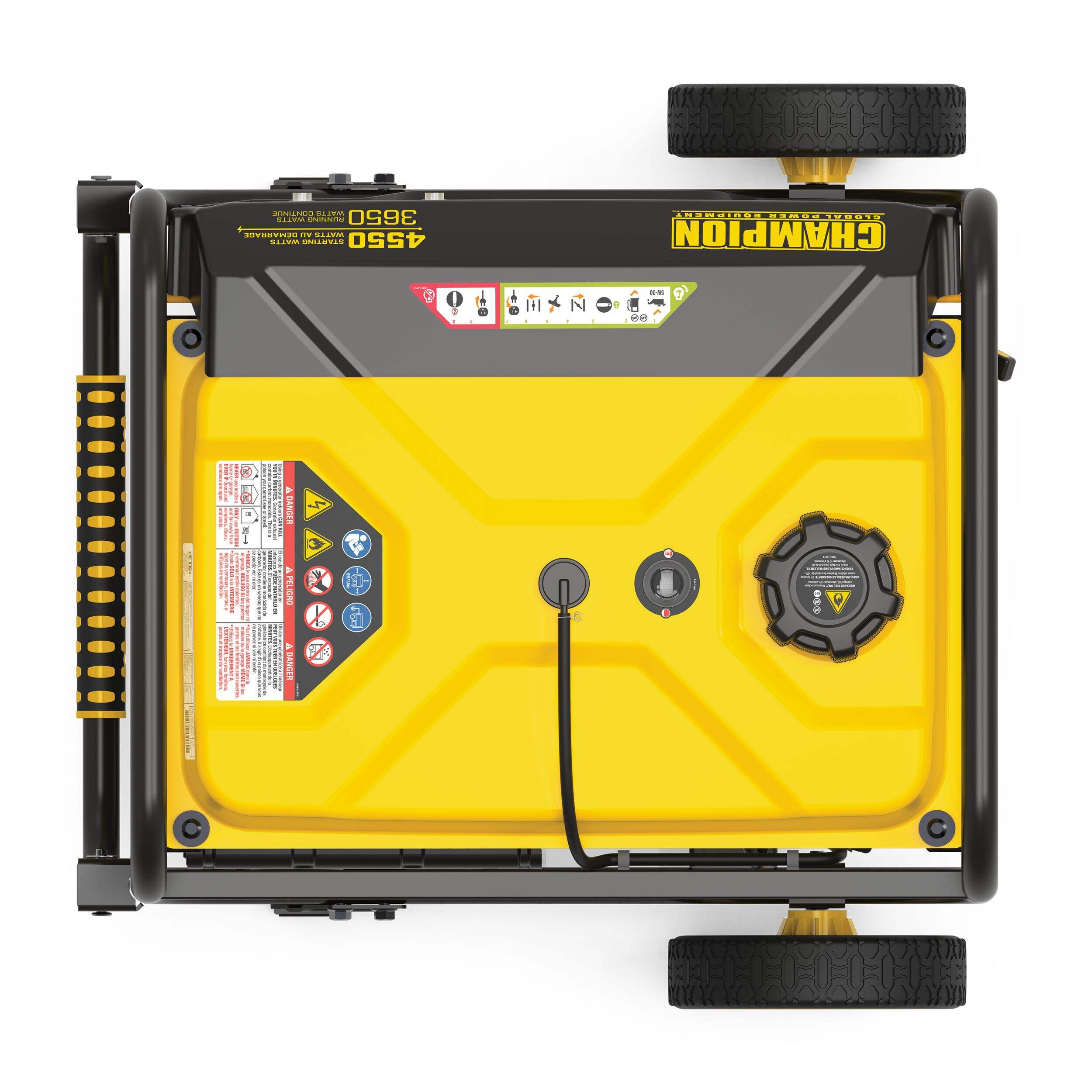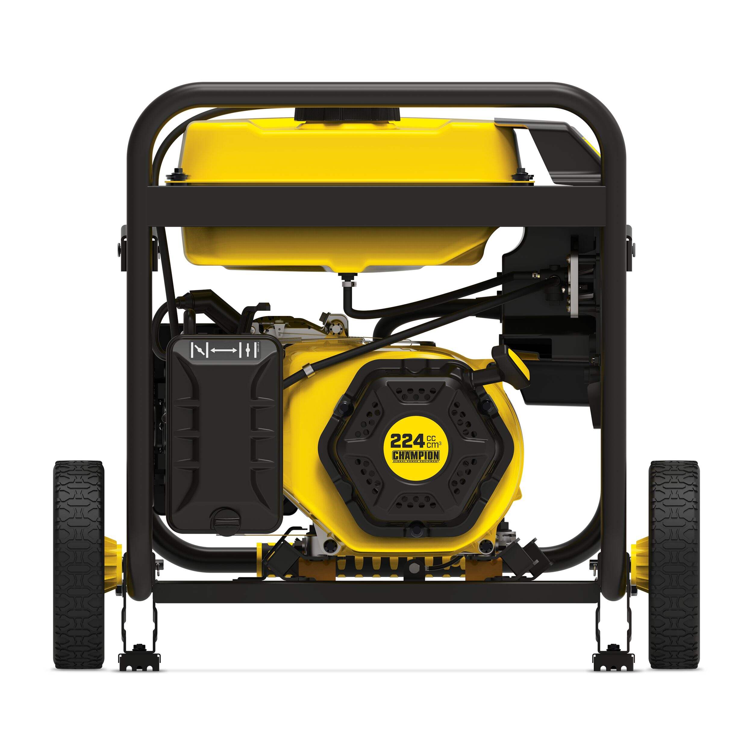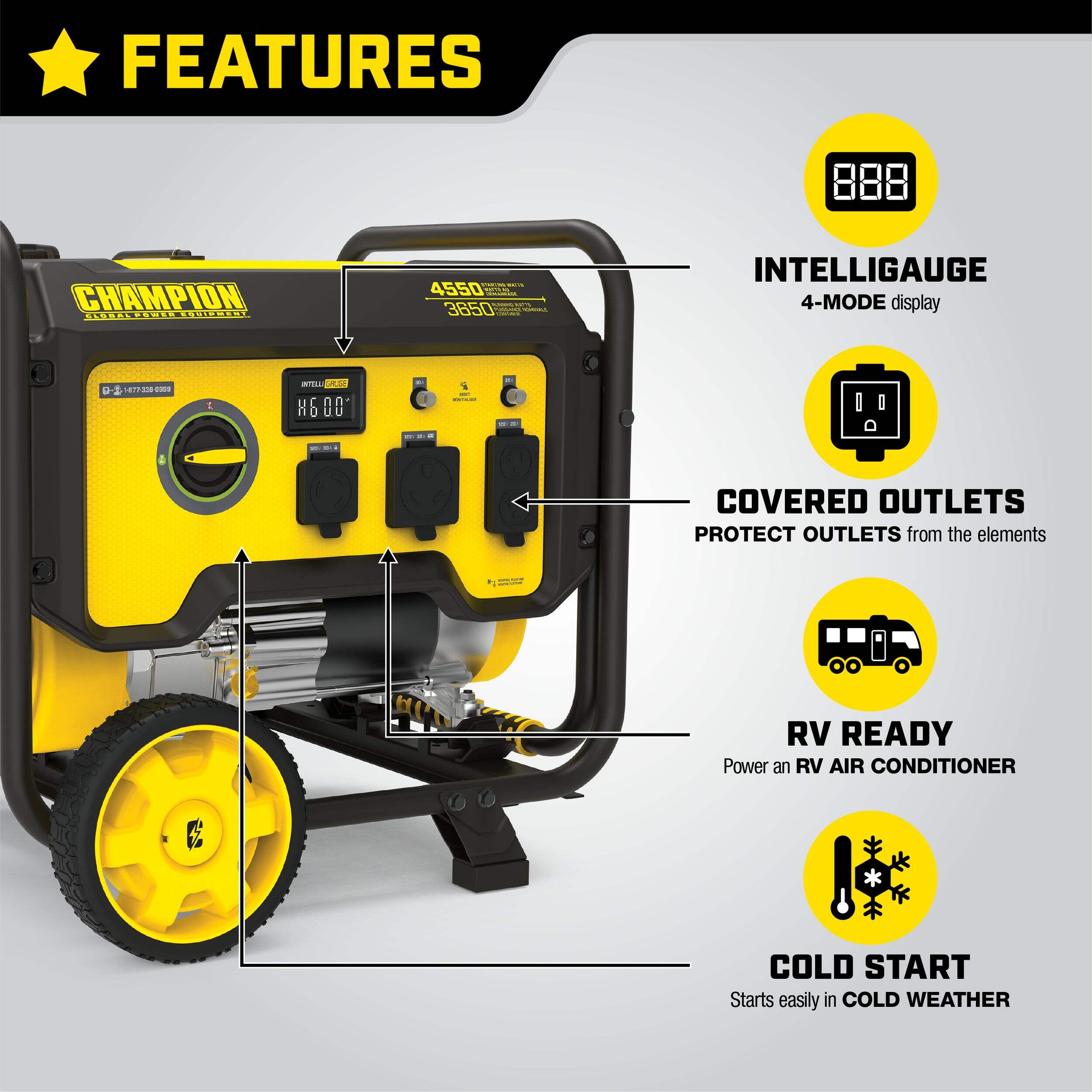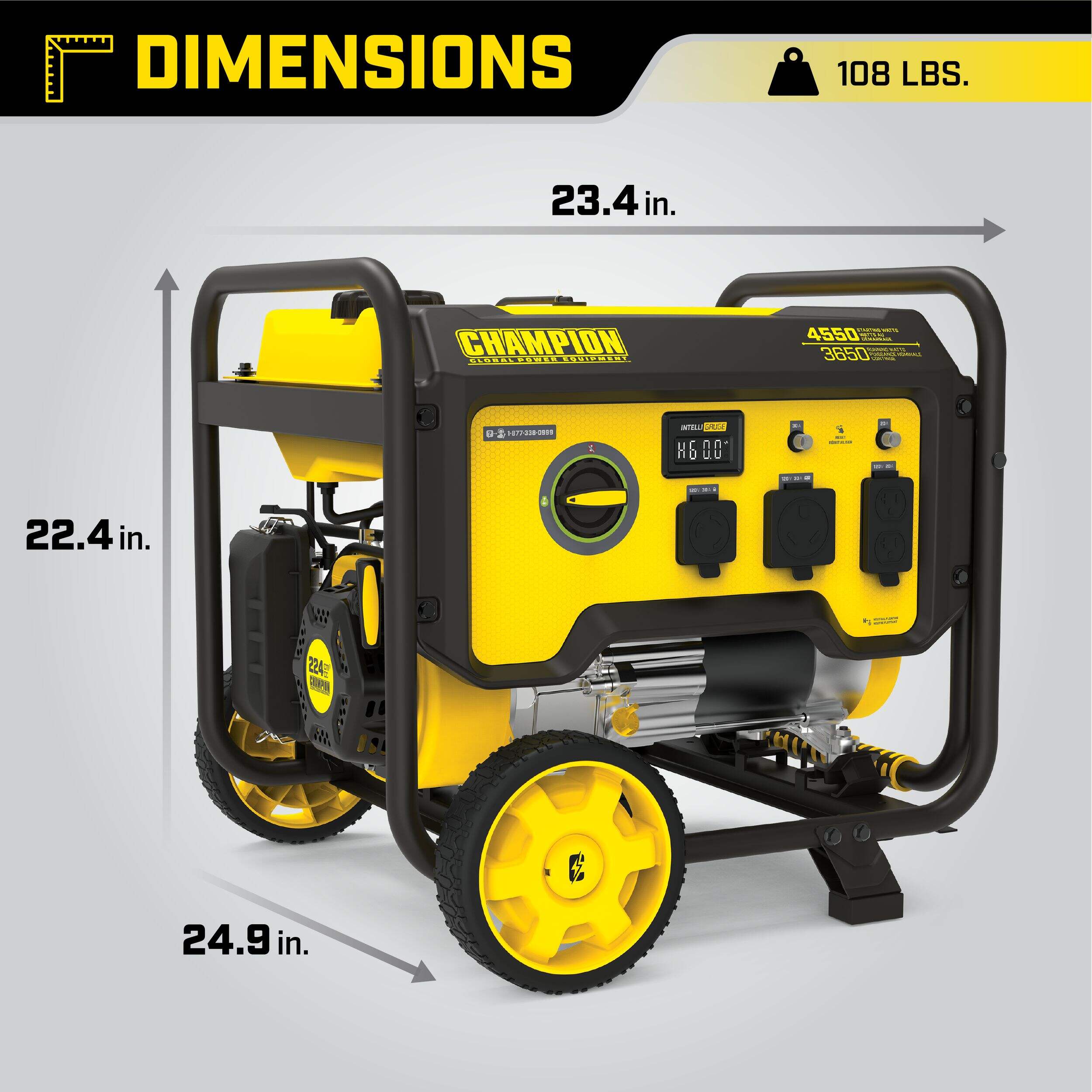 The Champion Power Equipment 201070 3650-Watt Portable Generator is the perfect combination of versatility and convenience. Power up with Champion’s reliable recoil start, plus Cold Start Technology ensures a quick start in cold weather. Champion also makes it easy to monitor voltage, frequency, runtime, and total runtime hours with Intelligauge. Designed for safety with convenient resettable circuit breakers, a low oil shut-off sensor plus an included oil funnel for easy changes, this unit has a 0.6-quart oil capacity (recommended 5W-30).The reliable 224cc single-cylinder OHV Champion engine produces 4550 starting watts and 3650 running watts, and will run for up to 14 hours at 50% load when the 4.7-gallon tank of gasoline is full. With a noise level of 68 dBA from 23 feet, which is about as loud as a vacuum cleaner, this machine can handle most essentials in a power outage. Champion’s thoughtful packaging and clear directions make setup hassle free, plus the foldaway handle makes it easy to store.