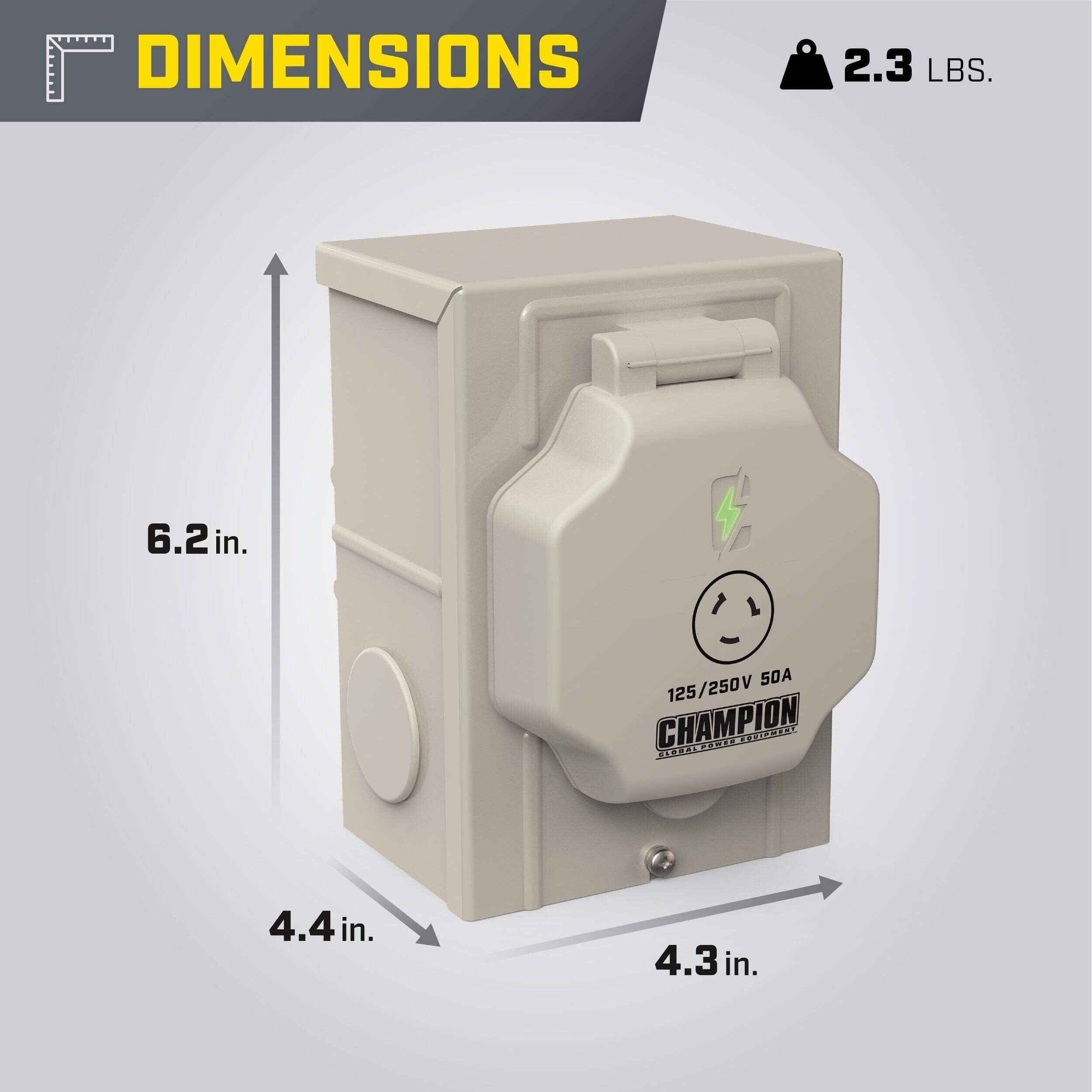 Champion’s 50A 125/250V Power Inlet Box provides a safe, easy way to connect generator power to your home. Featuring a weather-resistant SS2-50P connection and NEMA 3R outdoor-rated enclosure, it’s built for quick installation and includes a power indicator, making it simple to connect to a transfer switch or interlock kit.