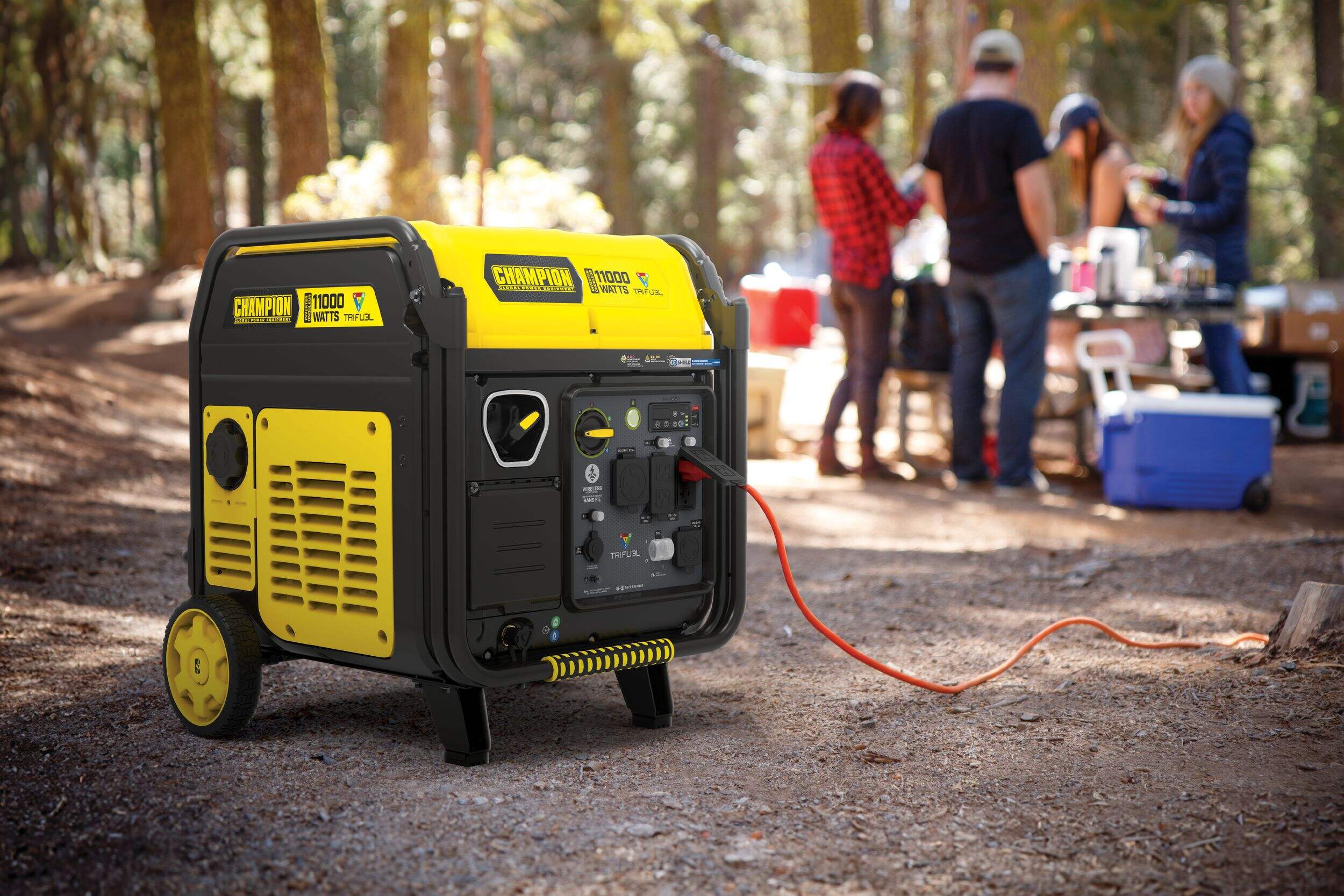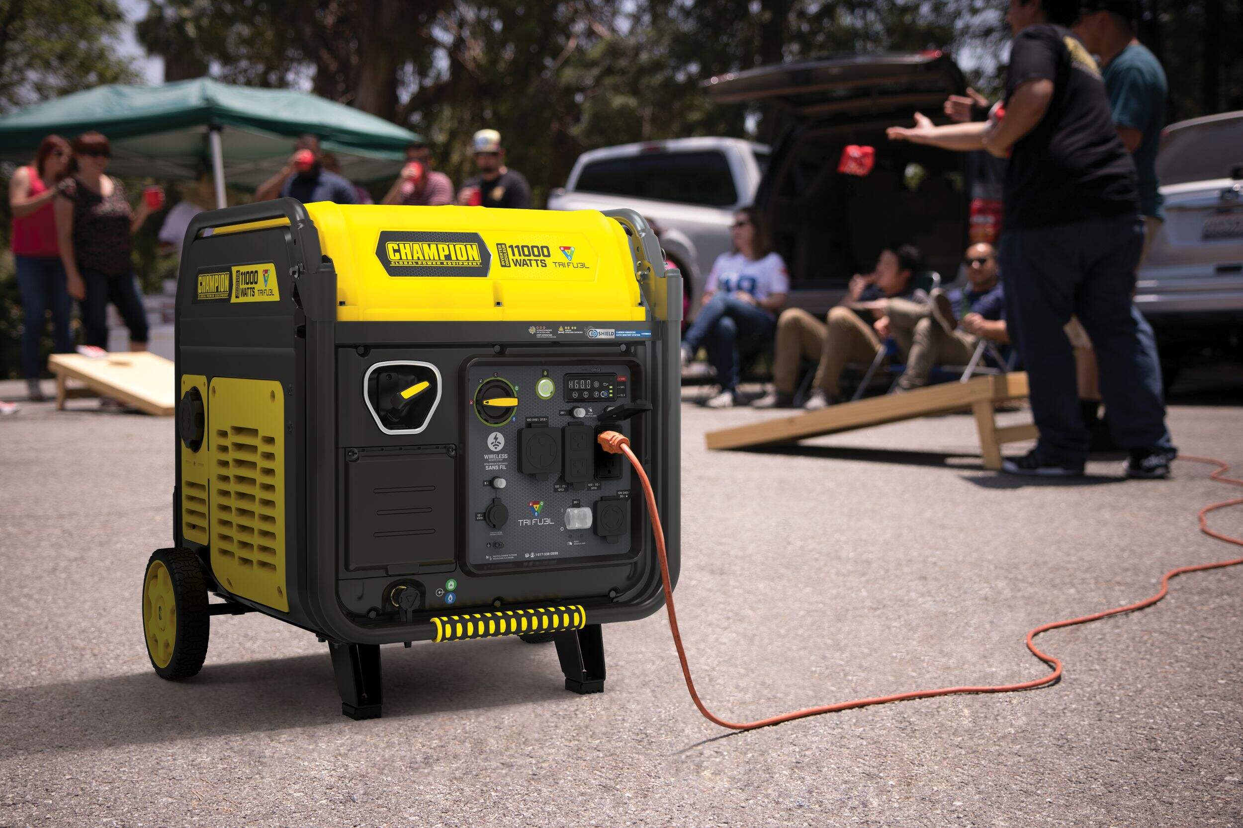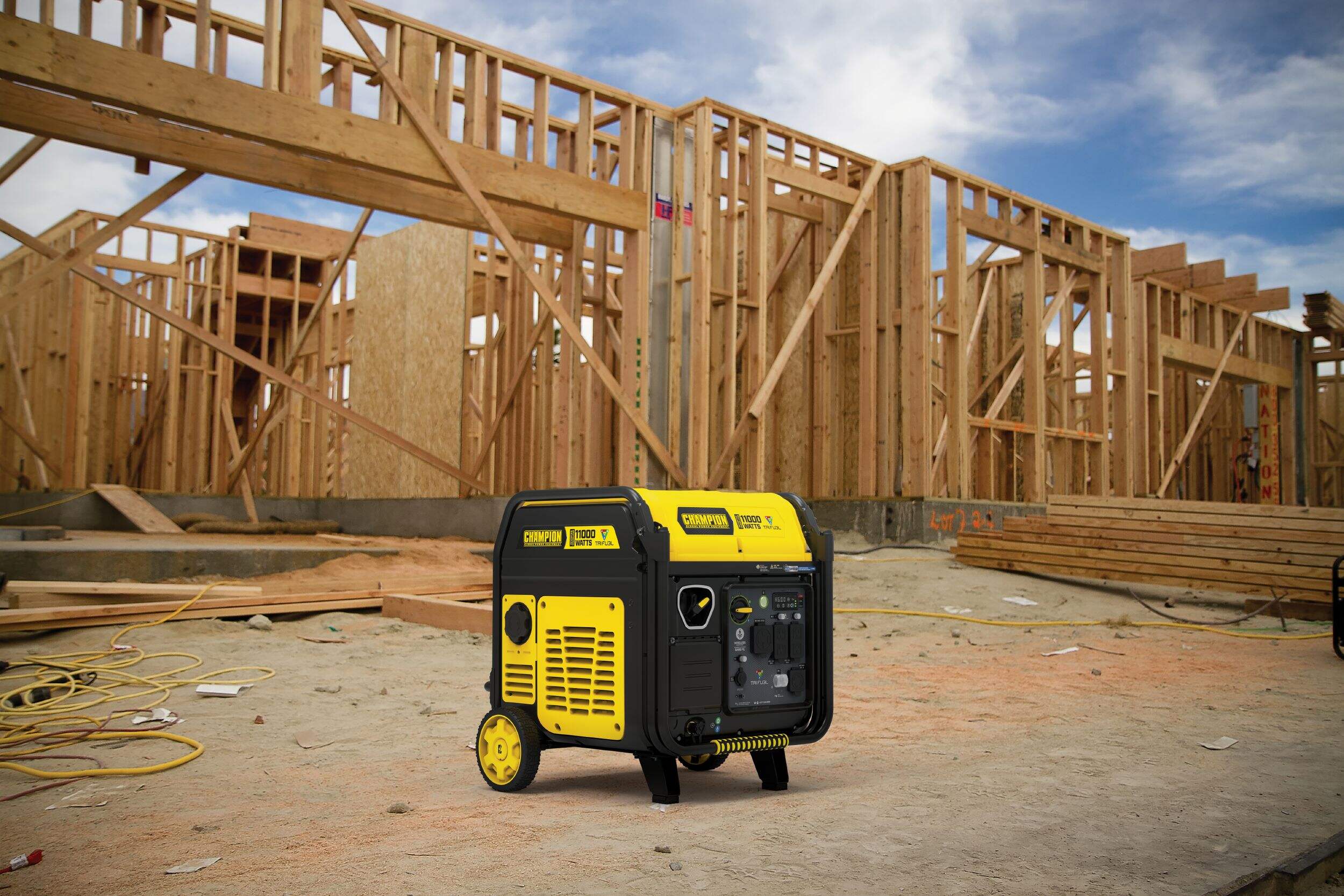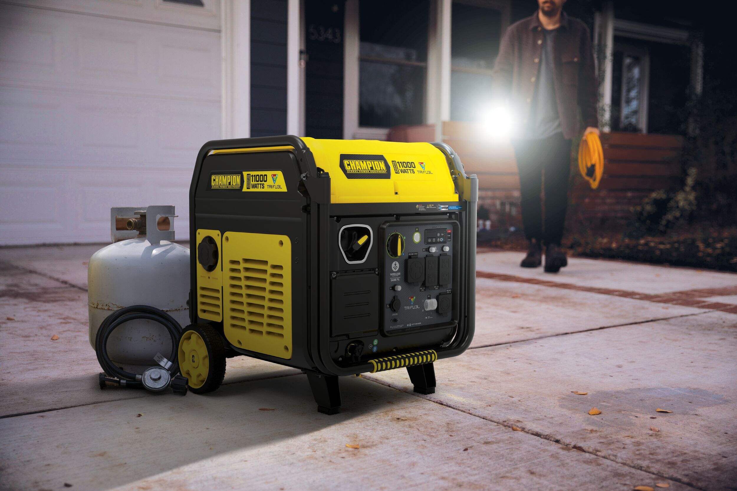 Introducing the Champion 11000W Tri-Fuel Portable Inverter Generator, the ultimate solution for all your power needs. Whether you're powering outdoor tools or keeping your home running during an outage, this generator offers the flexibility to operate on gasoline, natural gas, or propane. With remote start capability for convenience and safety, it delivers 11,000 starting watts and 9,000 running watts. Enjoy up to 15 hours of continuous operation on a full tank of gasoline, all while operating quietly at 64 dBA from 7 meters—making it ideal for residential areas or campsites. Equipped with multiple outlets, it ensures compatibility with a wide range of devices and appliances. Perfect for homeowners seeking a reliable and versatile power source, the Champion Tri-Fuel Portable Generator adapts effortlessly to your diverse power needs.
