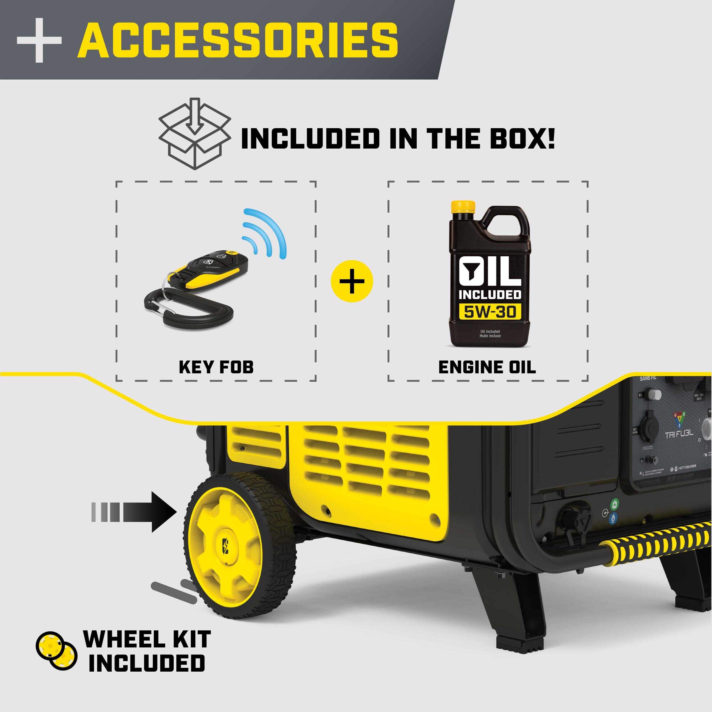 Accessories include: engine oil, remote key fob, LPG hose with regulator, 25' (7.6 m) natural gas hose and adapter, oil funnel, spark plug wrench, Allen wrench/Phillips screwdriver, wheel kit, and battery