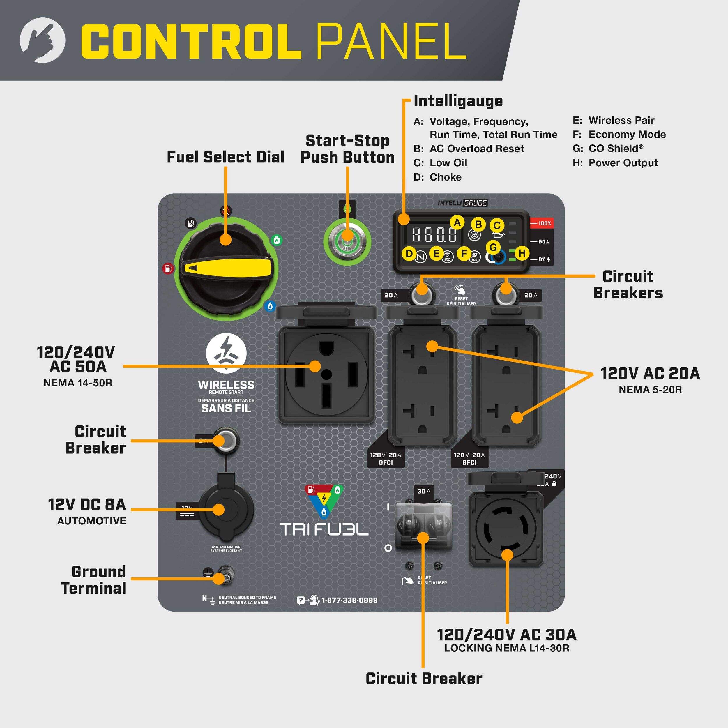 Features two 120V 20A GFCI household duplex outlets, a 120/240V 30A locking outlet, a 120/240V 37.5A outlet, and a 12V automotive-style outlet to provide flexibility in connecting to a variety of devices and appliances
