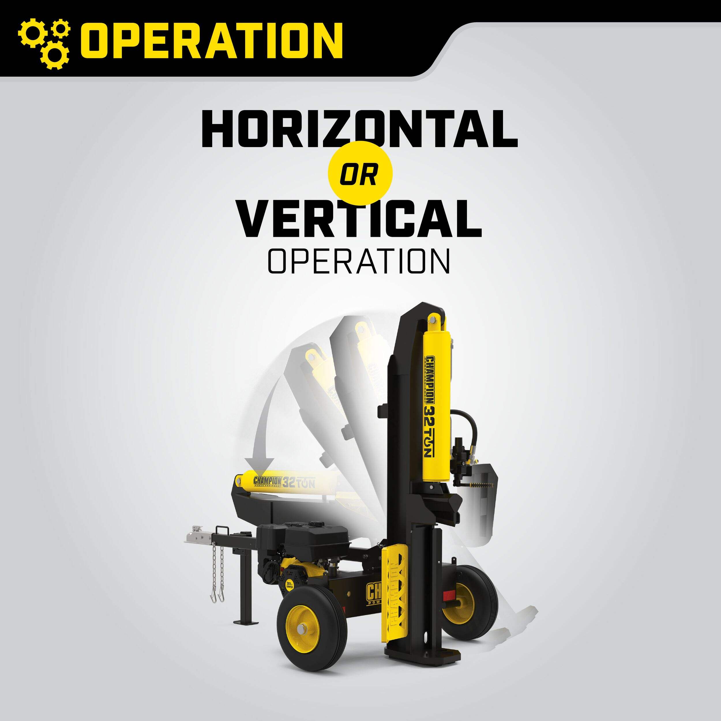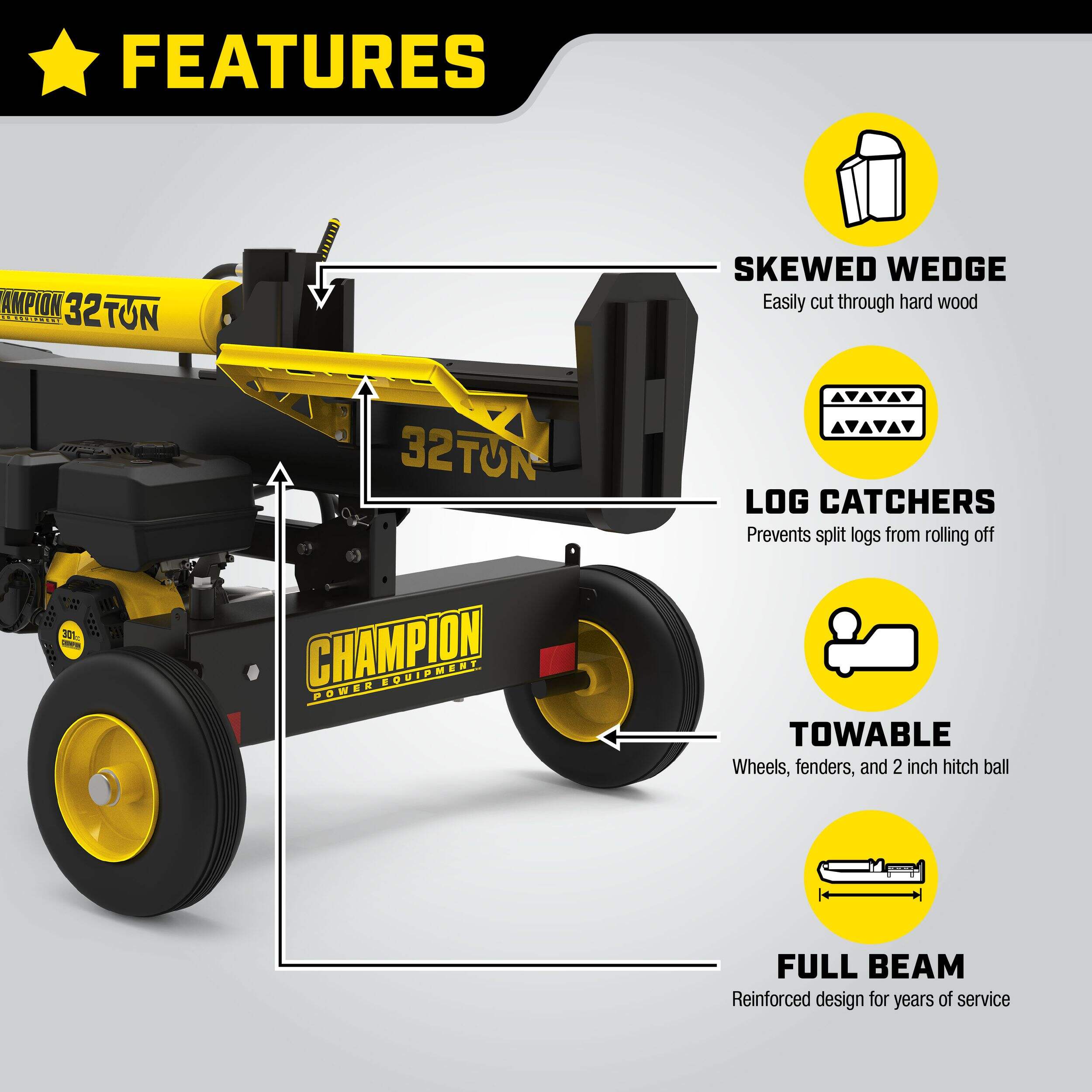 The Champion Power Equipment 301cc Full Beam Log Splitter packs robust splitting power and versatile operation. The powerful 301cc Champion engine provides 32 tons of force to easily split logs up to 24-in long. The large log catcher protects the engine from debris and wood and quickly transforms between horizontal and vertical splitting orientations.