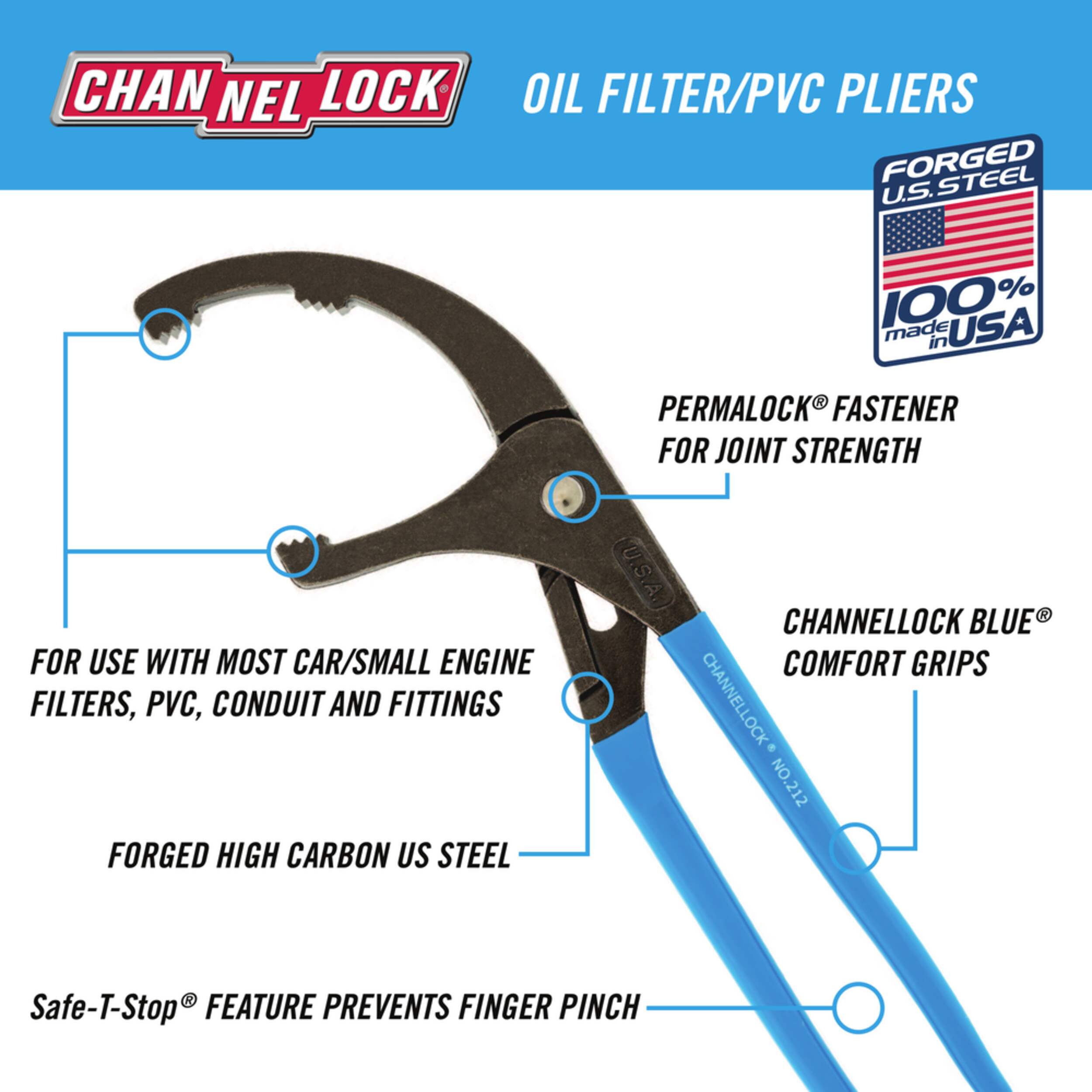 CHANNELLOCK® 212 Oil Filter/PVC Pliers combine the strength and reliability of the brand's iconic Tongue & Groove Pliers with the special needs of PVC and oil filters. The 212 has a jaw capacity of 2-1/2-in to 3-3/4-in and removes stubborn oil filters from cars, trucks, motorcycles, ATVs and lawn and garden equipment. This mechanic's oil filter wrench is made in the USA and forged from high carbon steel with a rust-resistant coating.