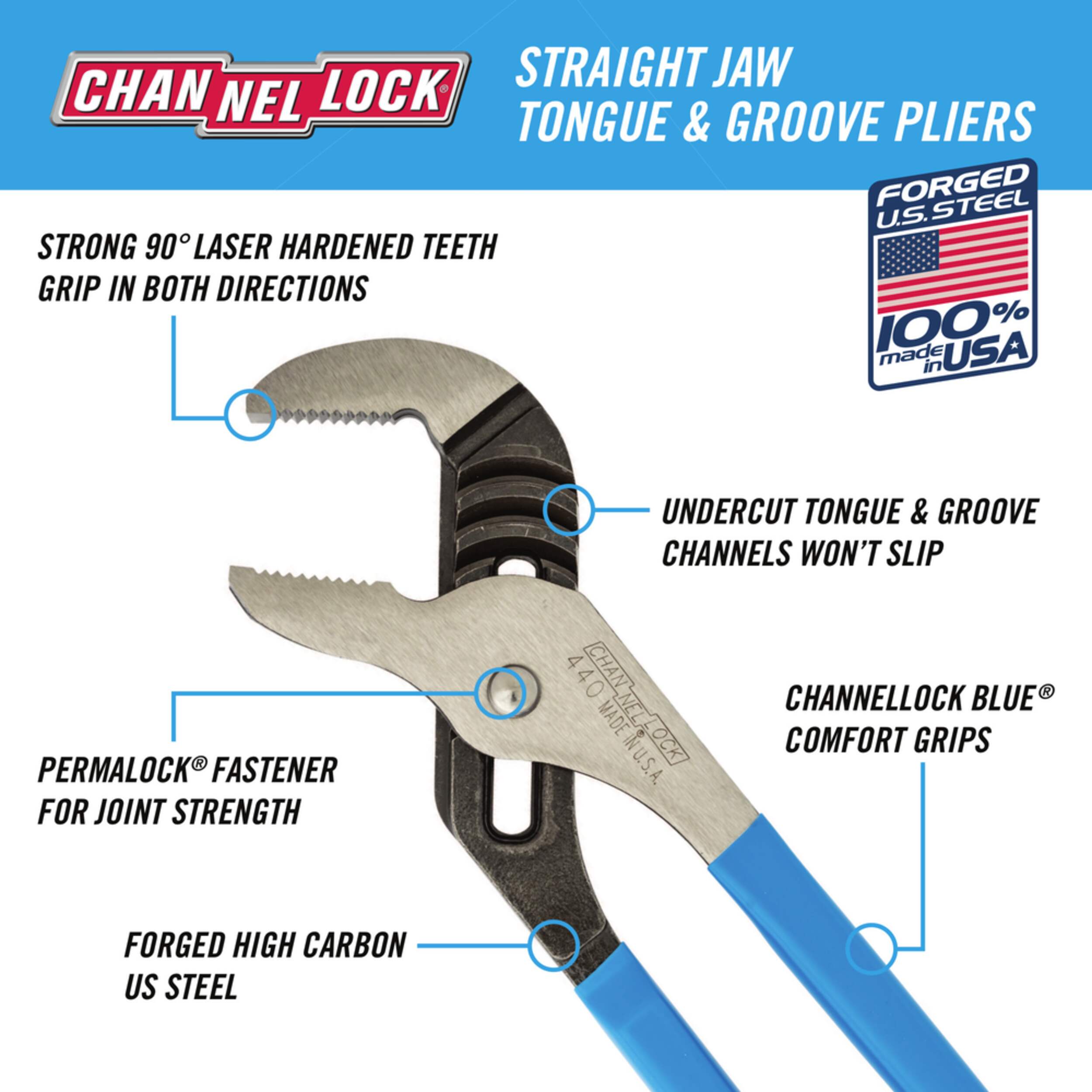 Essential for the home and garage toolbox, the CHANNELLOCK® Straight Jaw Tongue & Groove Pliers are endlessly versatile and built to last. The pliers feature a PERMALOCK® fastener to eliminate nut and bolt failure, a patented reinforcing edge to minimize stress breakage and laser-hardened teeth. These all-purpose workshop pliers take on challenging repairs and seized-on fasteners with a comfort grip and the relentless strength of carbon steel.