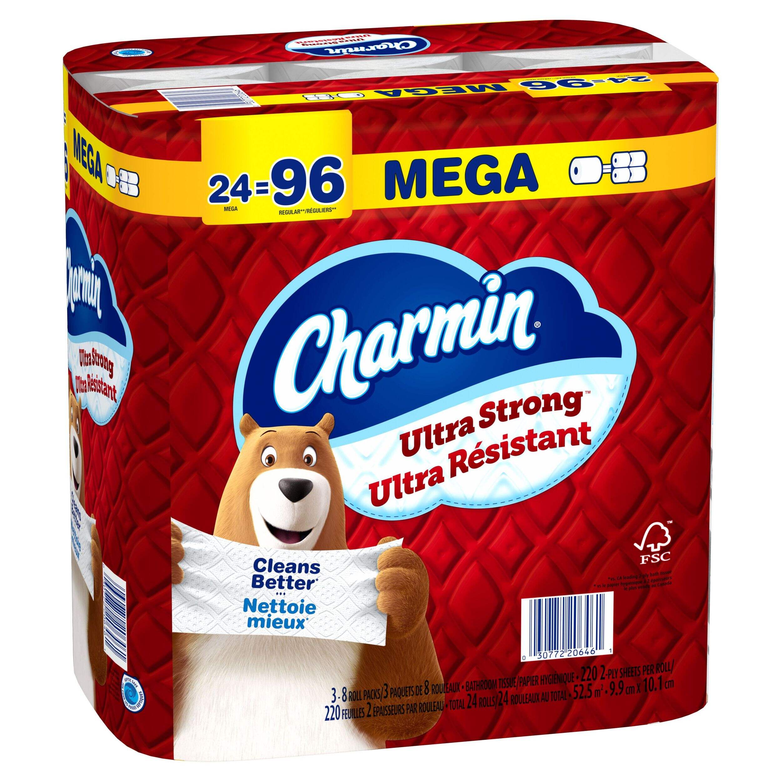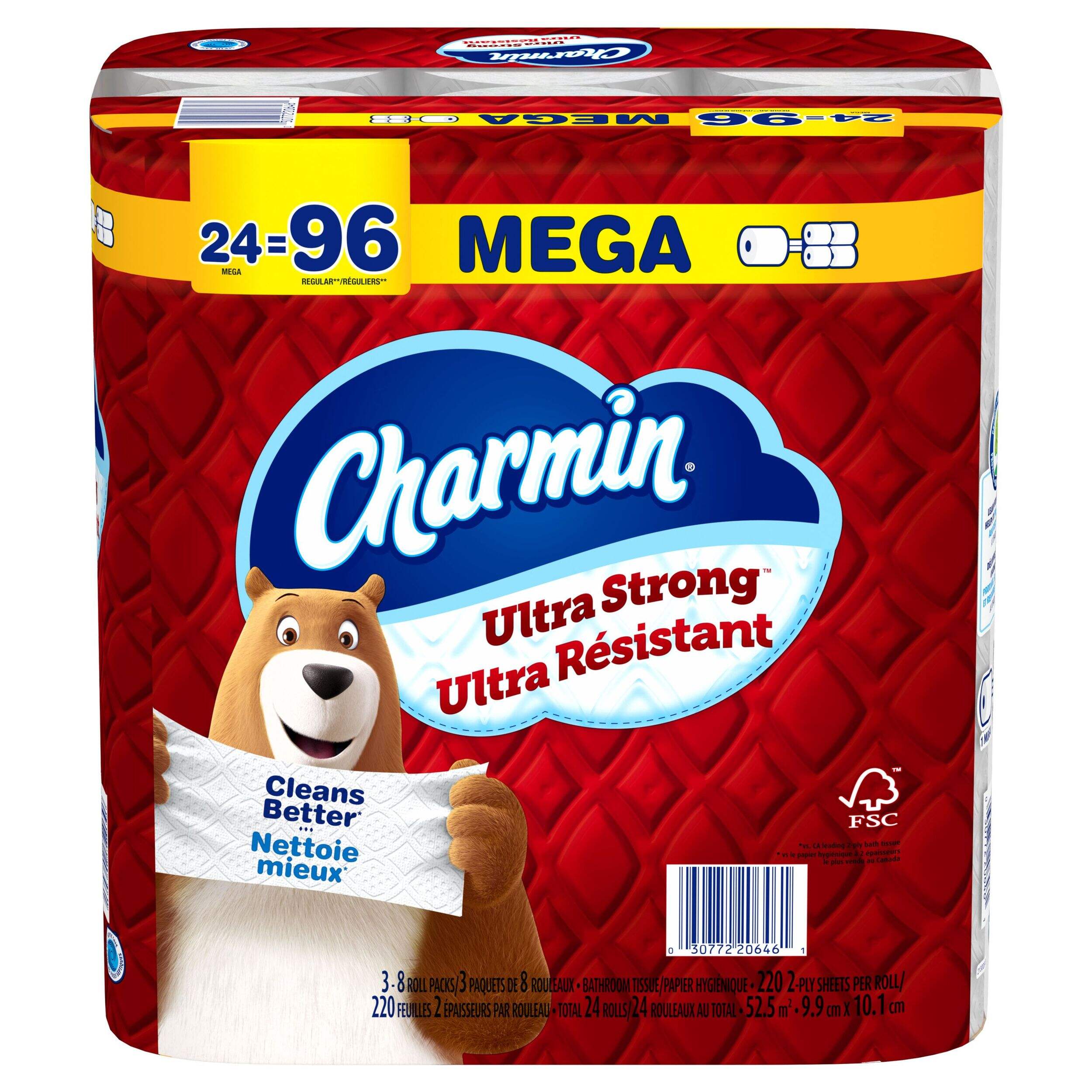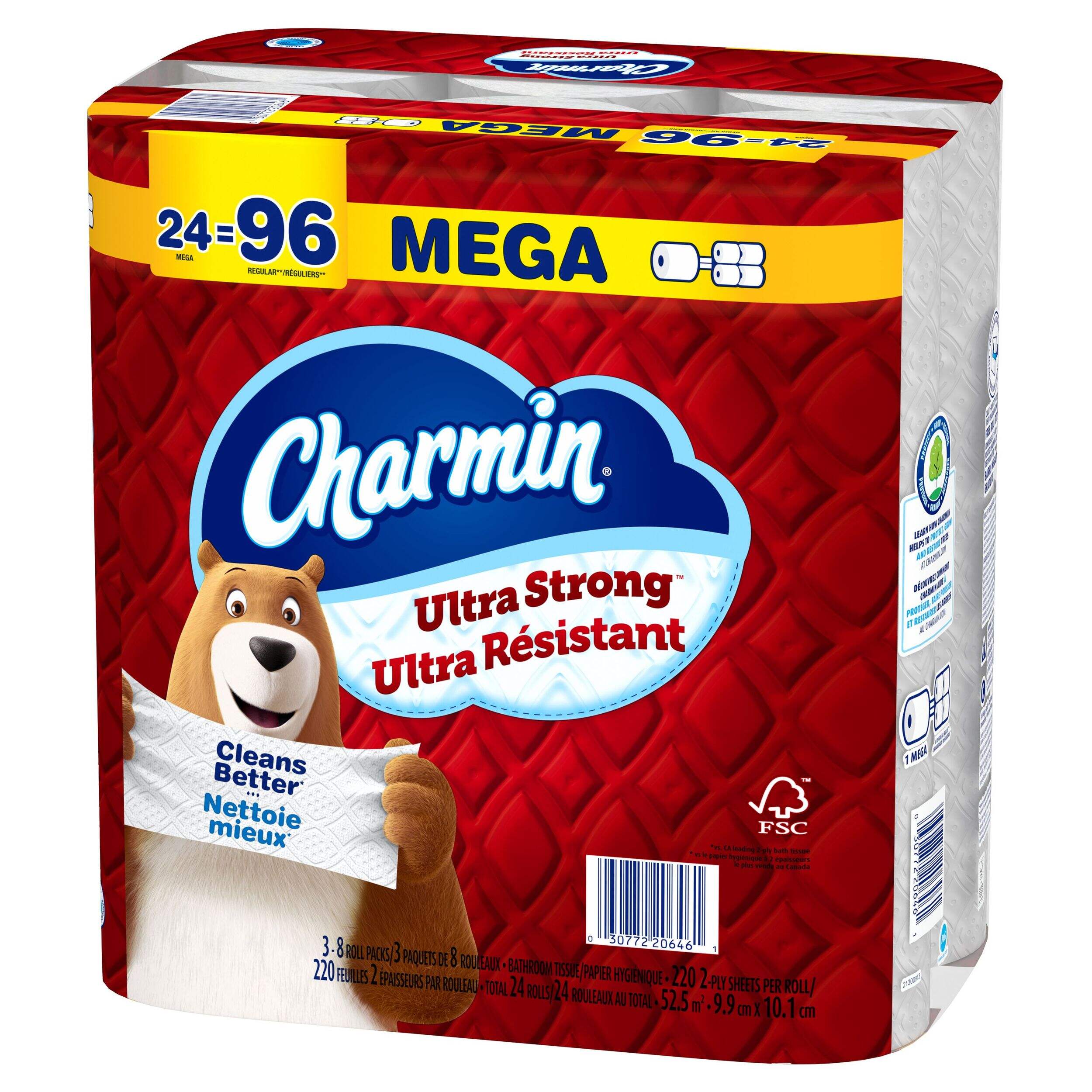 Pack contains 24 Mega Rolls (242 Sheets Per Roll) of Charmin Ultra Strong Toilet Paper