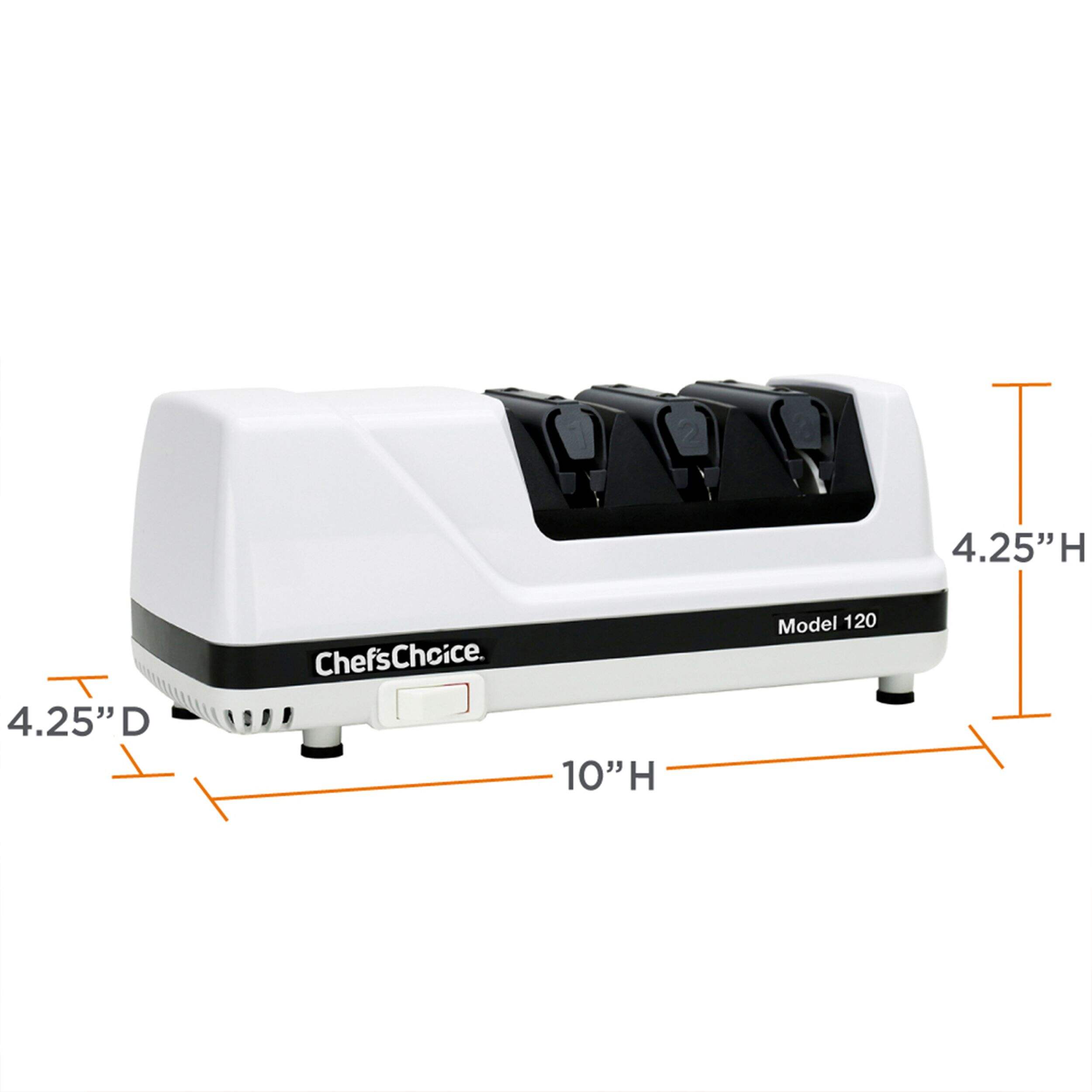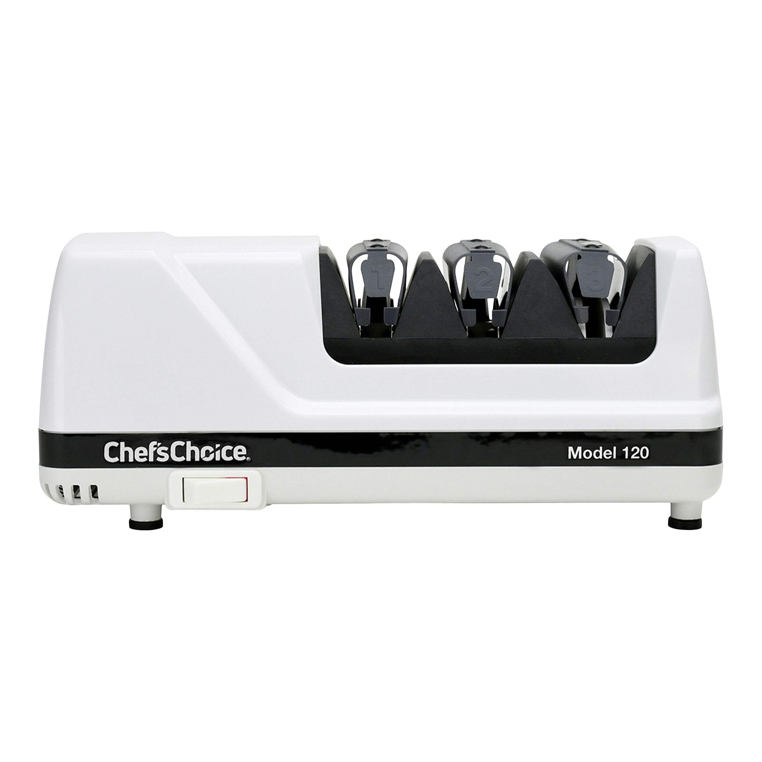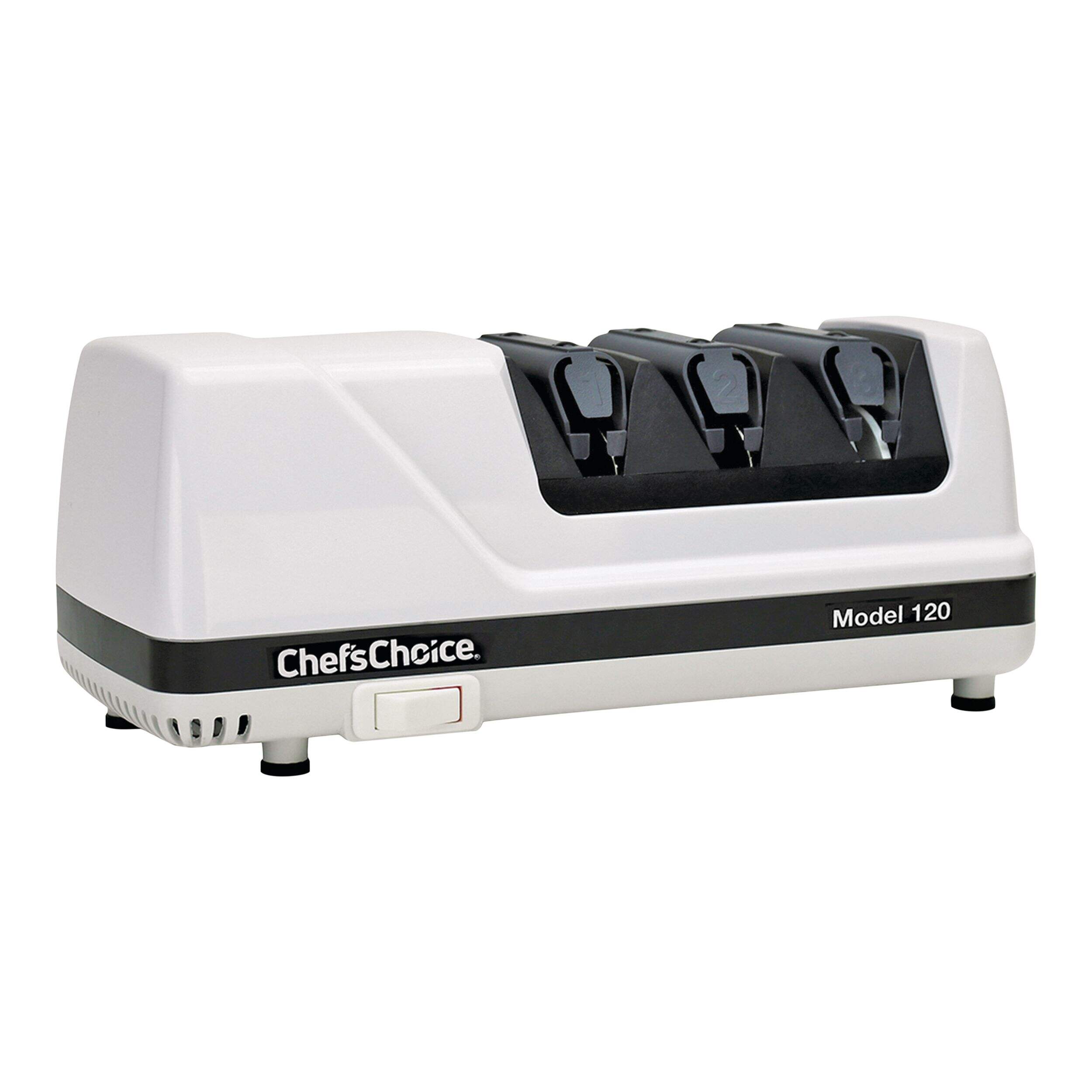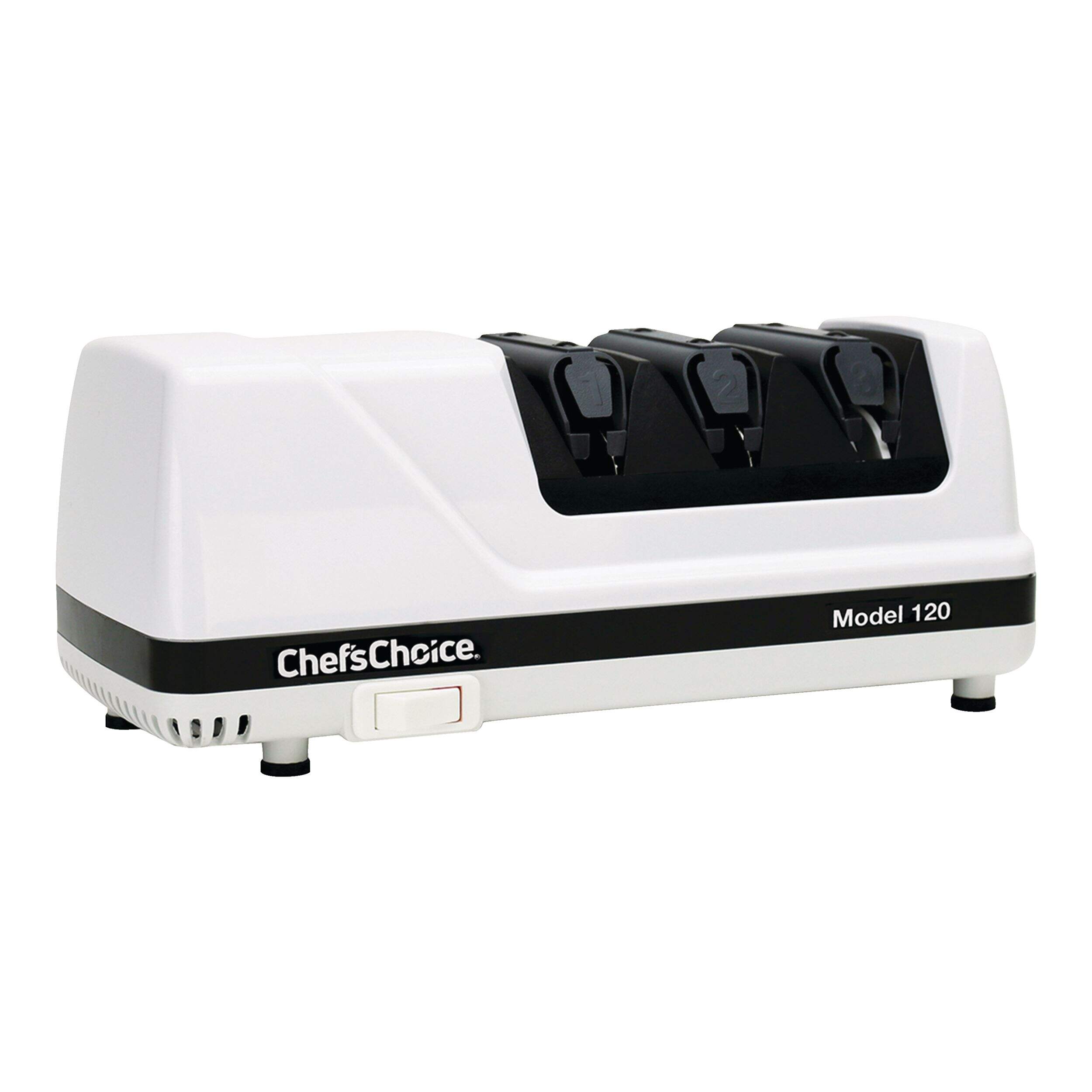 The Chef's Choice Model 120 Professional 3-Stage Electric Knife Sharpener provides expert sharpening results for straight and serrated knives. With a 3-stage system, this sharpener offers precision edge-sharpening, honing, and polishing to achieve a razor-sharp finish. The 100% diamond abrasives ensure effective sharpening without damaging the blade, while the unique guides maintain the ideal angle for consistent results.