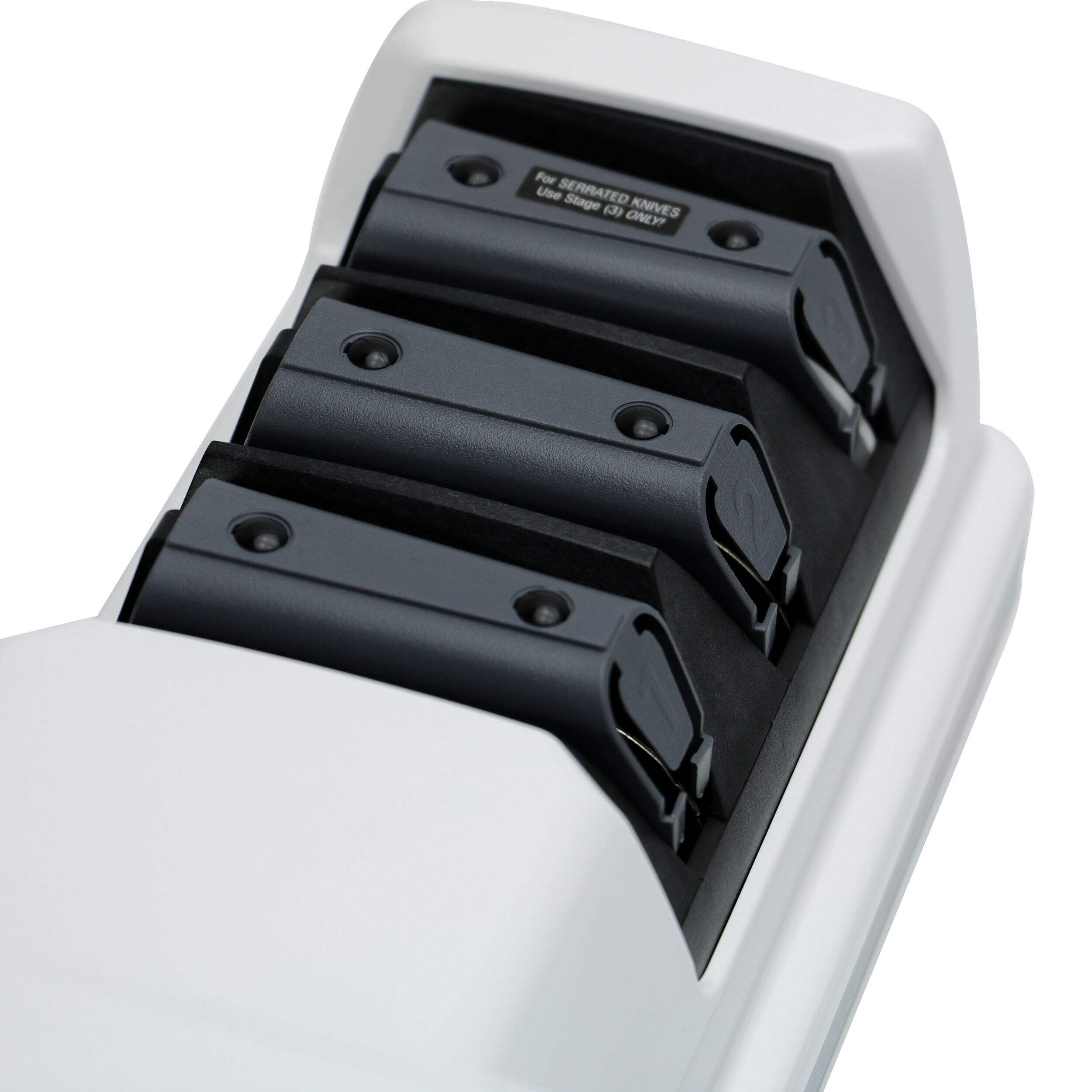 Second stage uses medium abrasives to sharpen the knife edge