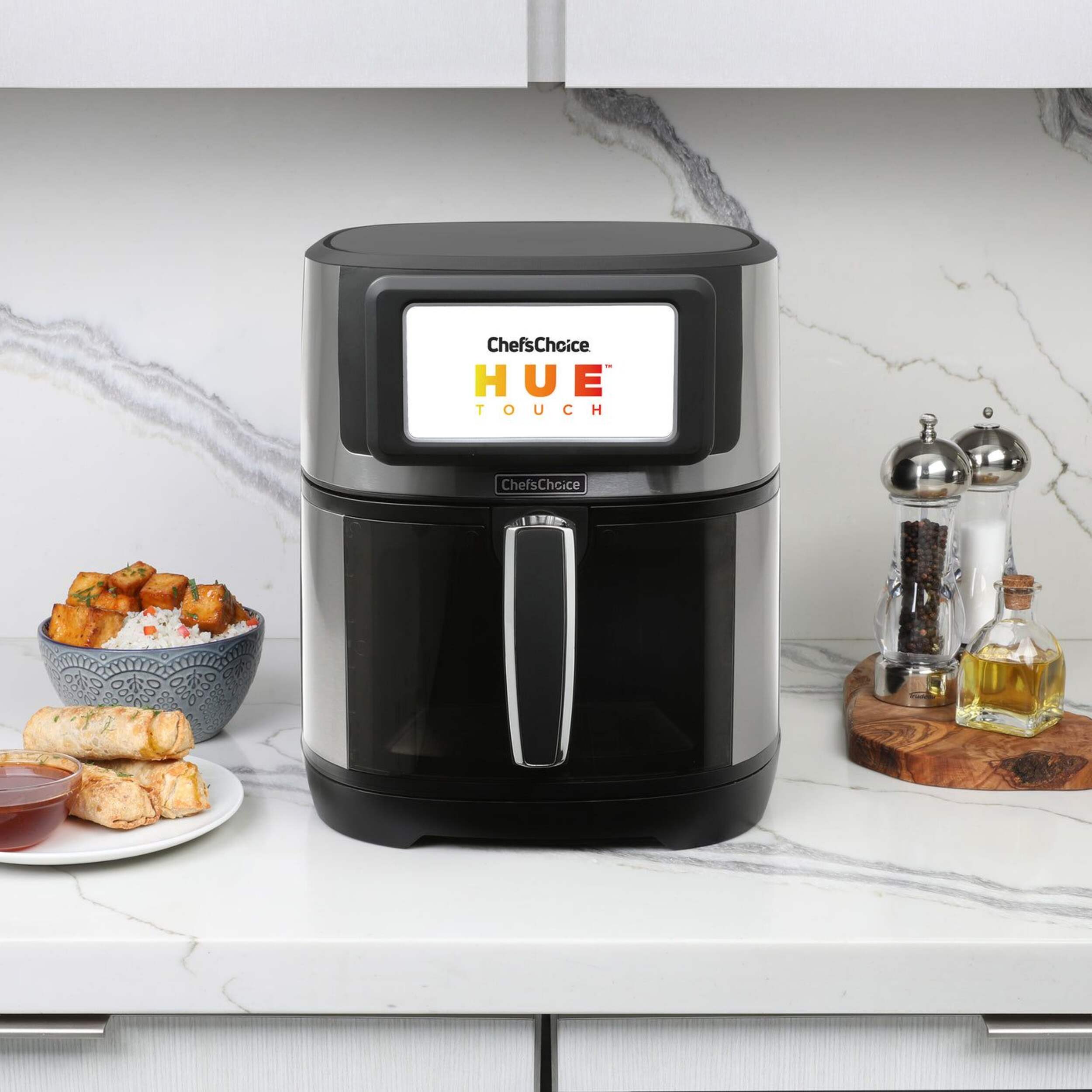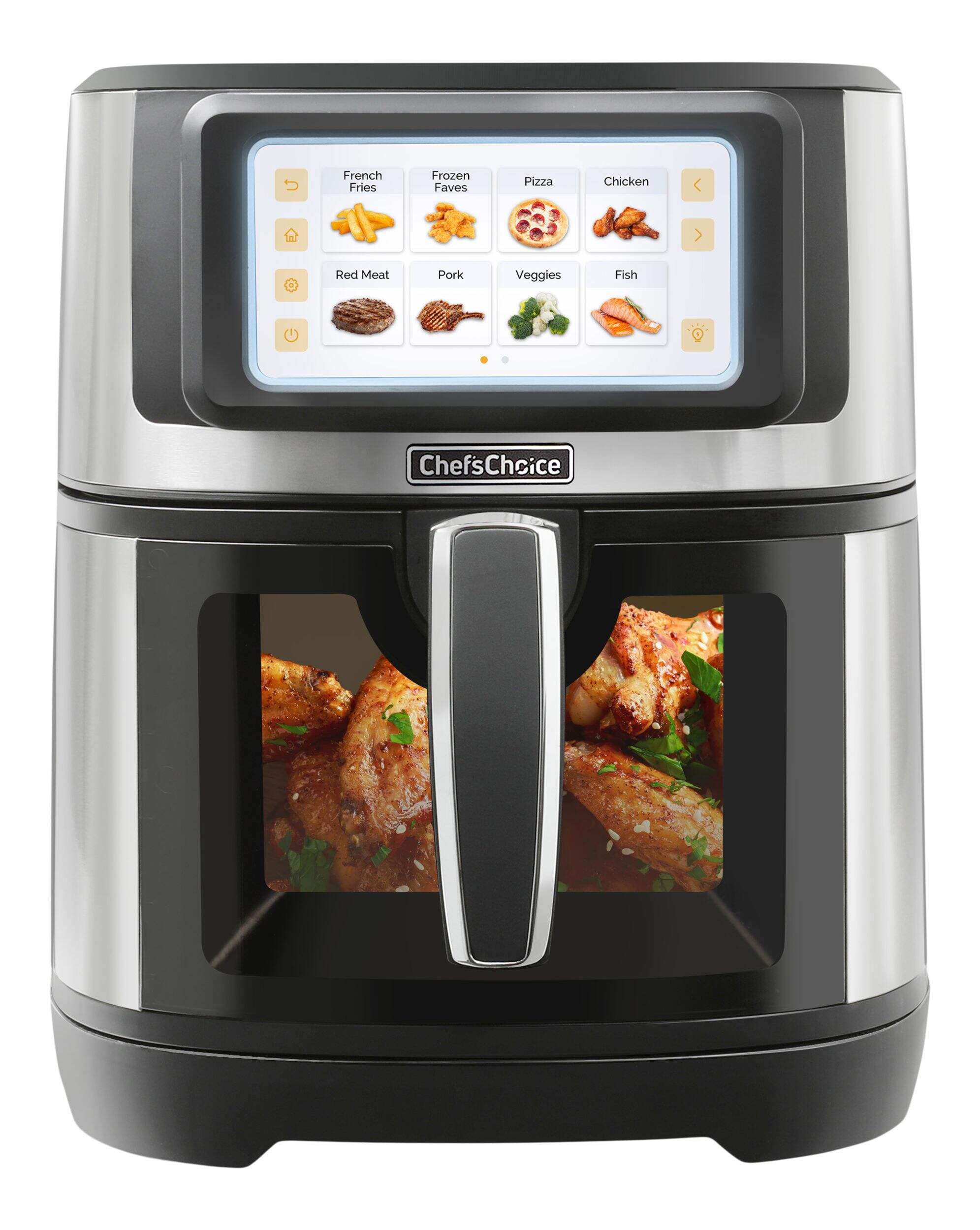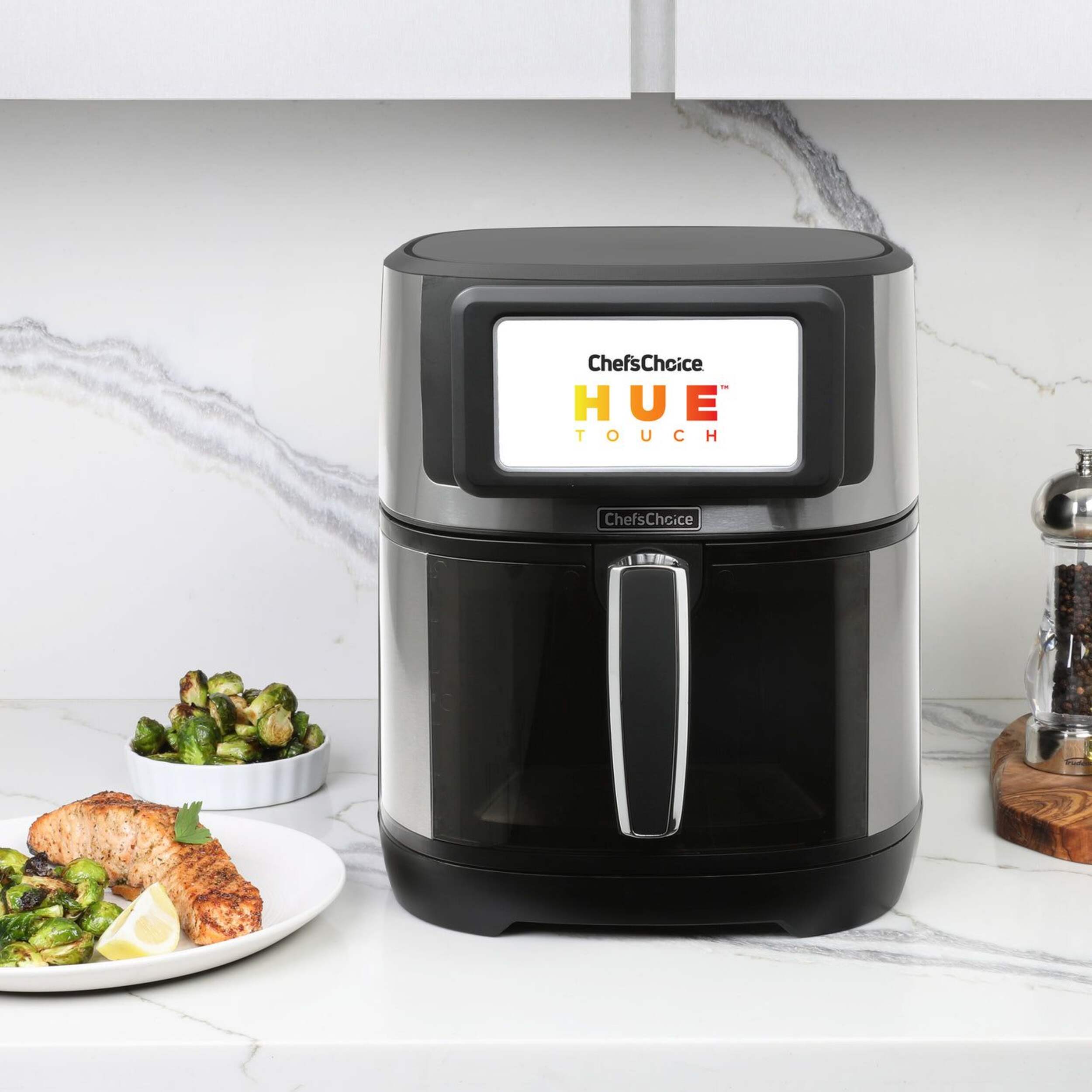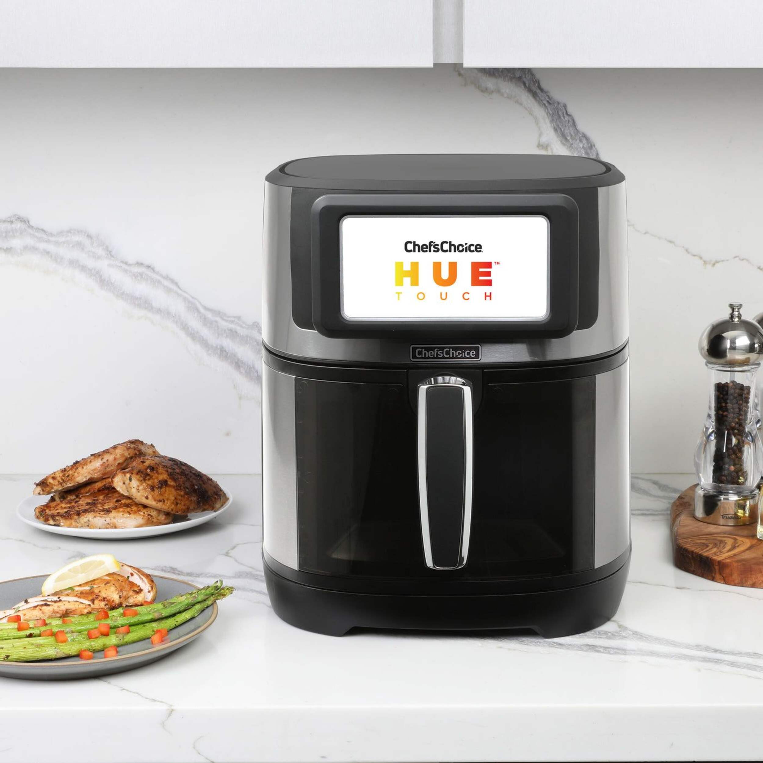 Get inspired to cook more than just fries and chicken with the Chefs Choice Hue Touch 7 Quart Touchscreen Air Fryer. With this new air fryer, the culinary possibilities are endless. This product simplifies cooking while providing you with infinite options at your fingertip. Enjoy your favorites to the precise doneness and without the guilt. Don't limit your choice to just chicken; select your exact type for precision cooking. Whether you are in the mood for wings, breasts, thighs, tenders, drumstick or a half chicken, this unit allows you to choose the exact quantity or weight and adjusts time and temperature to ensure your food is cooked to perfection. Expand on your potato option beyond fries, stretch your seafood choice and explore more vegan food option in the menu library. With over 200 presets across 12 food categories, creating your favorite meals is easier than ever.