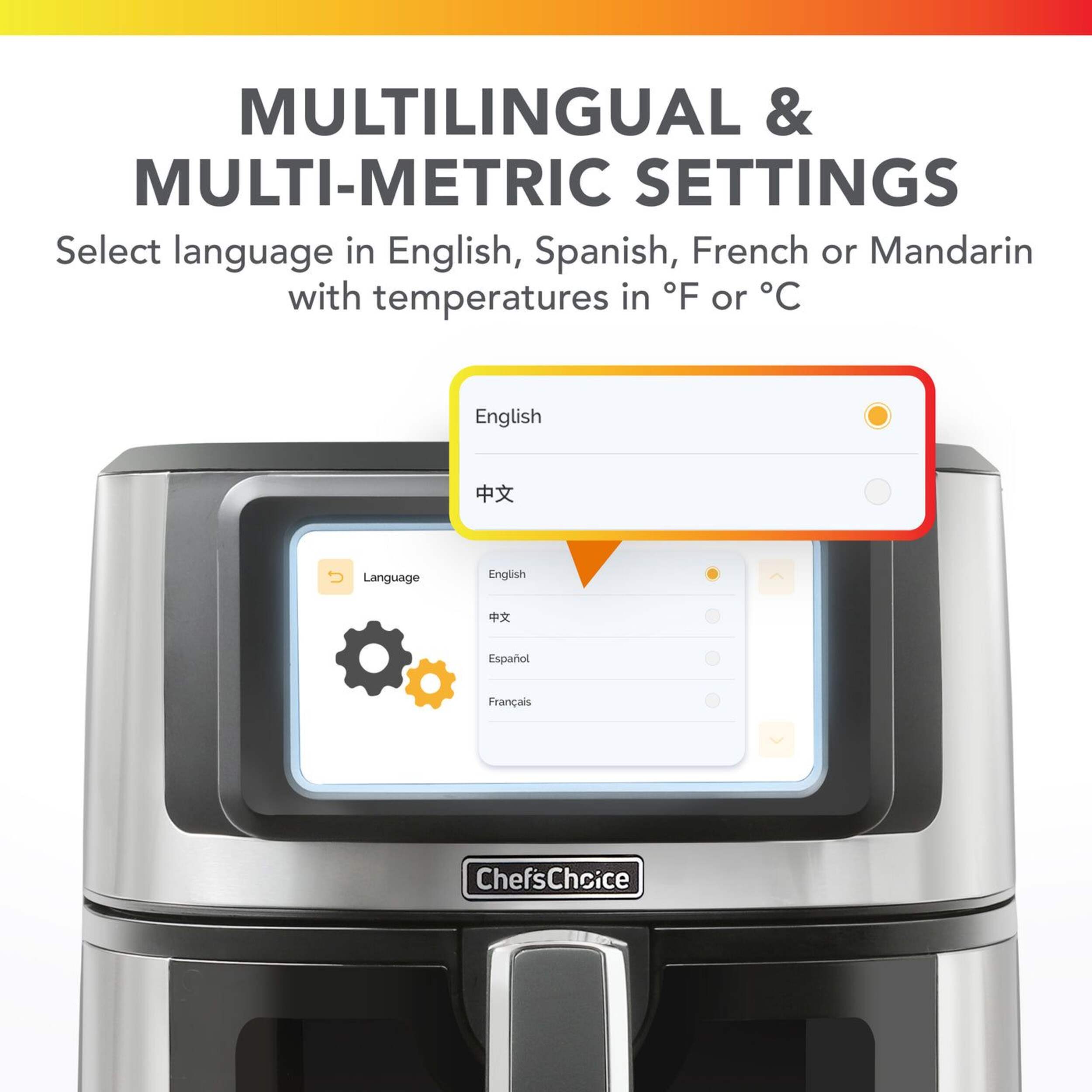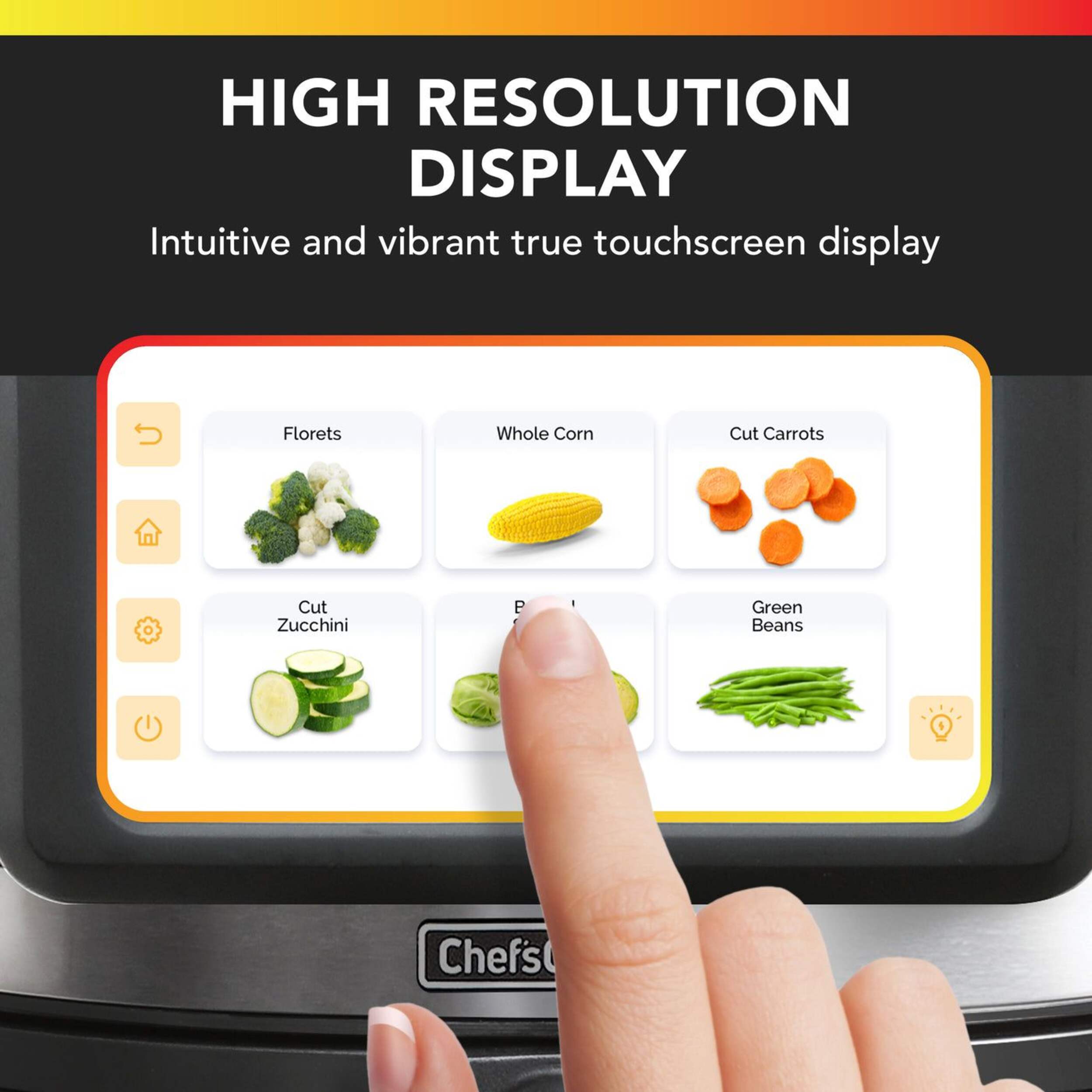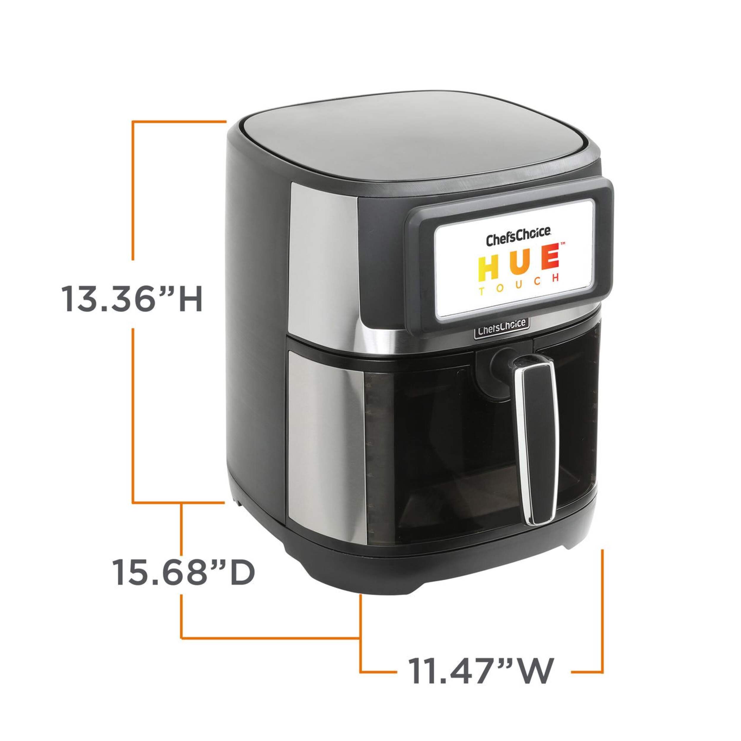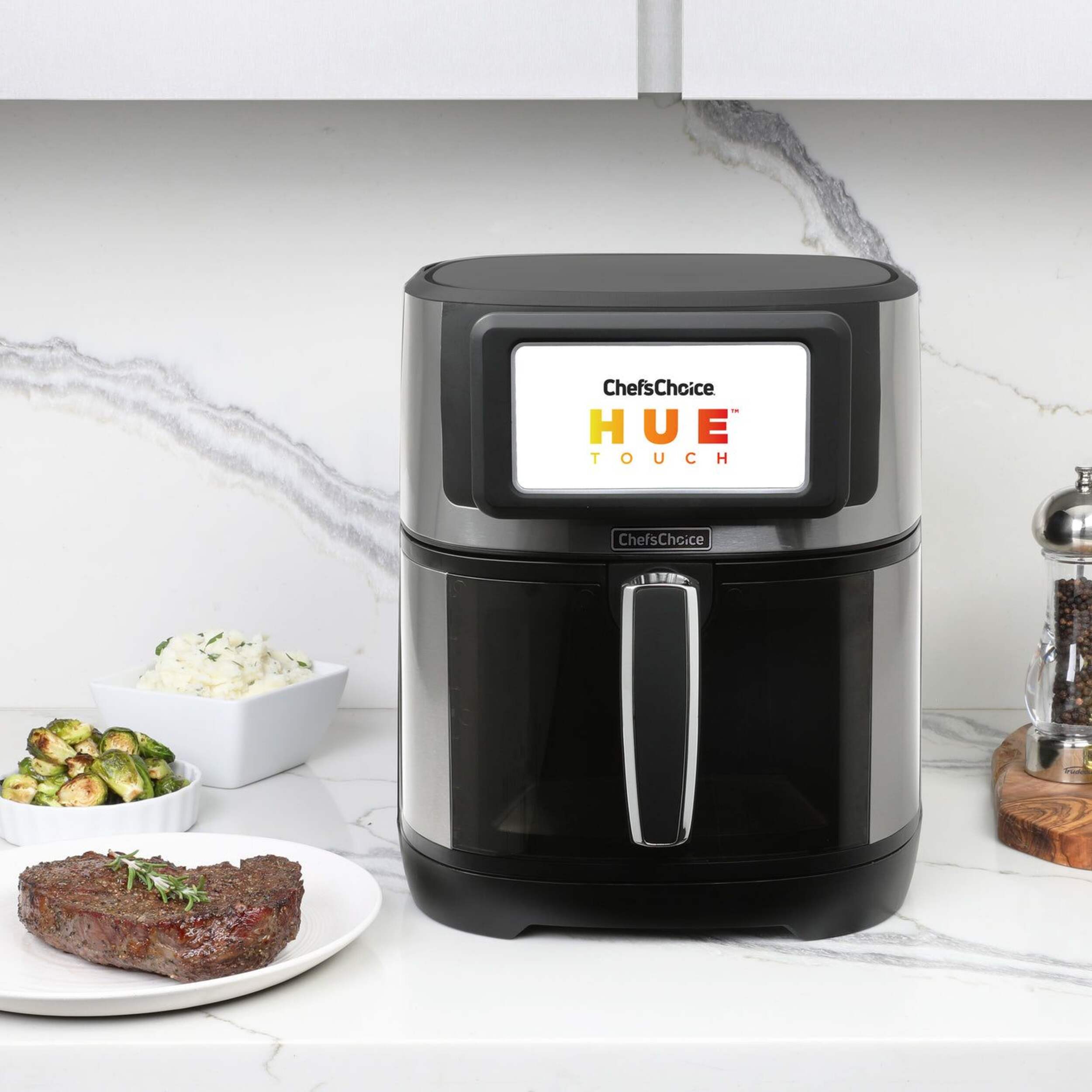 Get inspired to cook more than just fries and chicken with the Chefs Choice Hue Touch 7 Quart Touchscreen Air Fryer. With this new air fryer, the culinary possibilities are endless. This product simplifies cooking while providing you with infinite options at your fingertip. Enjoy your favorites to the precise doneness and without the guilt. Don't limit your choice to just chicken; select your exact type for precision cooking. Whether you are in the mood for wings, breasts, thighs, tenders, drumstick or a half chicken, this unit allows you to choose the exact quantity or weight and adjusts time and temperature to ensure your food is cooked to perfection. Expand on your potato option beyond fries, stretch your seafood choice and explore more vegan food option in the menu library. With over 200 presets across 12 food categories, creating your favorite meals is easier than ever.