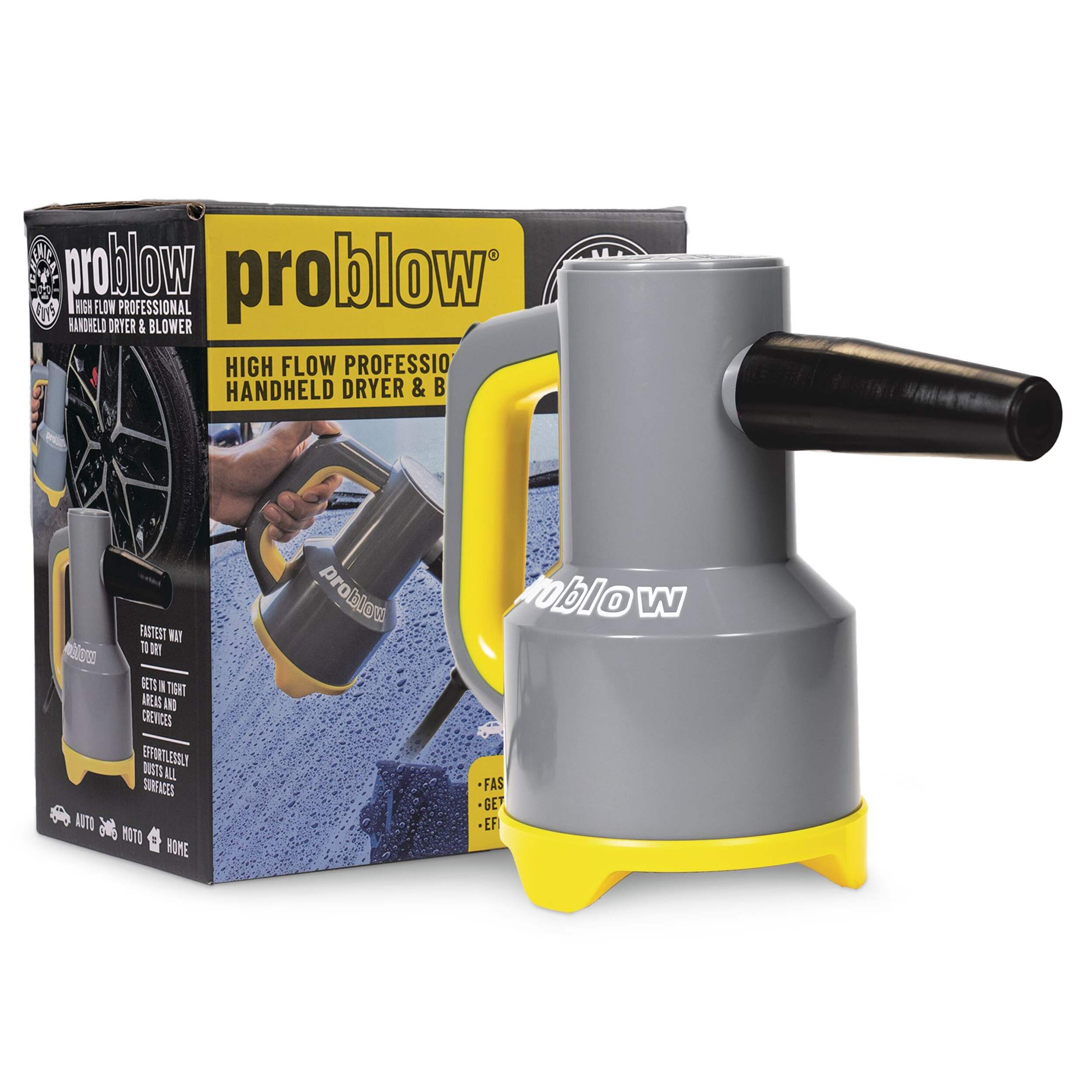 Chemical Guys ProBlow High Flow Professional Dryer & Blower provides powerful, touchless drying for vehicles, helping to prevent scratches and water spots. With a 1000-watt motor, it delivers a high-velocity stream of air that removes water from all surfaces, including hard-to-reach areas like mirrors and trim. Designed with a lightweight body, the ProBlow ensures efficient drying with its rubberized nozzle that's safe for use on paint and delicate surfaces.