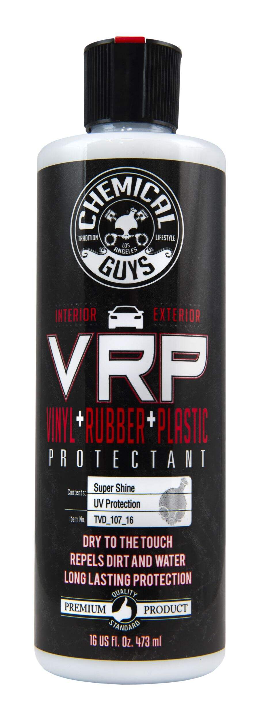 Chemical Guys VRP Super Shine Car Vinyl, Rubber & Plastic Protectant is an easy-to-use protectant that restores a deep black look, enhances shine, and protects vinyl, rubber, and plastic surfaces against harmful UV solar rays.