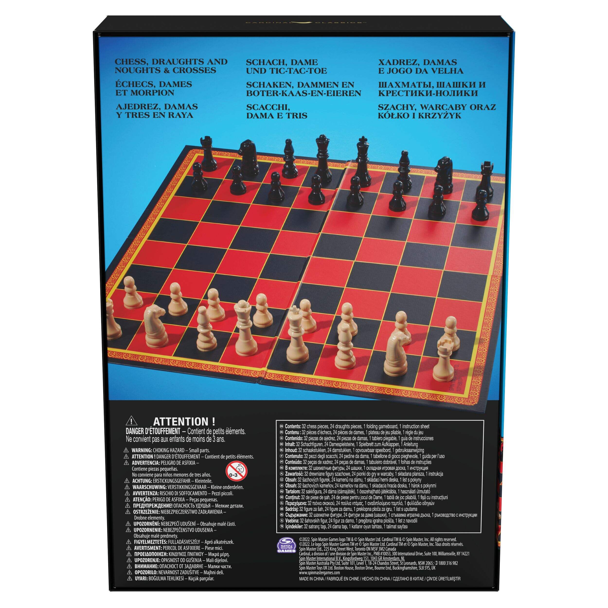 The Chess Checkers Tic Tac Toe 3-in-1 Board Game Set, Ages 6+, includes three classic games in one convenient package