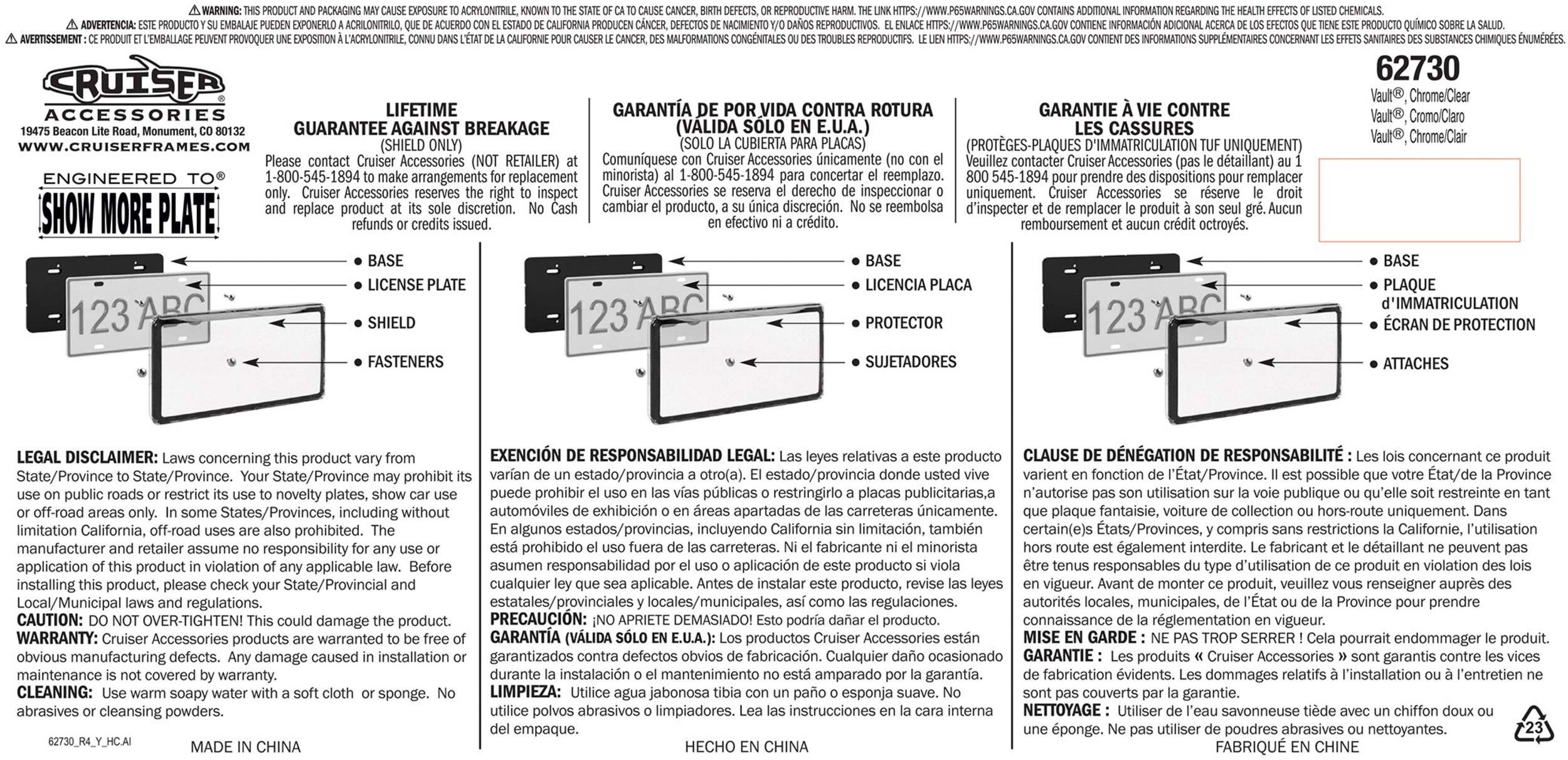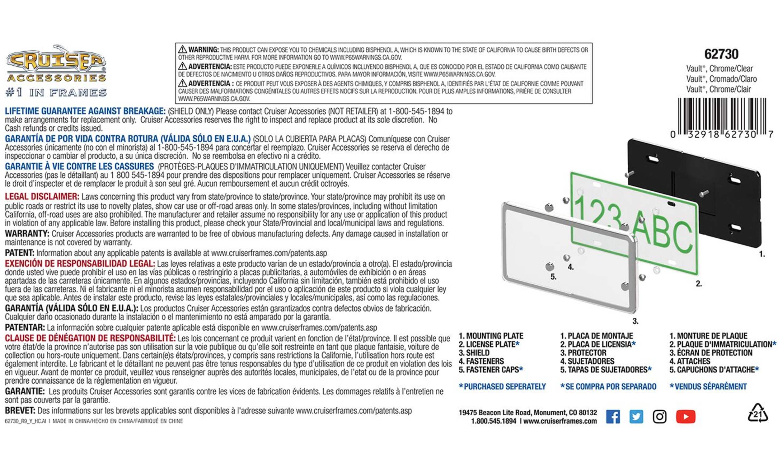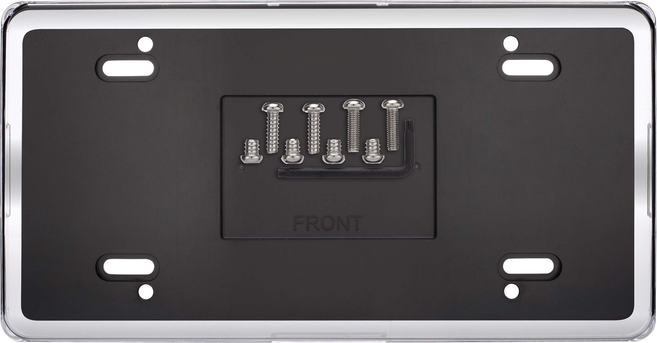 The Chrome Vault License Plate Frame with Clear Shield is designed to provide both security and style for your vehicle. Featuring a theft-deterrent mechanism and a clear protective shield, this frame ensures that your license plate remains safe from environmental damage and theft. The sleek chrome finish adds a polished, modern touch to your vehicle’s exterior. Ideal for vehicle displays and everyday use, it combines both functionality and aesthetic appeal.