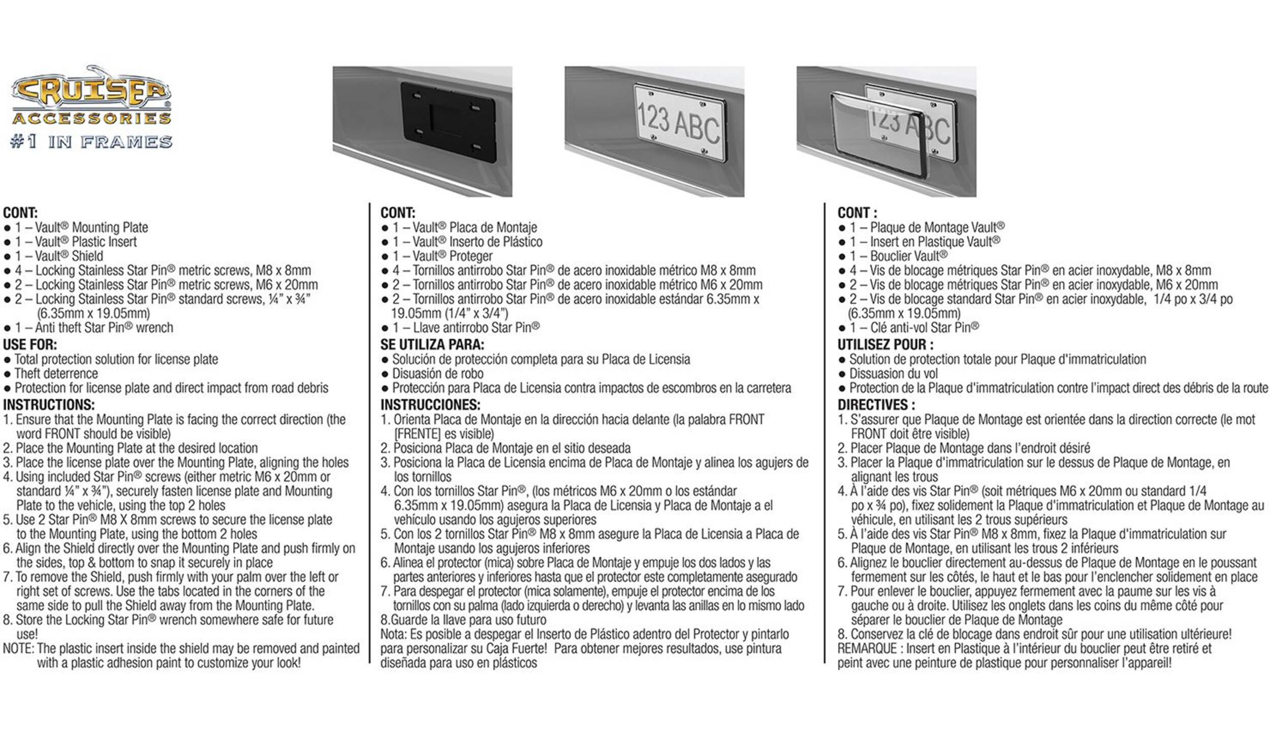Includes 1 mounting plate, 1 frame insert, 1 shield, 8 screws, 1 wrench