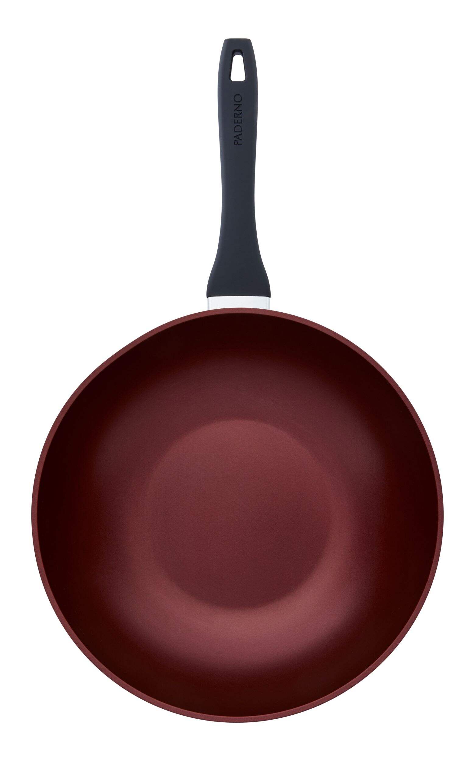 The PADERNO Classic Wok Stir Fry Pan is engineered for top-notch performance and versatility. This maroon wok boasts a PFOA-free non-stick surface that reduces the need for oil, and allows for easy food release and quick cleanup. The pan's heavy-duty, reinforced construction ensures even heat distribution and durability, while its stay-cool handle provides comfort and control for an enjoyable cooking experience.