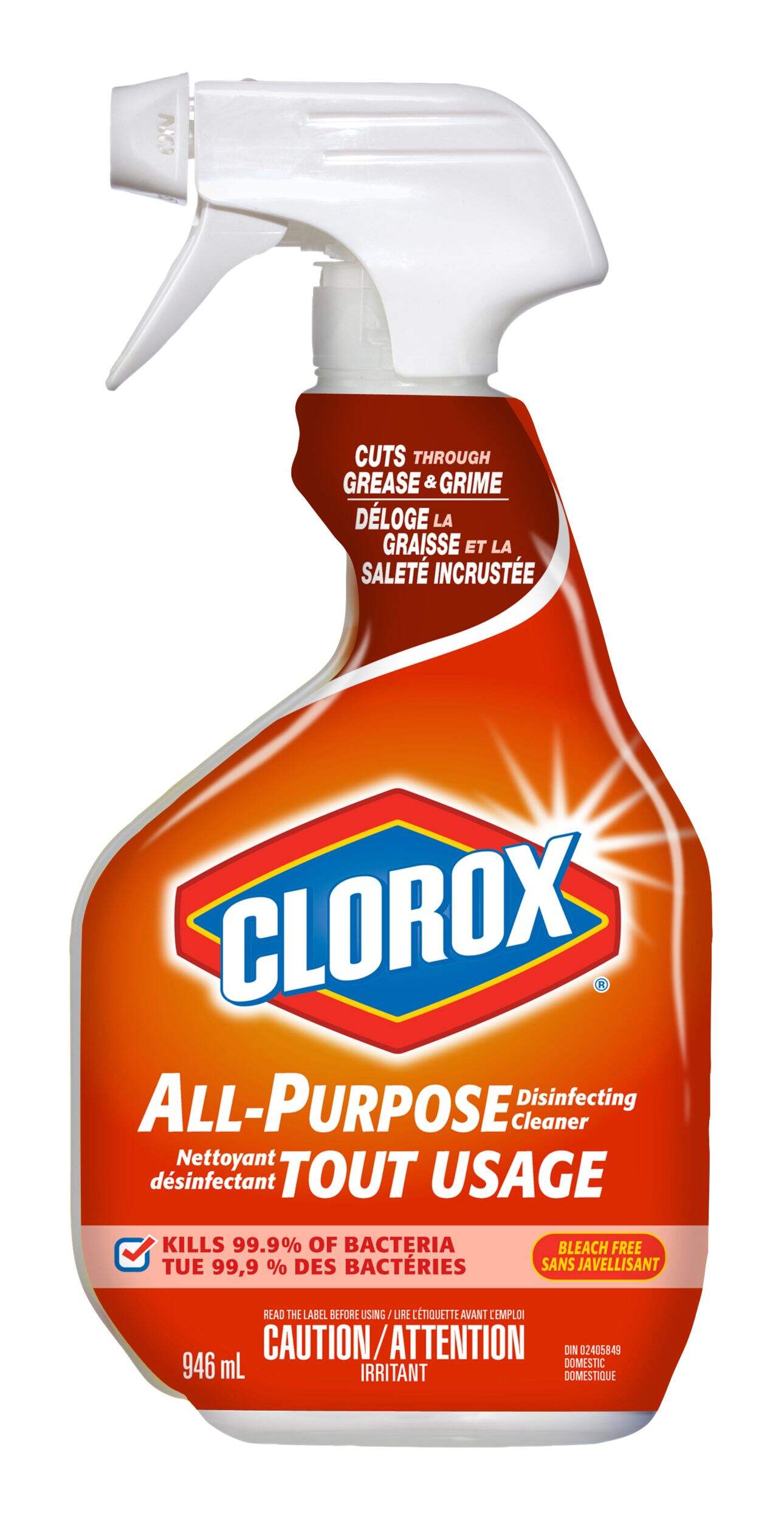 Clorox® All Purpose Disinfecting Cleaner is the ultimate cleaner, degreaser and disinfectant for your home. The antibacterial formula quickly cuts through grease and grime and disinfects as you wipe, killing 99. 9% of bacteria. It prevents dirt and soap scum build up, and deodorizes as you clean your kitchen and bathroom surfaces, leaving behind a fresh clean scent. This no bleach, nonabrasive, household cleaner works great on a wide range of hard nonporous surfaces including stovetops, sinks, countertops, microwave exteriors and more.