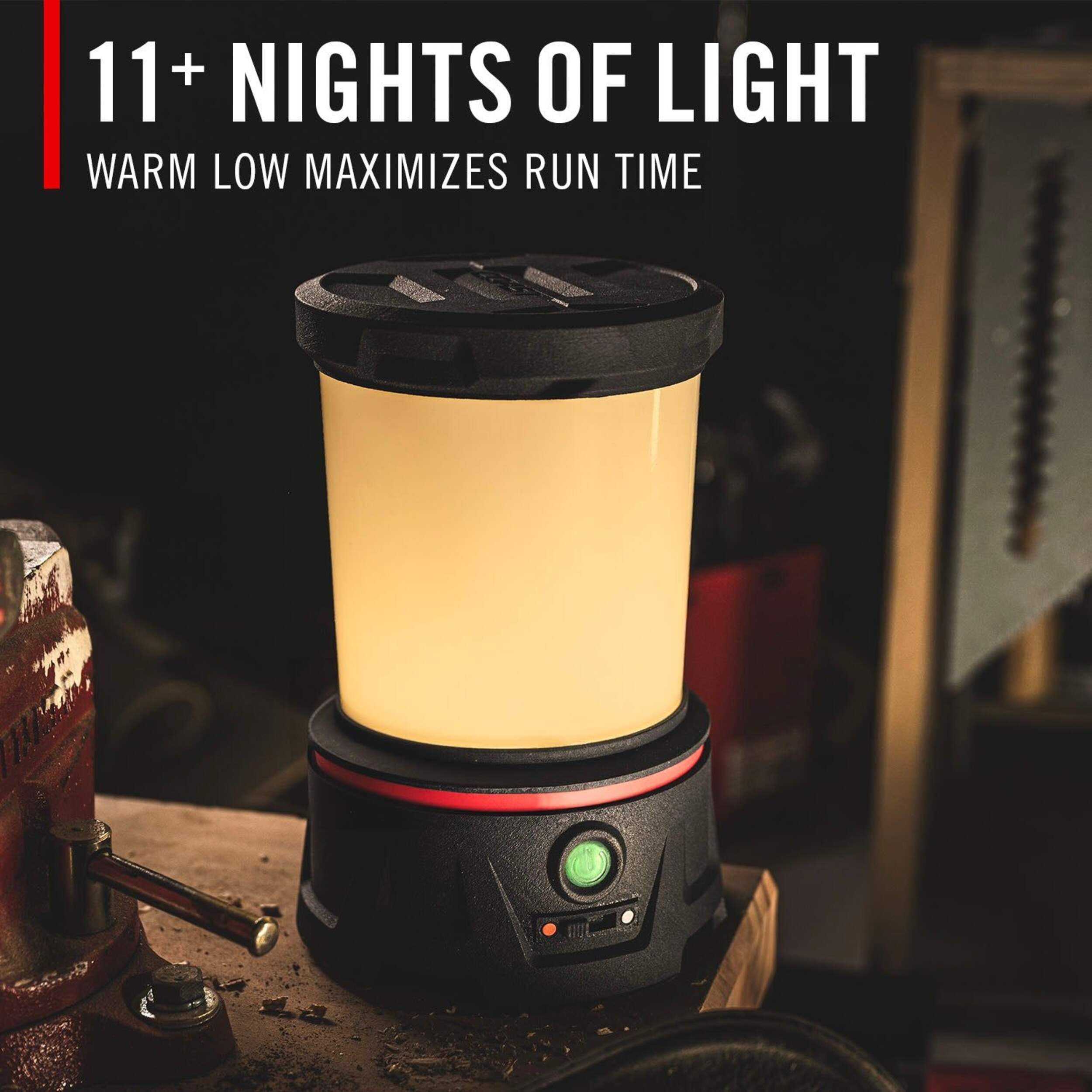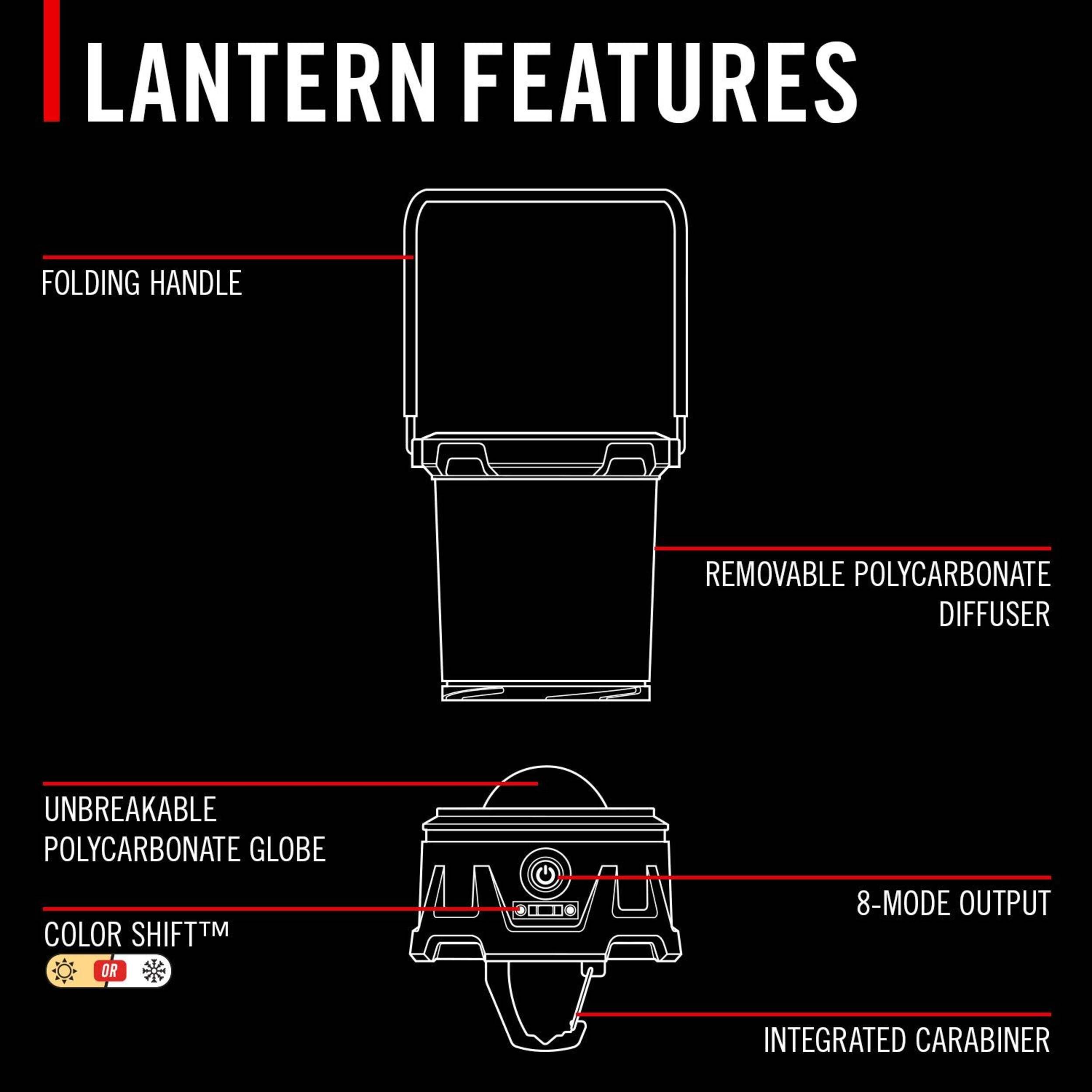 Light up the entire area. The innovative design of the EAL40R provides multiple ways to control its high-powered light. This lantern truly takes over the dark at its max brightness of 2500 lumens. Flip the colour Shift ™ zone selector switch to toggle between these options. Multiple light modes—warm low, warm medium, warm, cool low, cool medium, cool high, red, red flashing—provide an option for every scenario. Carry the EAL40R by the foldable handle just as you would a traditional lantern or hang it by the integrated carabiner located on the bottom of the lantern. The COAST Rechargeable Plus system runs the lantern on the included ZX740 ZITHION-X™ rechargeable battery, which recharges via a USB-C in/out port. The light can also run on six AA alkaline batteries (purchased separately).