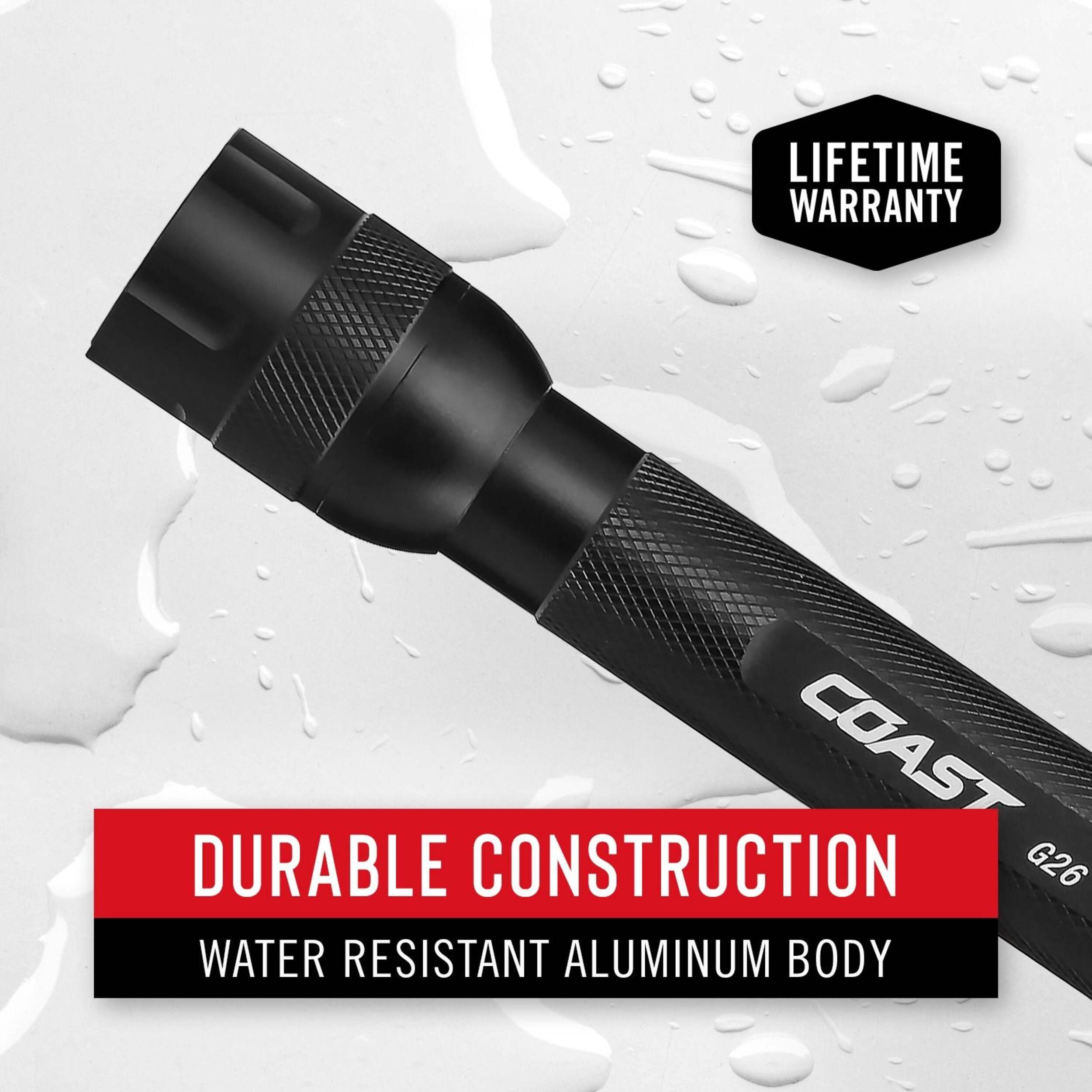 The Coast G26 LED Flashlight is perfect for the truck, kitchen drawer, or nightstand. The BULLS-EYE™ Spot Beam shines bright with a piercing center and surrounding halo of softer light for an expanded viewing area. Built from top-grade aluminum, this general-purpose flashlight is IP54 stormproof and dust resistant so that you are ready to go whenever life comes calling. Built with COAST Alkaline-Dual Power technology, the G26 flashlight is powered by two AA alkaline batteries and can also operate using a COAST ZITHION-X™ rechargeable battery (sold separately) for added convenience.