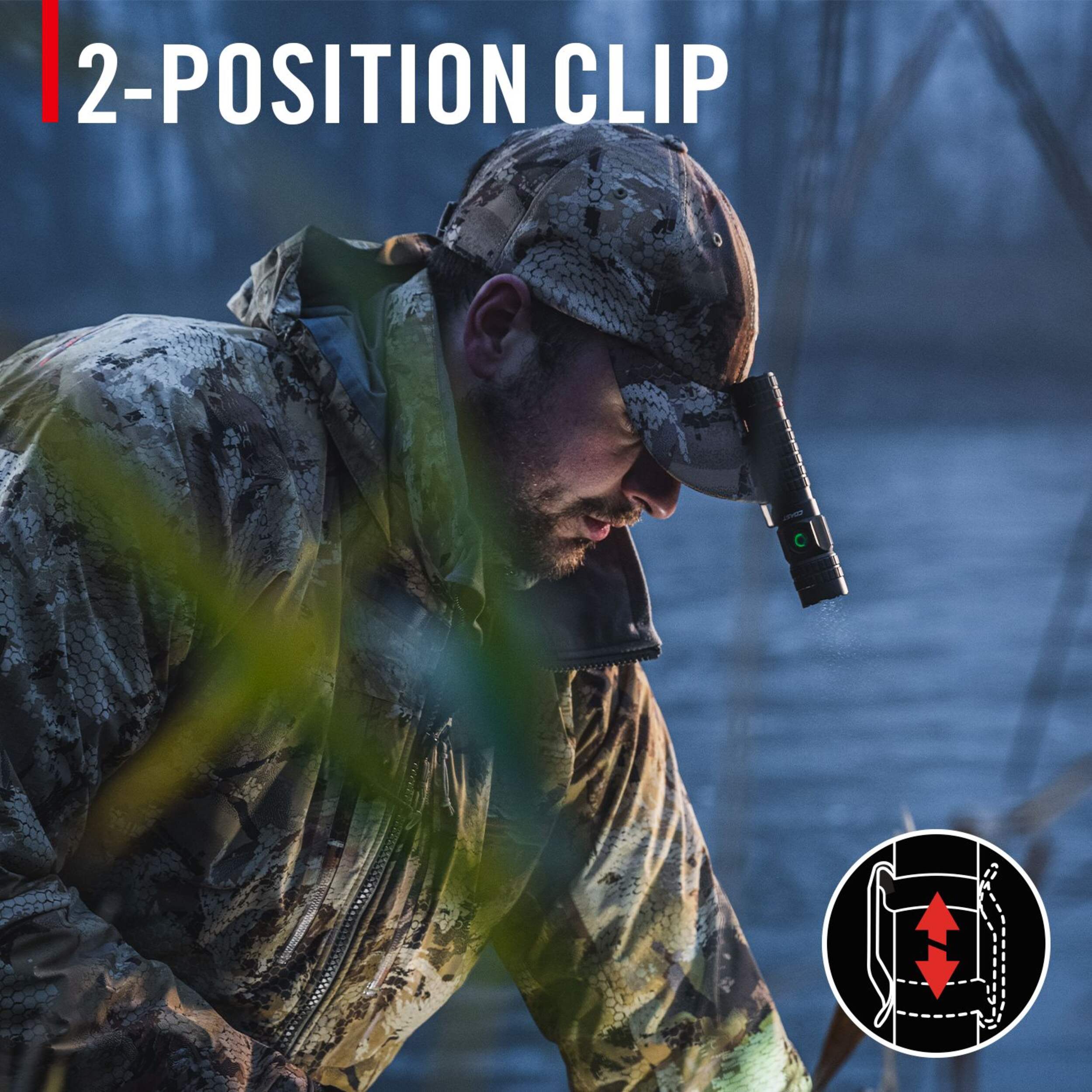 The light is secured by a durable two-way pocket clip that also doubles as a hands-free mount—perfect for attaching to the bill of a hat or gear