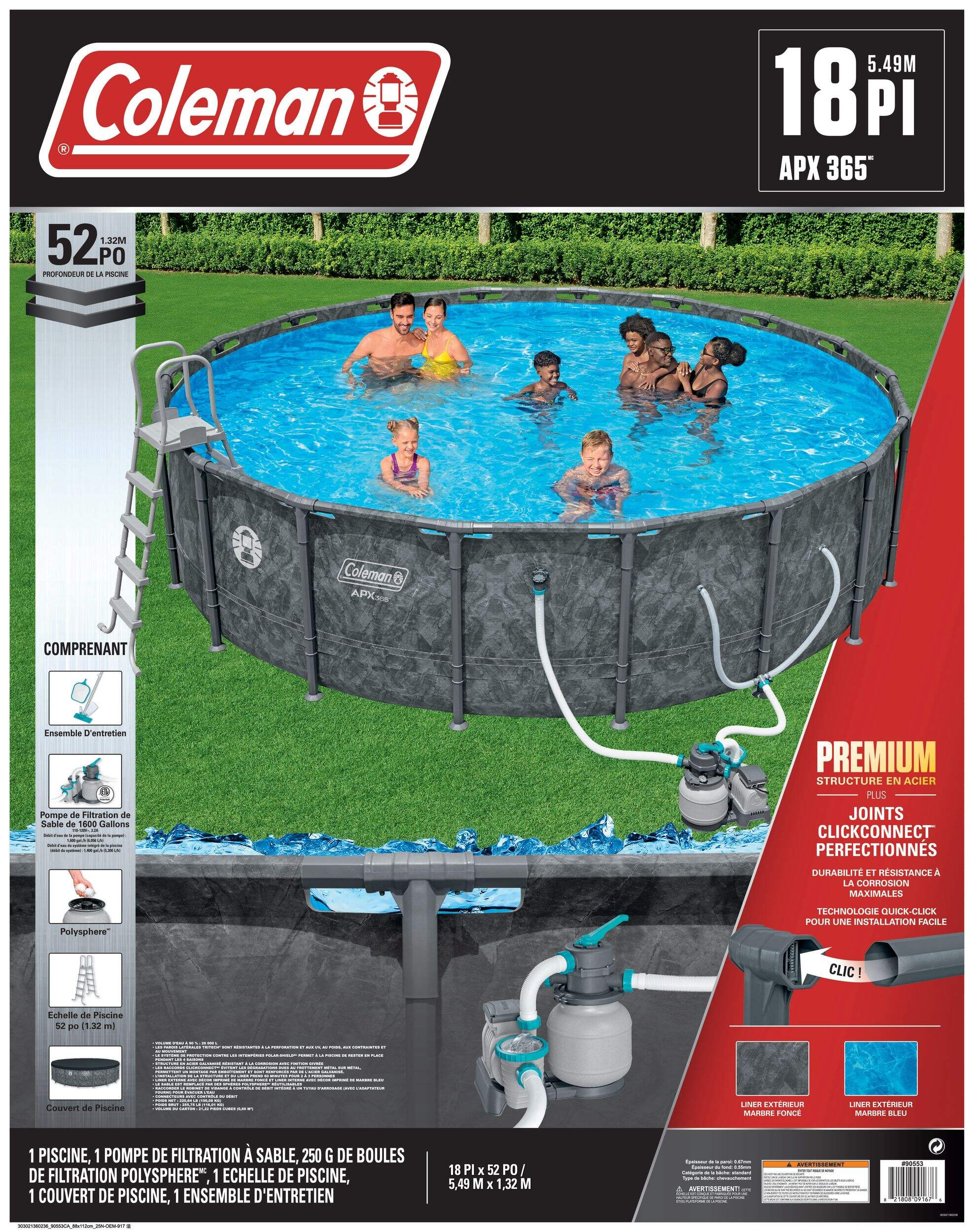 Get ready for backyard fun with the Coleman APX 365 Steel Frame Pool. At 18 feet wide, this spacious above-ground pool provides ample room for swimming, splashing or just lazing about on a sunny day. Better yet, its corrosion-resistant galvanized steel frame is built to withstand years of family fun. No tools? No problem—the quick, hassle-free setup and takedown process starts the party in record time. And thanks to Coleman's Polar-Shield weather defence, you can leave this sturdy steel pool standing through all four seasons.