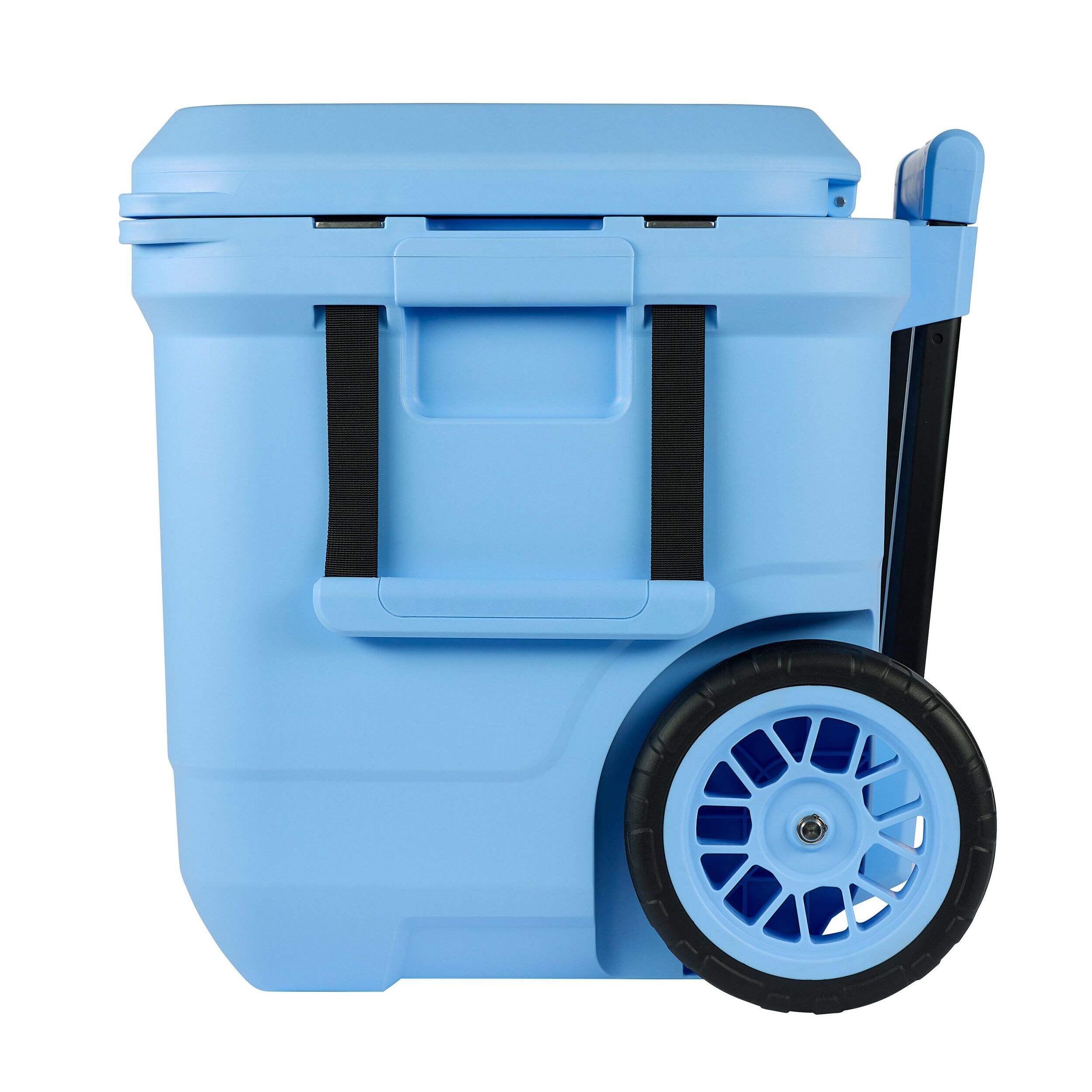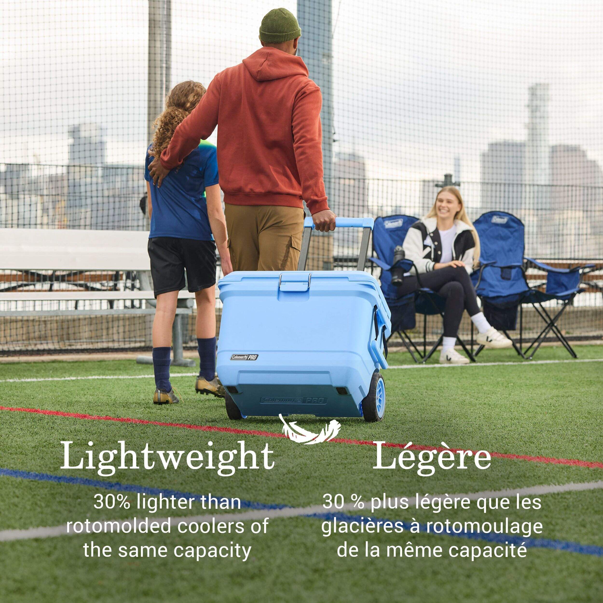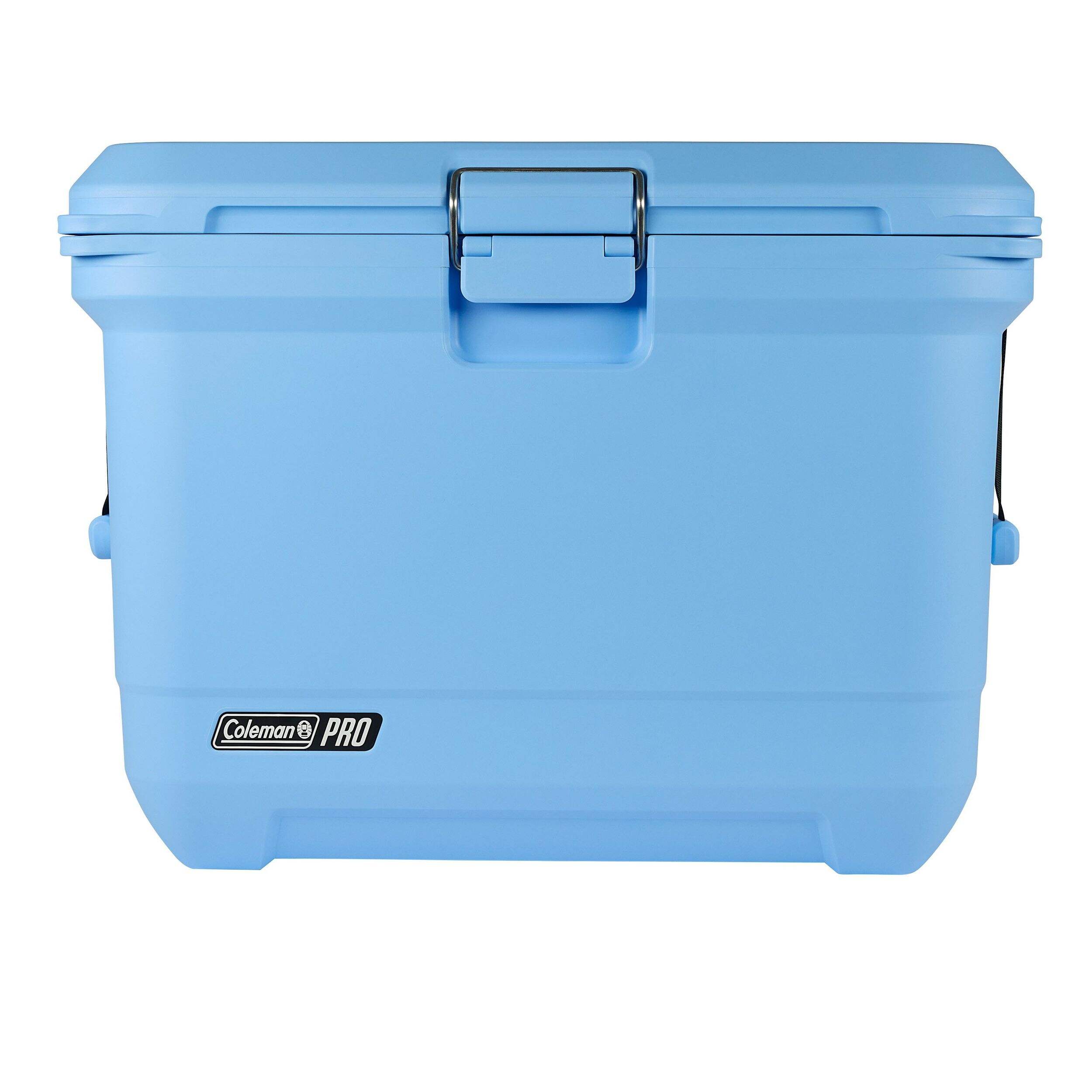 You work hard for your time off. You deserve gear that goes above and beyond. Meet the Coleman Pro series, designed for those who expect more. This 55-quart hard cooler stays cold for up to 4 days thanks to a fully insulated lid and body featuring extra thick walls up to 2 inches wide. Use its rugged wheels and extendable handle to comfortably roll from backyard to beach to tailgate to sidelines, while the stainless steel latch allows you to open and close the cooler with one hand. Extra-wide drain plug is attached so you can drain fast without losing track of the plug. Tie-down straps and non-slip feet let you securely rig your cooler in the bed of your truck or in the D-rings of your raft, while a pad-lock opening lets you add extra security. The Have-A-Seat lid is built to accommodate an extra guest when you run out of seats around the campfire, at the game, or out back. Best of all, these built-to-last features are backed by our 10-year limited warranty, so you can confidently bank on Pro performance for all your trips to come.