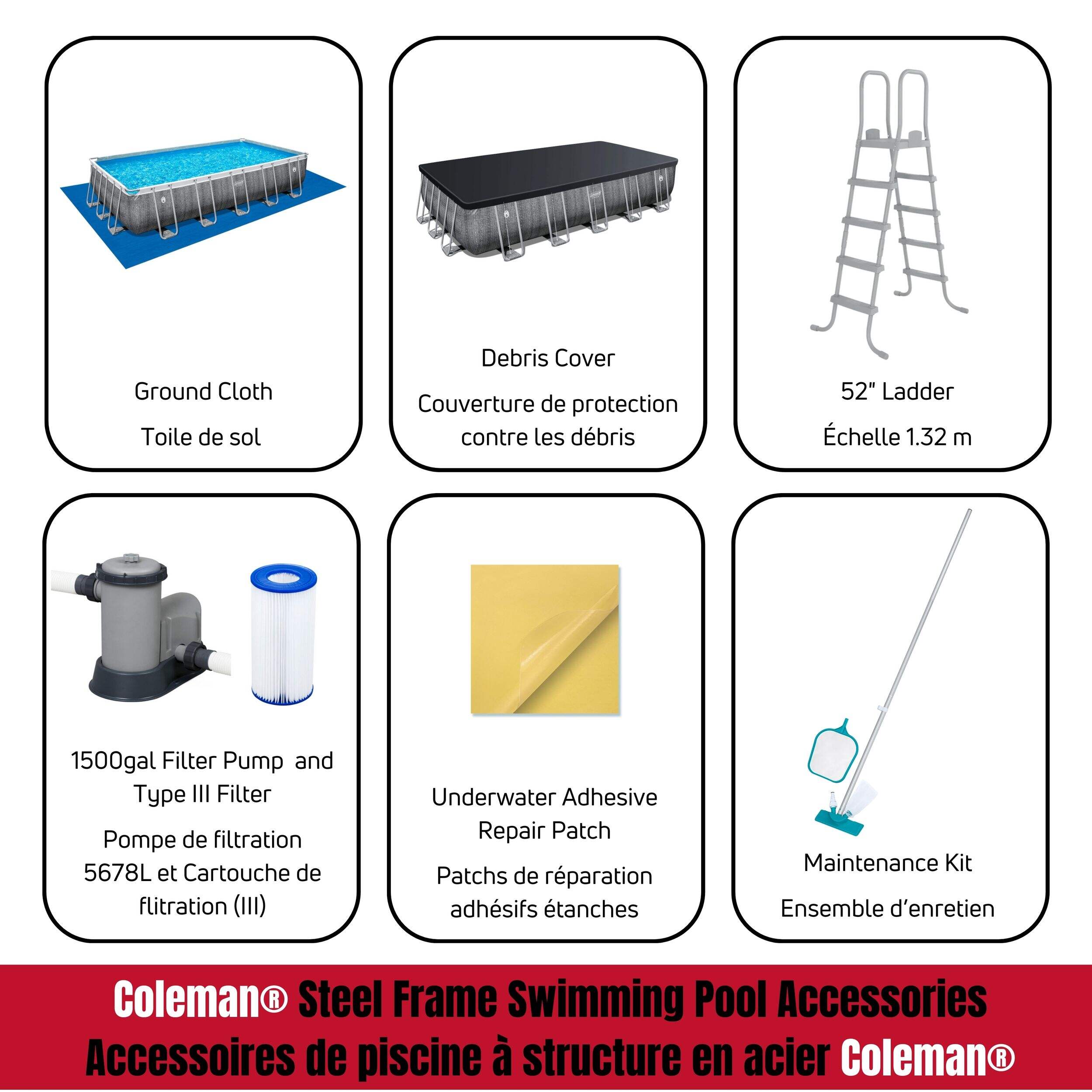 Includes pool ladder, maintenance kit, debris cover, ground cloth and Underwater adhesive repair patch