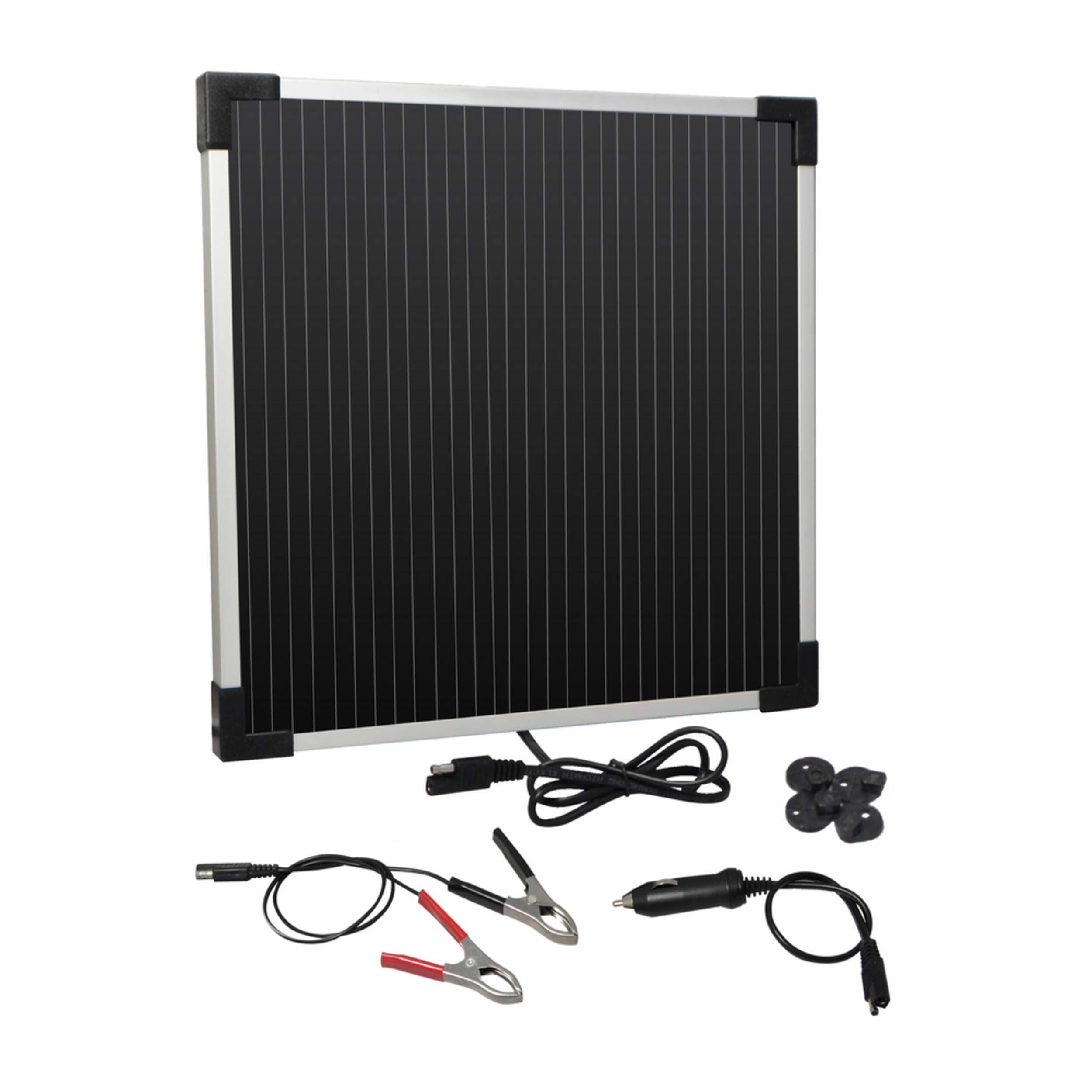 Includes alligator battery clamps, 12V DC plug, mounting hardware, and quick connect technology