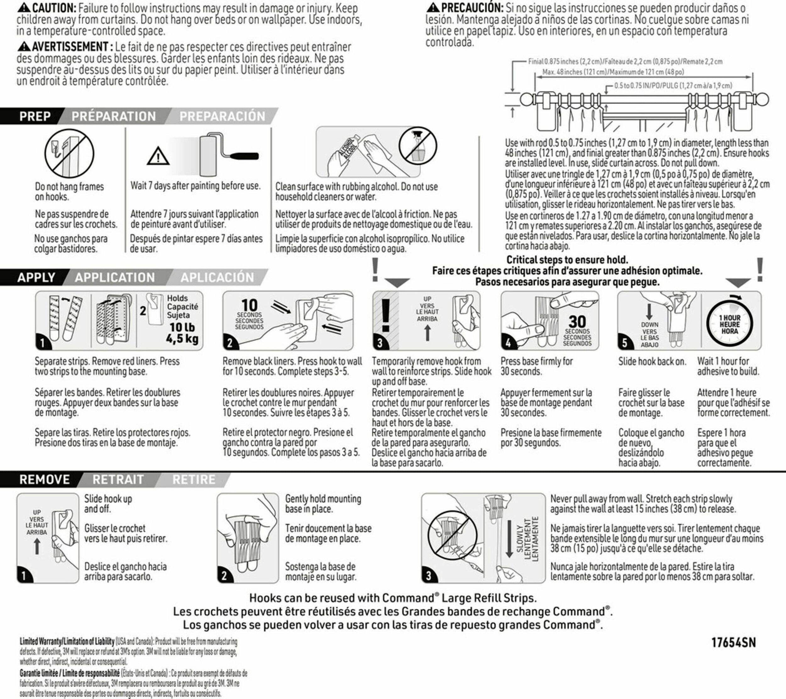 Includes 2 hooks and 4 strips. Fits curtain rods .5-in to .75-in diameter, and up to 48-in length