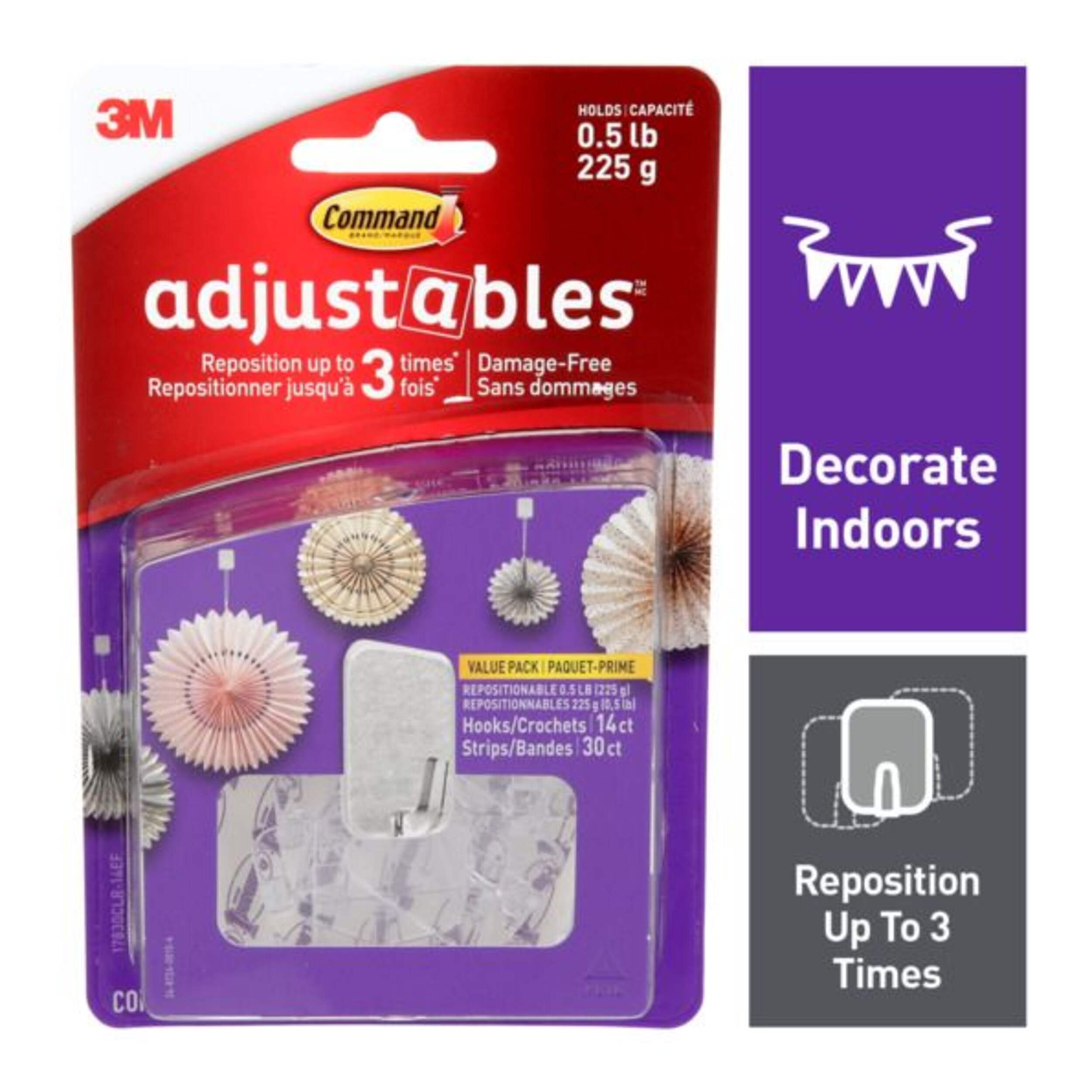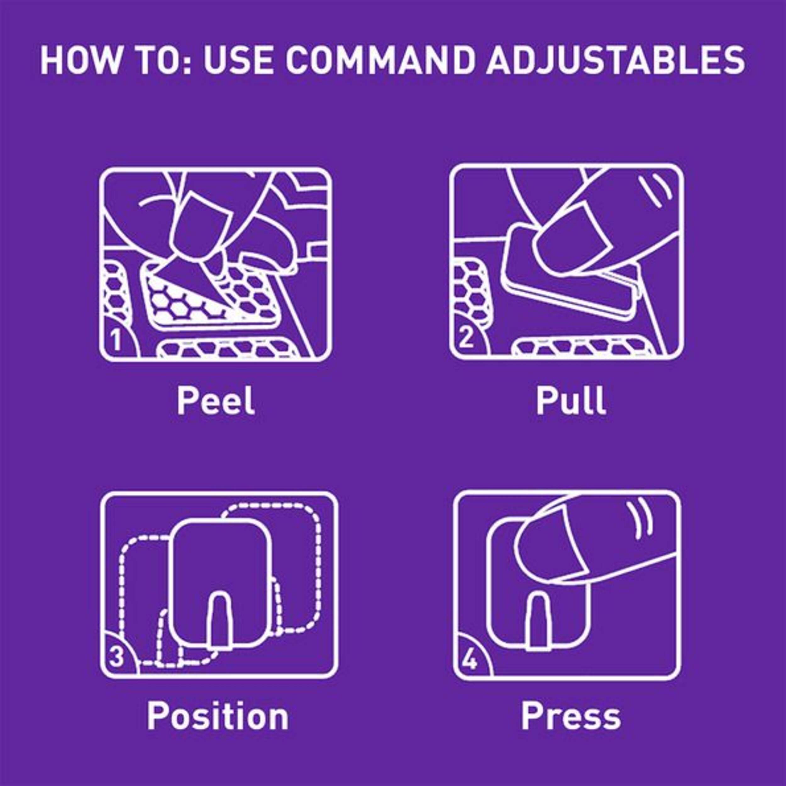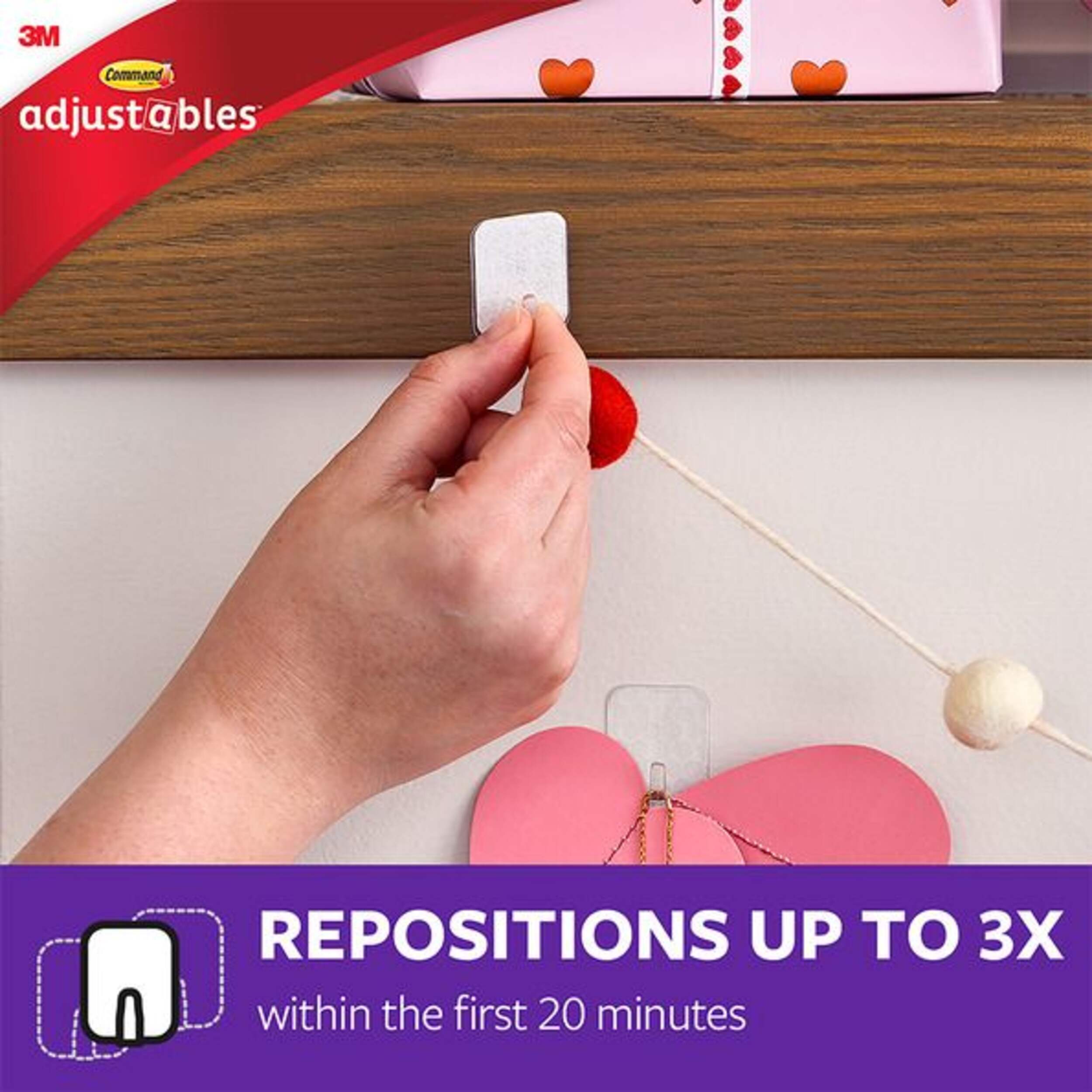 Command® Adjustables™ Repositionable Hooks help make perfect possible. Combining the strong, damage-free, clean-removal bond of Command® Products with new peelable technology, these hooks can be repositioned up to 3 times within the first 20 minutes to help you find your perfect placement. Stick, adjust, and stick again with Command® Adjustables™ Repositionable Hooks.