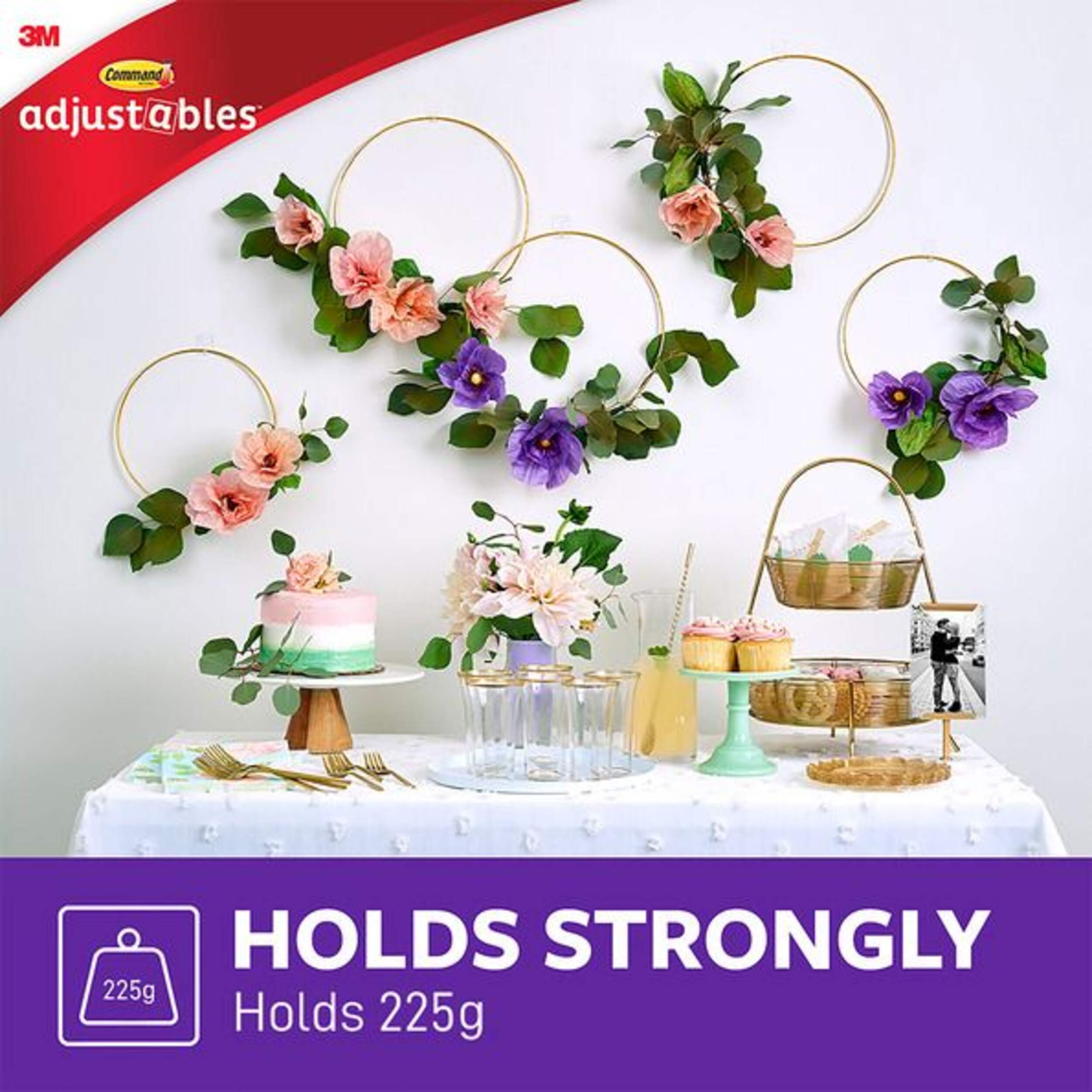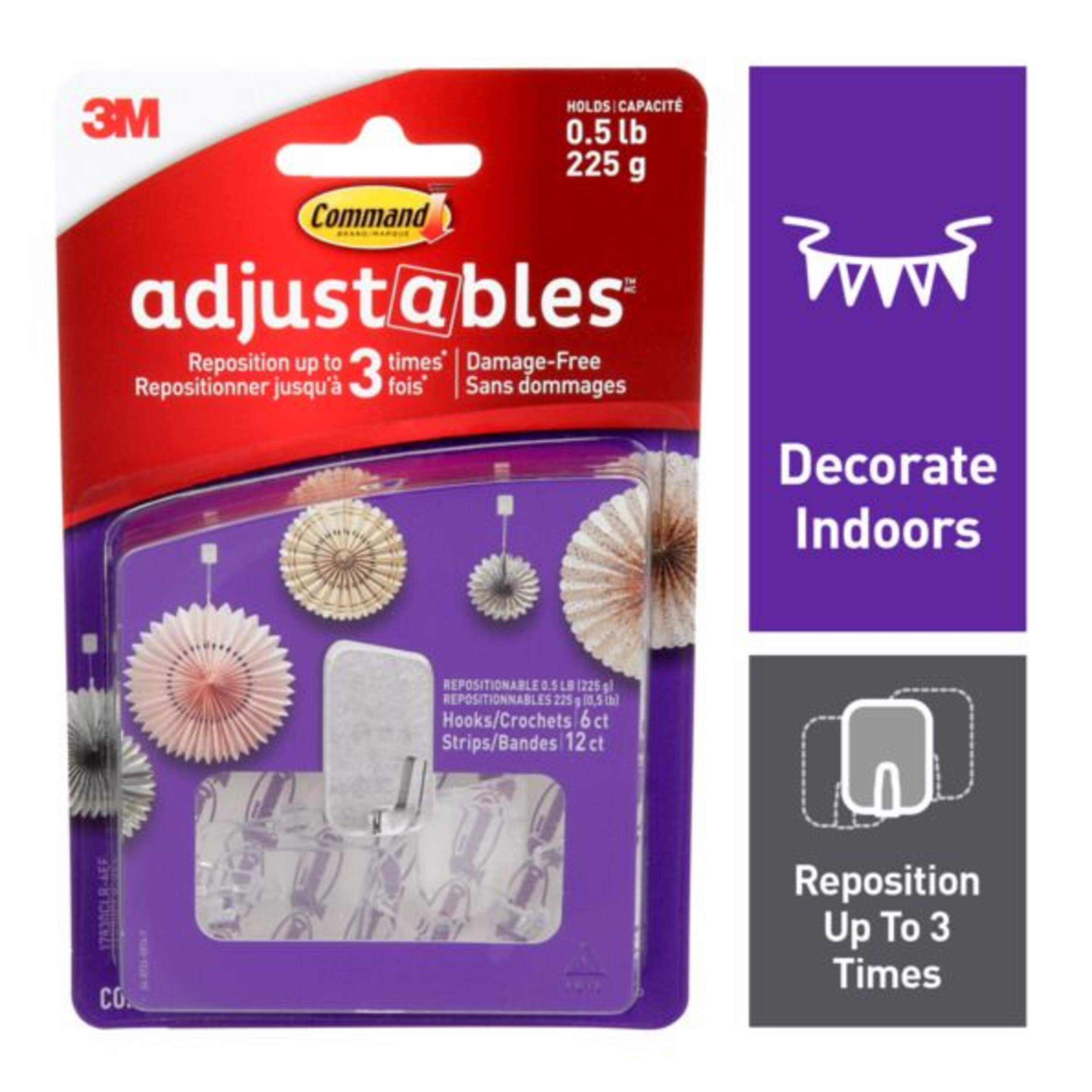 Command® Adjustables™ Repositionable Hooks help make perfect possible. Combining the strong, damage-free, clean-removal bond of Command® Products with new peelable technology, these hooks can be repositioned up to 3 times within the first 20 minutes to help you find your perfect placement. Stick, adjust, and stick again with Command® Adjustables™ Repositionable Hooks.