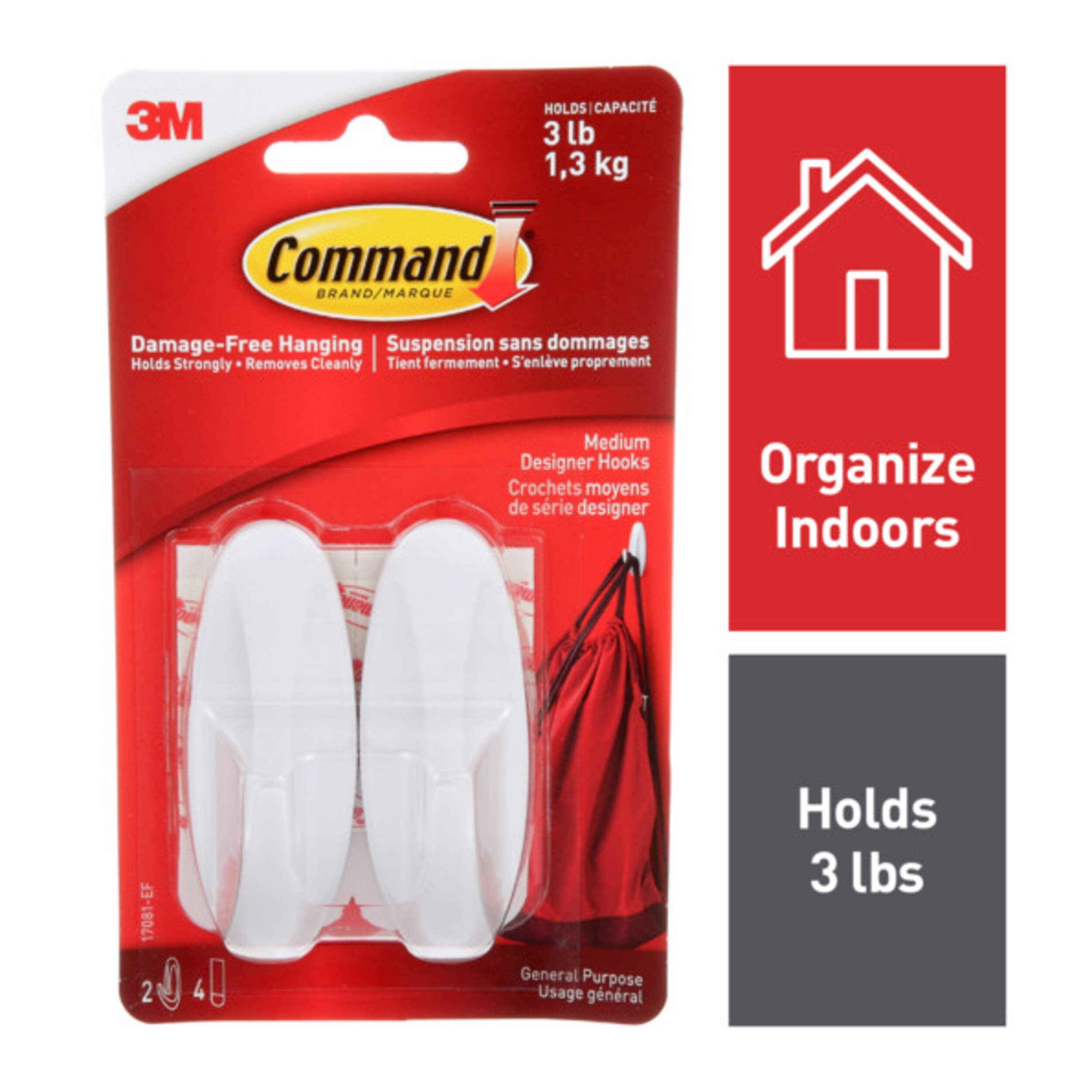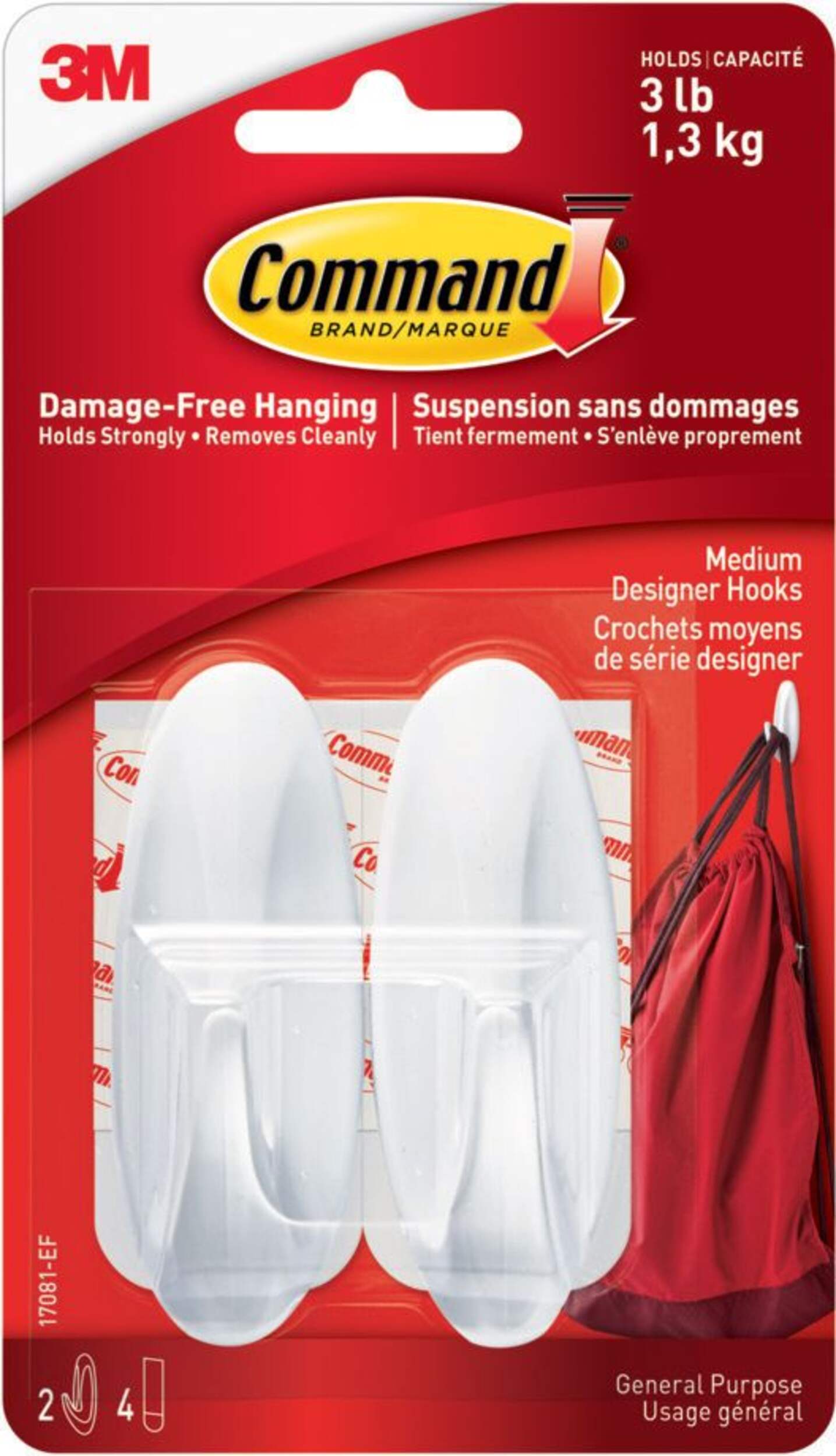 Command Medium Designer Hooks provide a strong hold on a variety of surfaces, including paint, wood, tile and more