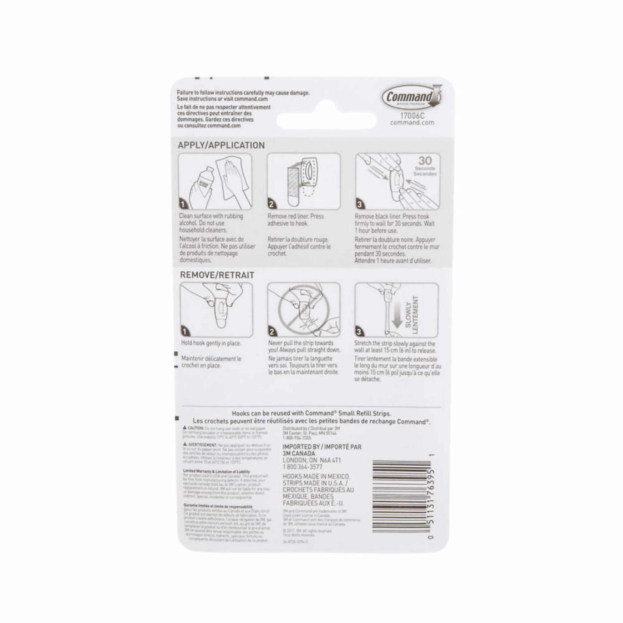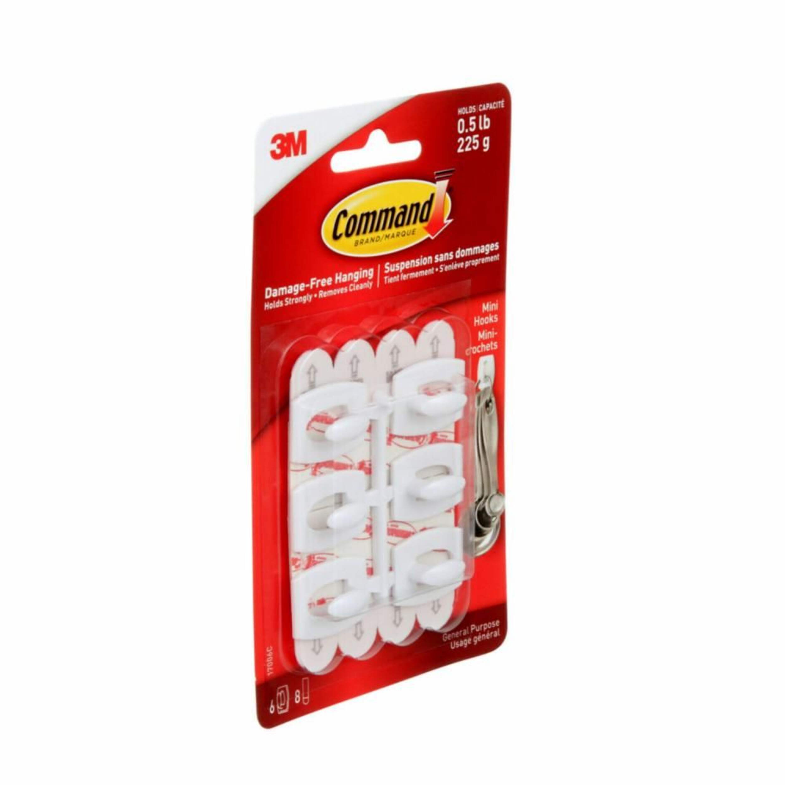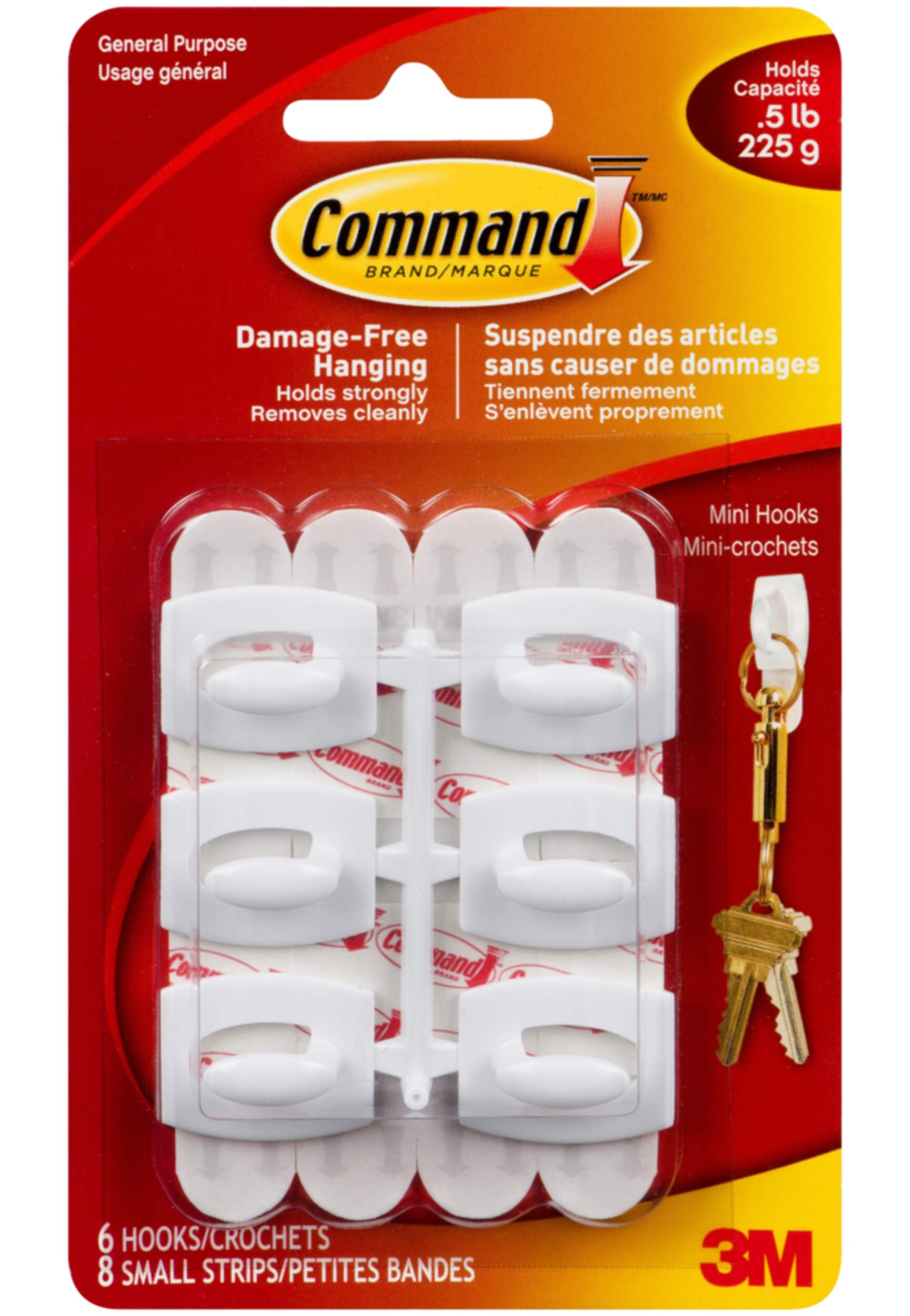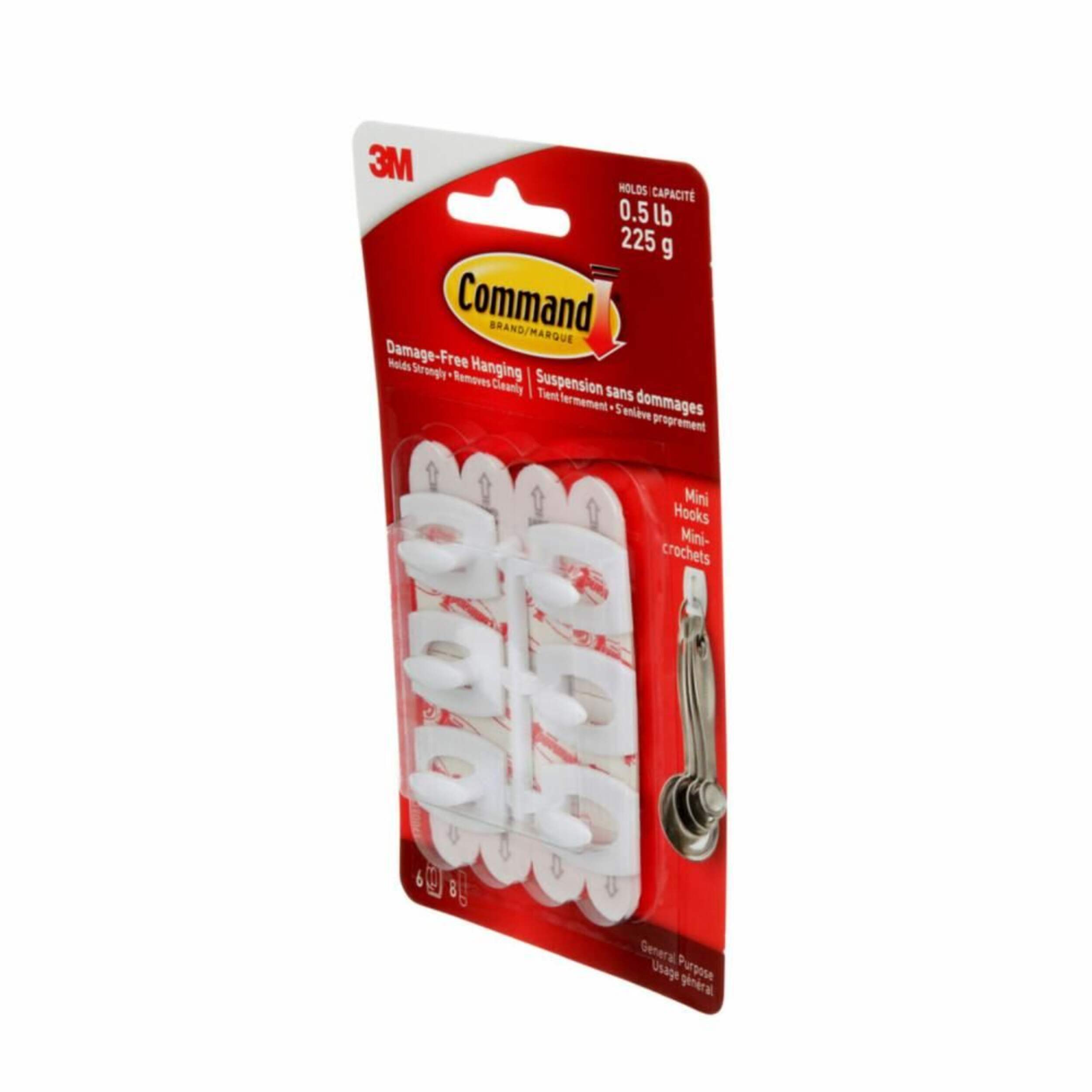 Forget about nails, screws and tacks, Command™ Mini Hooks are fast and easy to hang! Using the Command™ Adhesive, holds strongly on a variety of surfaces, including paint, wood, tile and more. They also remove cleanly - no holes, marks, sticky residue or stains. Re-hanging the Command™ Mini Hooks is as easy as applying a replacement Command™ Mounting Strip, so you can take down, move and reuse them again and again! Command™ Mini Hooks hold up to 0.5 pounds (0.226 kg).