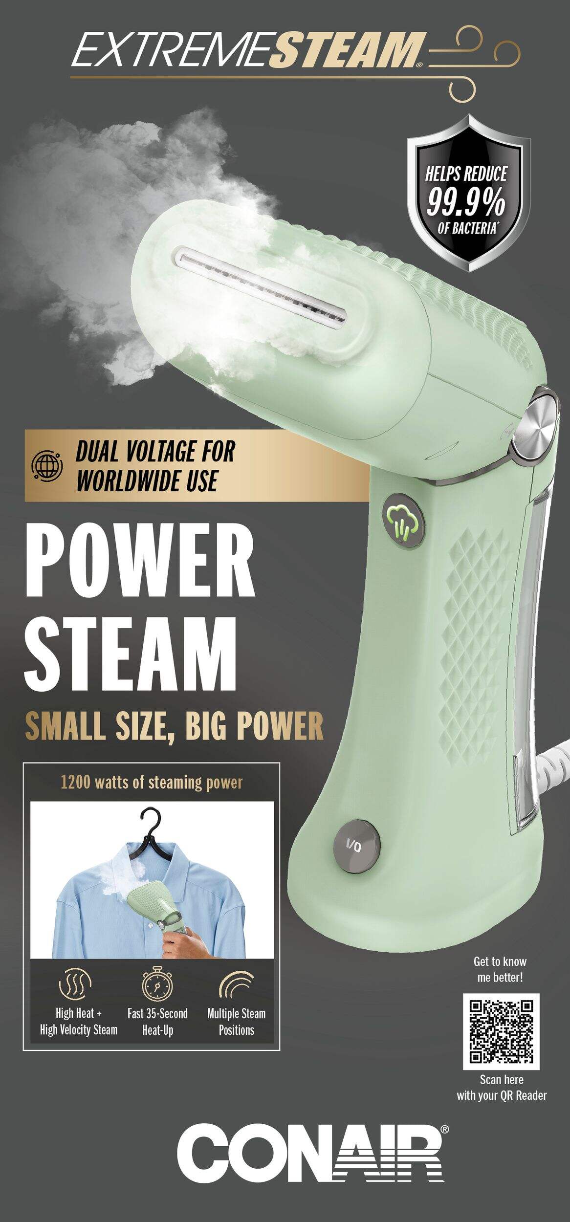 Perfect for on-the-go wrinkle removal and freshening, the small-yet-mighty Power Steam Travel Garment Steamer by Conair® features dual voltage for worldwide use
