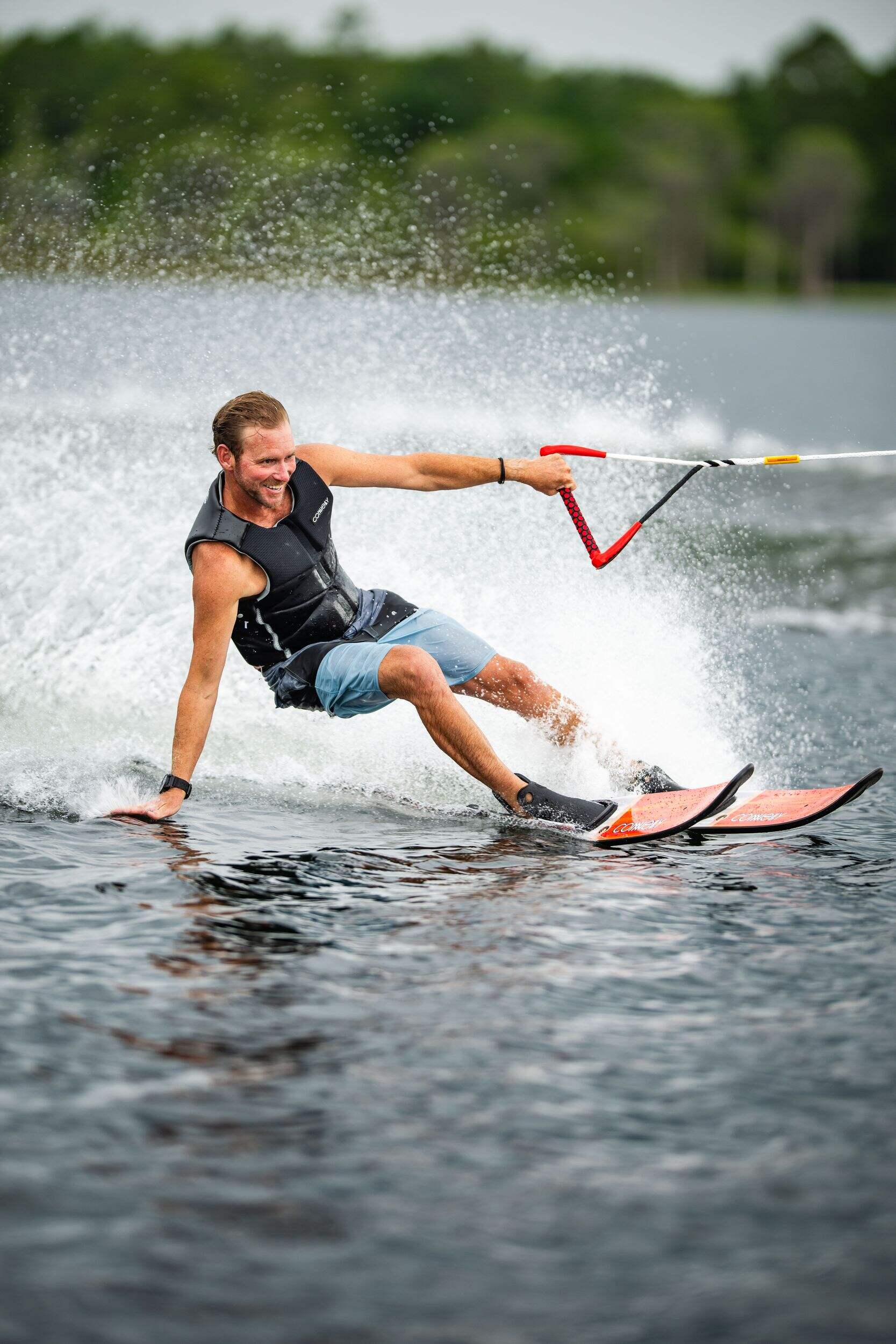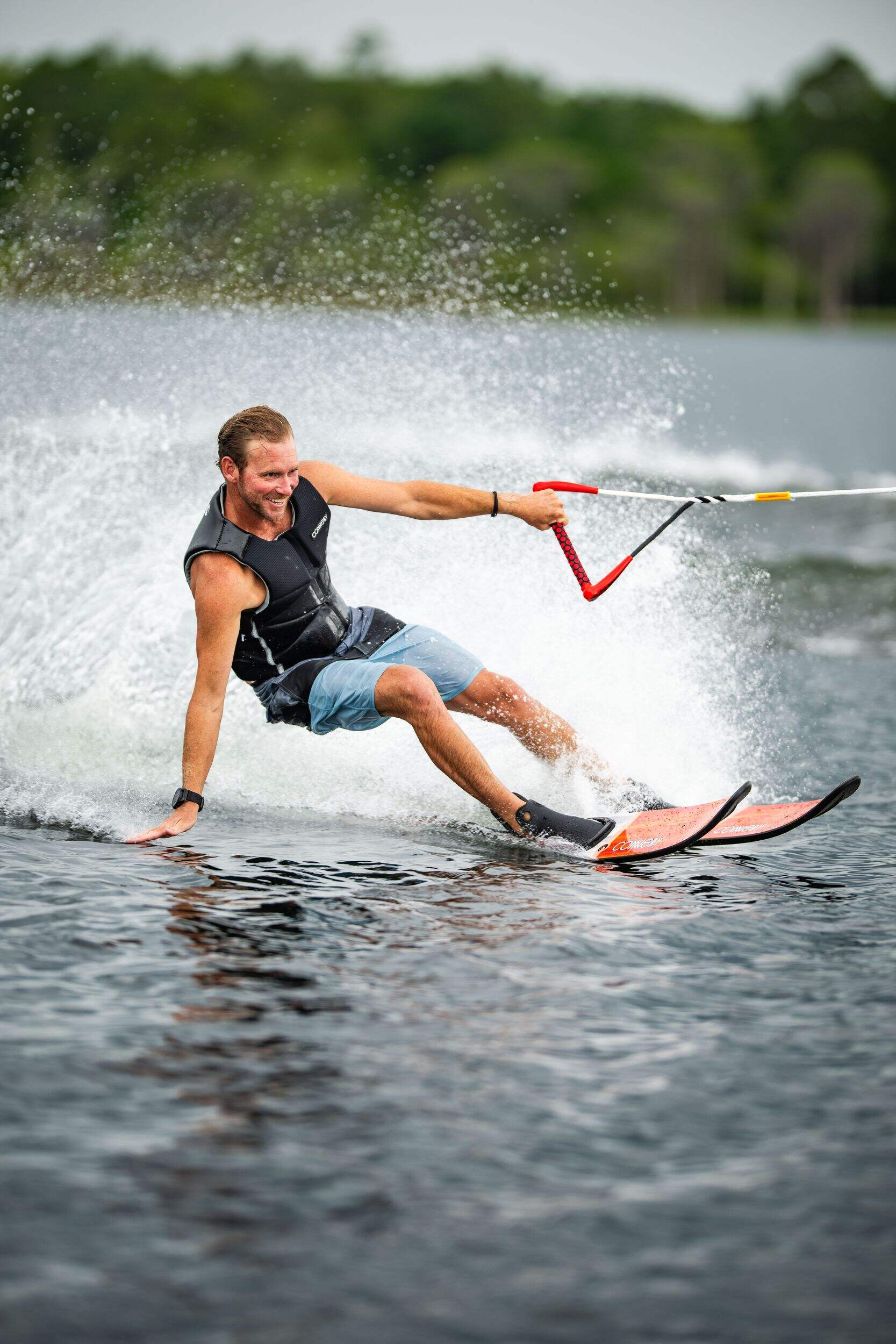 The Voyage combo pair uses a traditional shape with a slightly wider frame, specifically under the bindings and going back to the tail end. The extra surface area makes getting up and out of the water easier while providing you with stability to perfect your balance and stance. Step base technology through the bottom tunnels reduces drag and gives the skis a maneuverable feeling.
