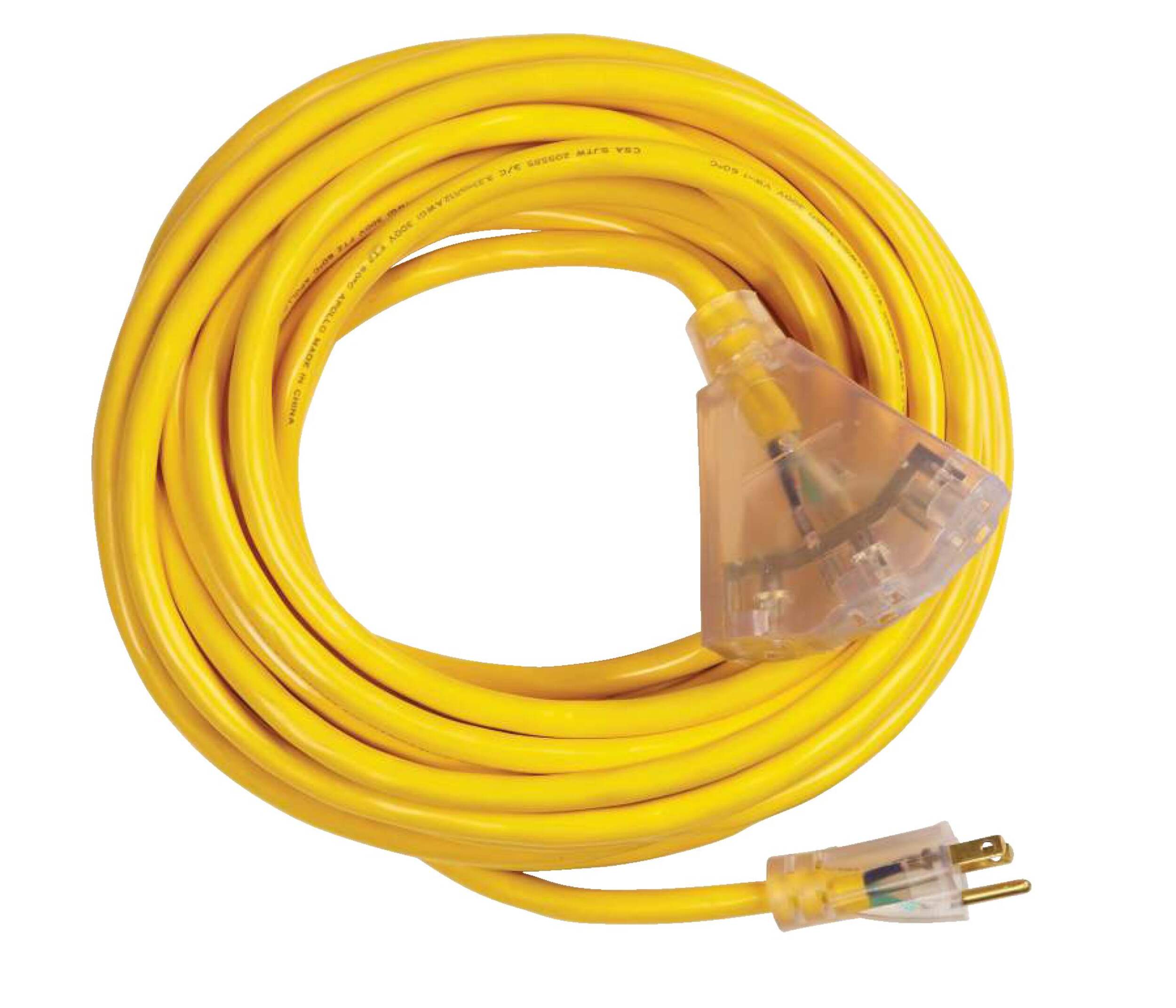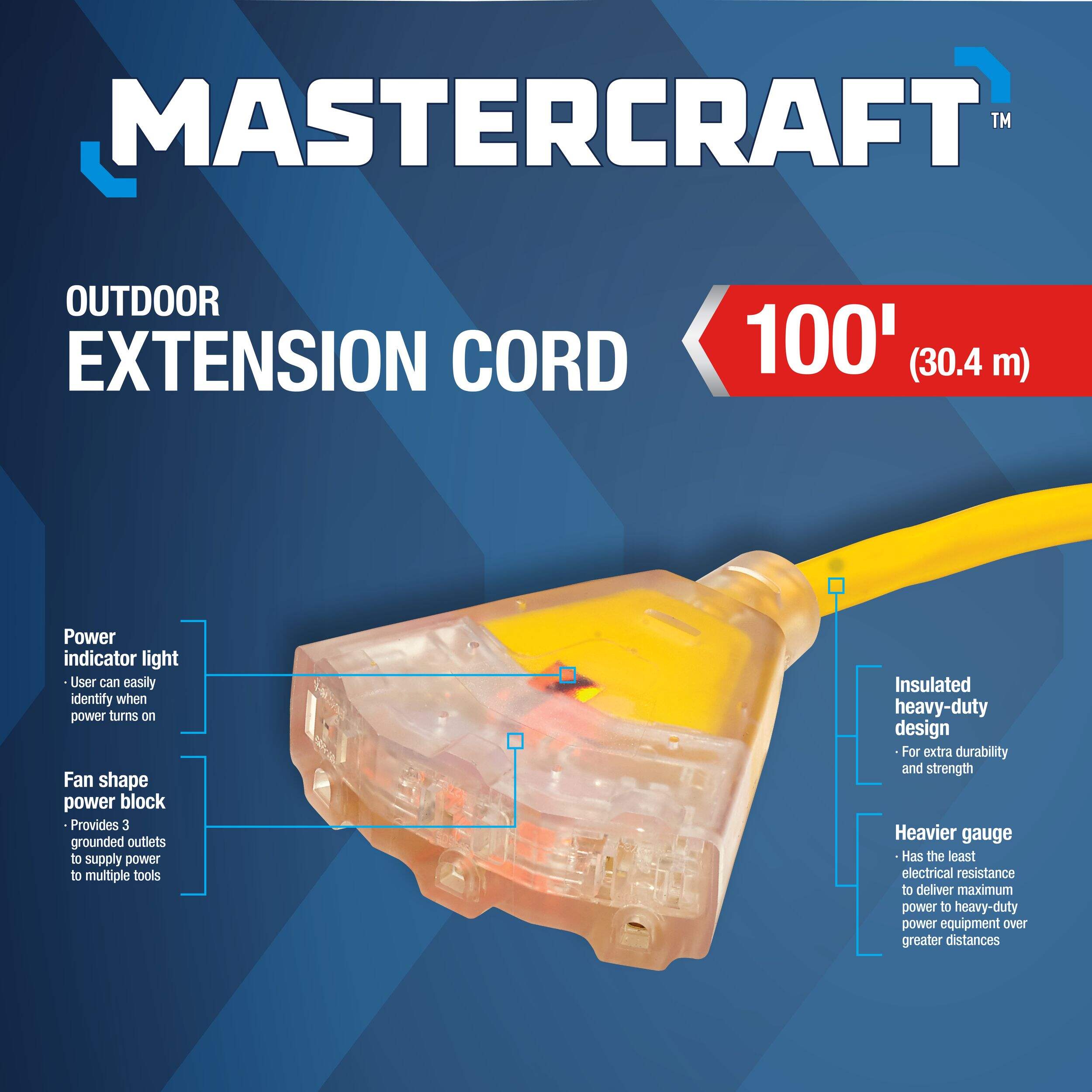 The Mastercraft Outdoor Extension Cord with Power Block has multiple transparent plugs to provide maximum grip when you’re working on difficult projects. This durable, heavy gauge power cable delivers more power to your tools and accommodates jobs that take you far away from a convenient power source. Even in the cold of winter weather, this extension wire can provide the energy you need. The 12 gauge power cord ends in a dedicated power block with 3 15A outlets to accommodate multiple tools or workstations at once.
