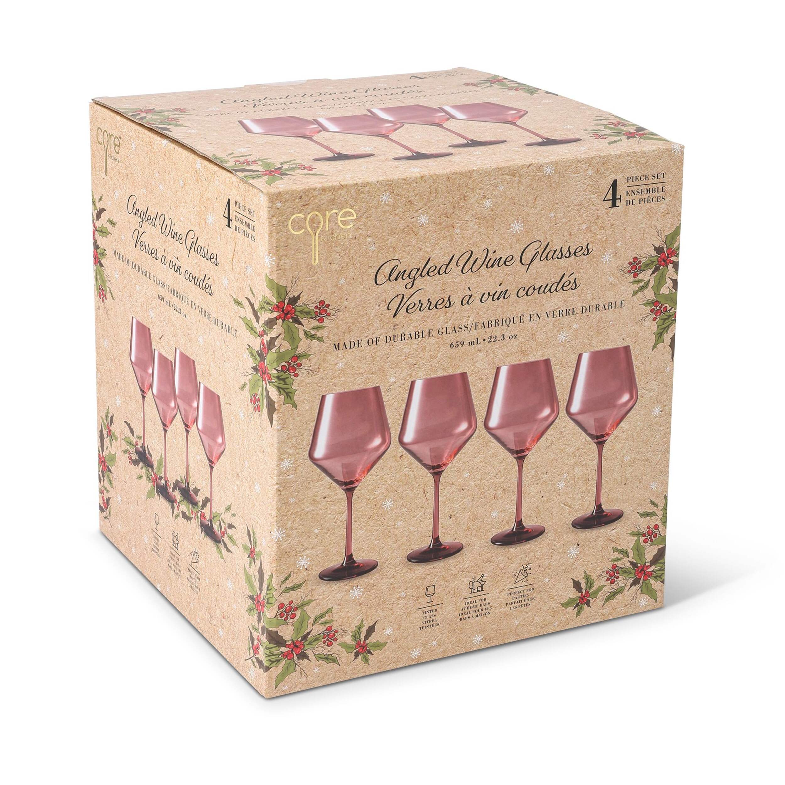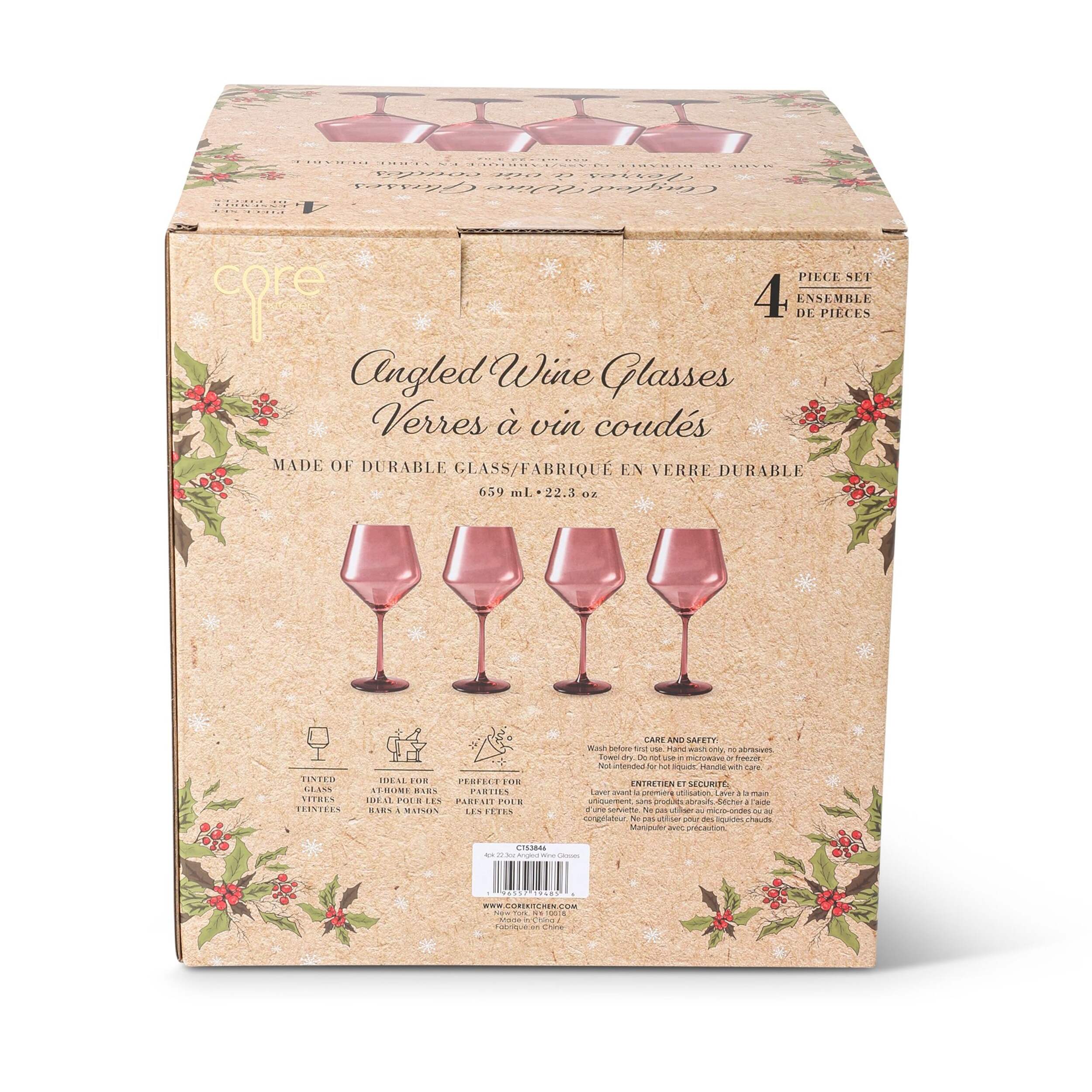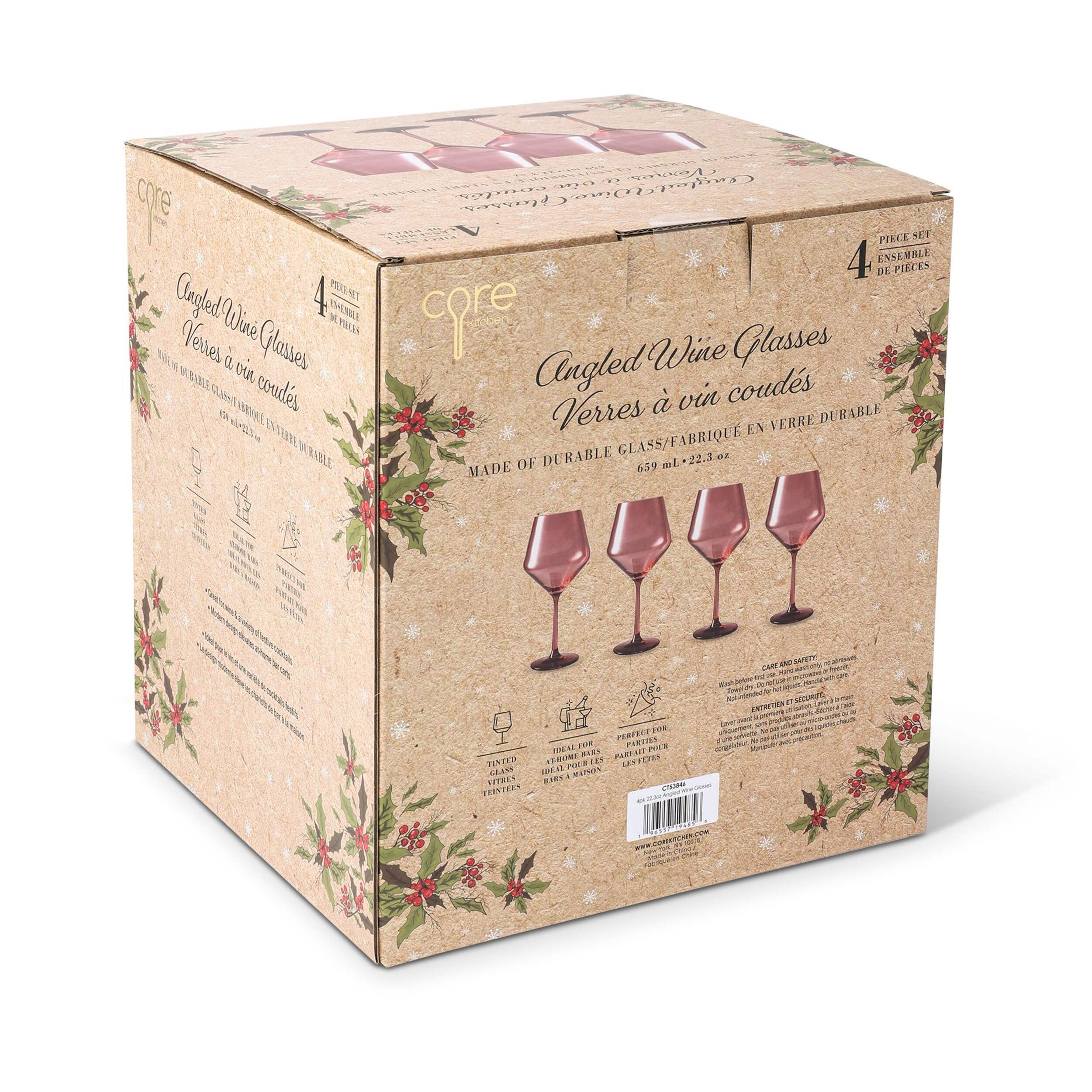 Update your home bar with this elegant and stylish Core Home Wine Glass Set. Ideal for an intimate dinner with friends, these wine glasses feature a distinctive angled design and tinted red glass for an artful variation on your usual clear glassware. The stemmed profile is perfect for parties, special occasions, or any time you want to enjoy an elegant beverage. These hand-wash only tinted wine glasses deserve your best bottle and finest company.