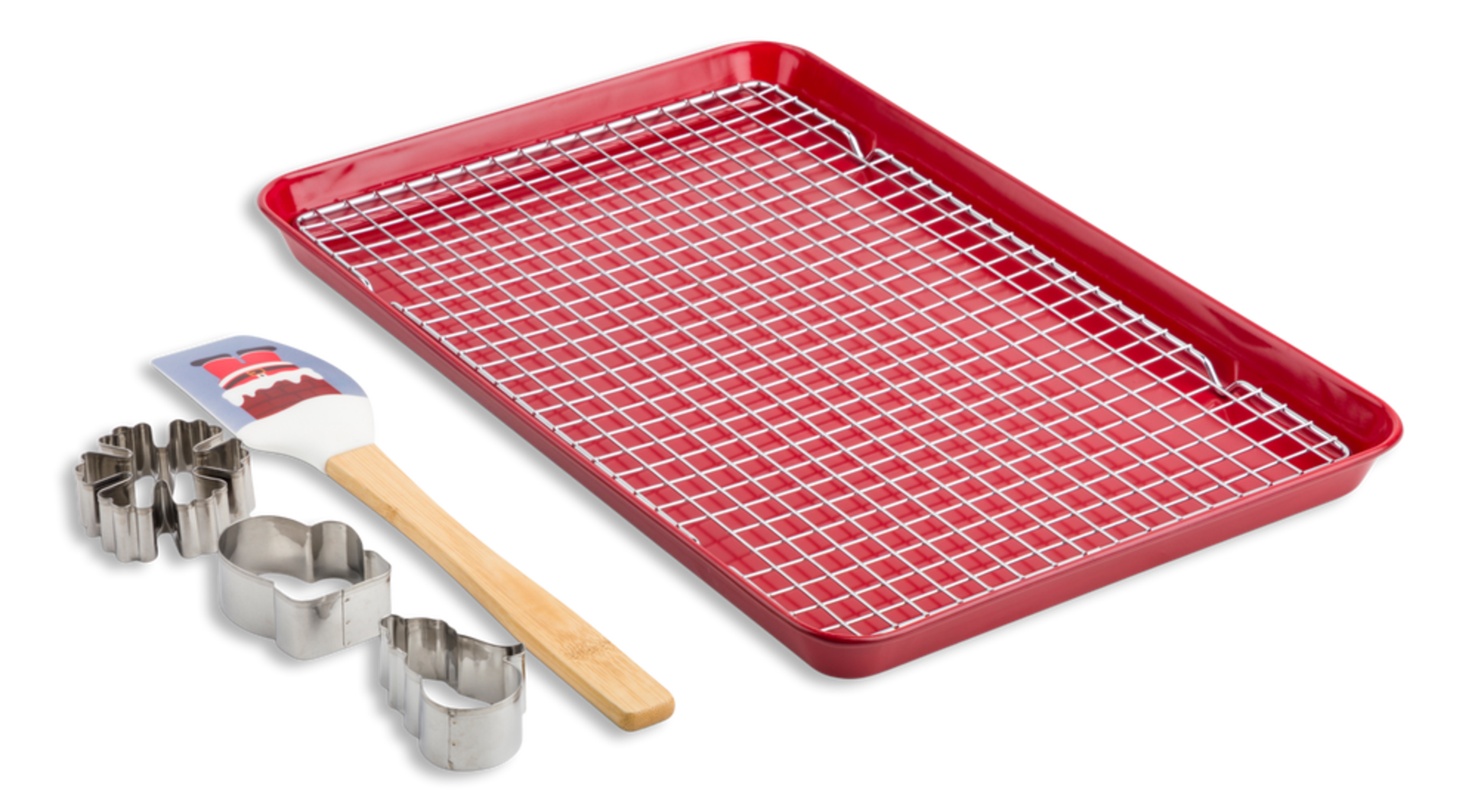 6-piece set includes: baking sheet, cooling rack, silicone spatula and 3 stainless steel cookie cutters