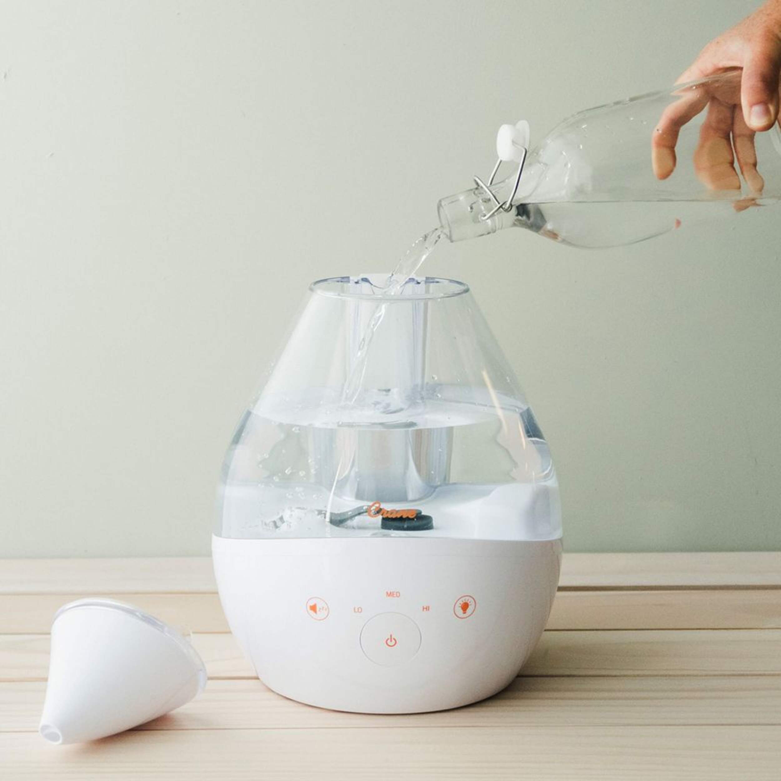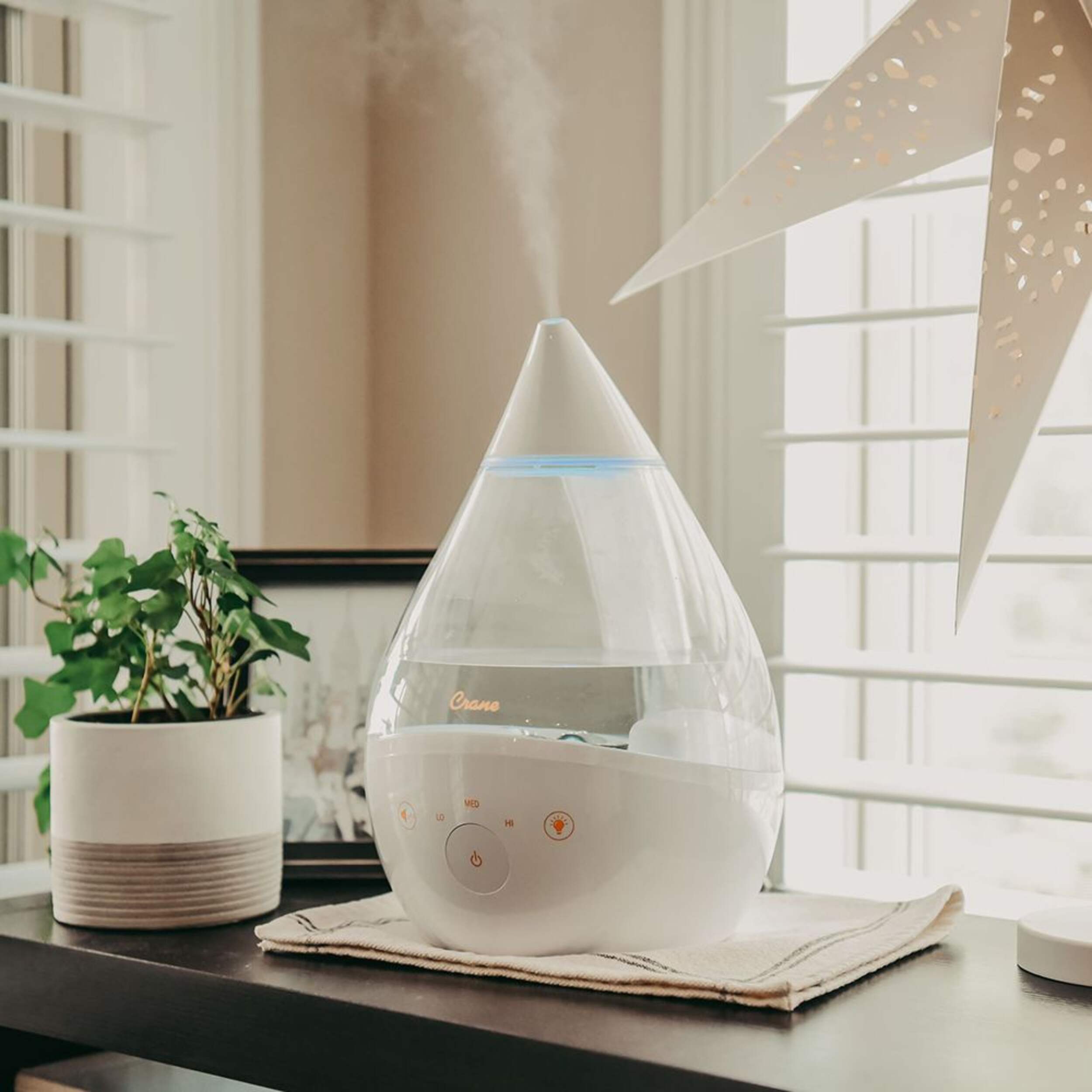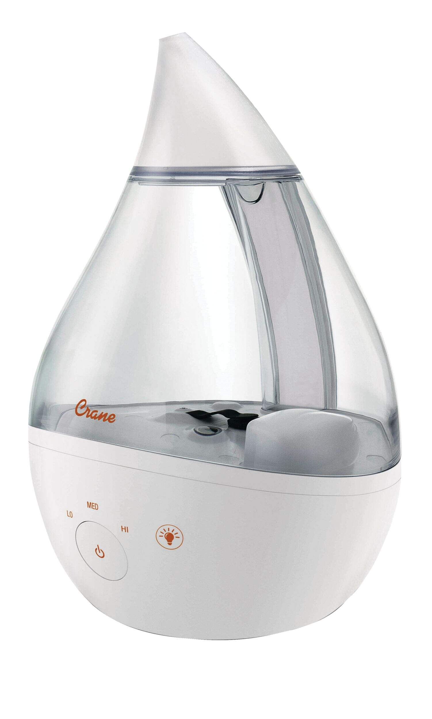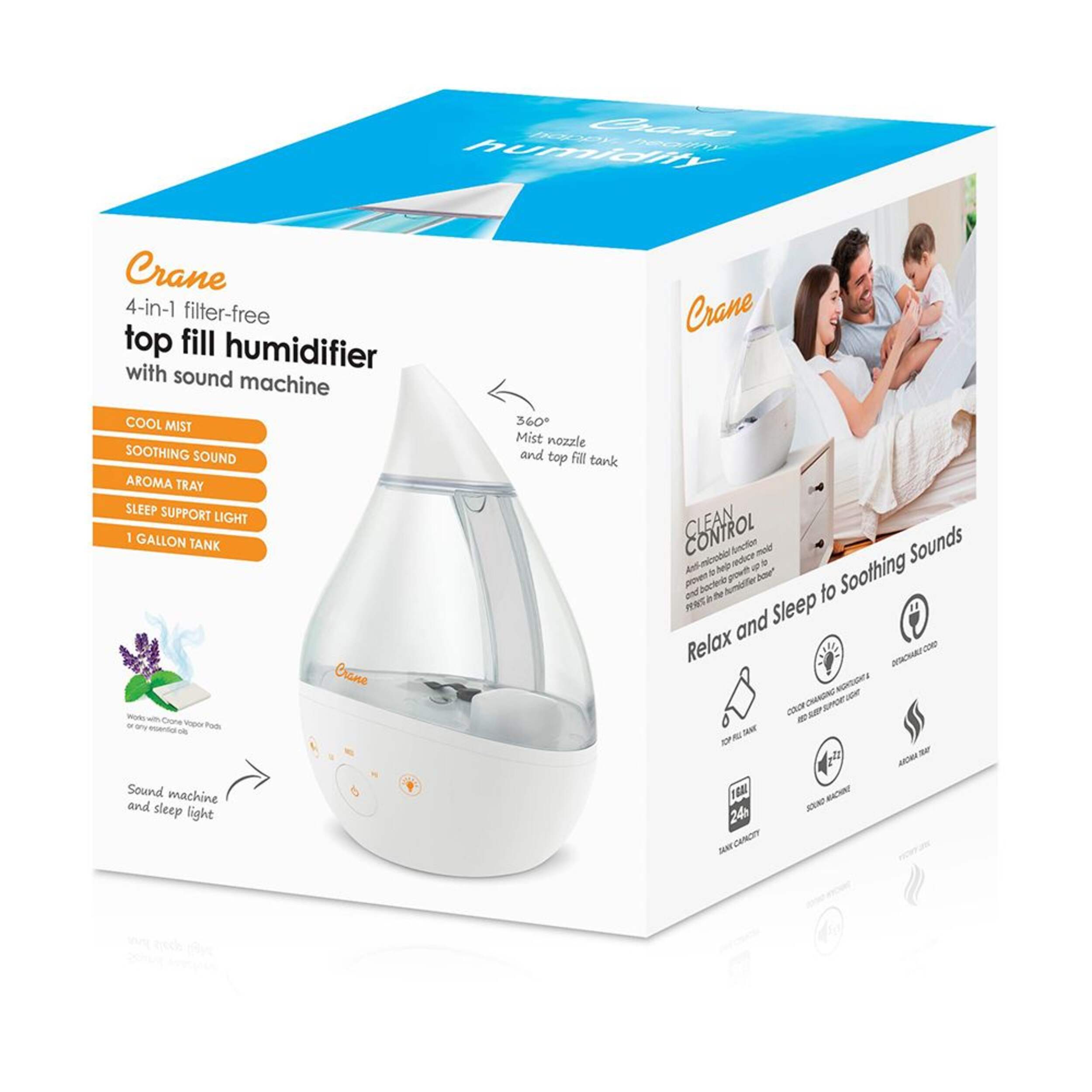 The Crane Clear White Top Fill Ultrasonic Drop humidifier makes misting up your space a breeze. The easy-to-fill and clean construction, detachable mist chamber and detachable cord allow for fuss-free use. The ultra quiet operation and adjustable speed settings provide the right amount of moisture throughout rooms up to 500 square feet, while the auto shut-off kicks in once the water runs out. With an anti-microbial interior and vapour tray with pad, mould and bacteria growth is minimized for healthy, hygienic humidification.