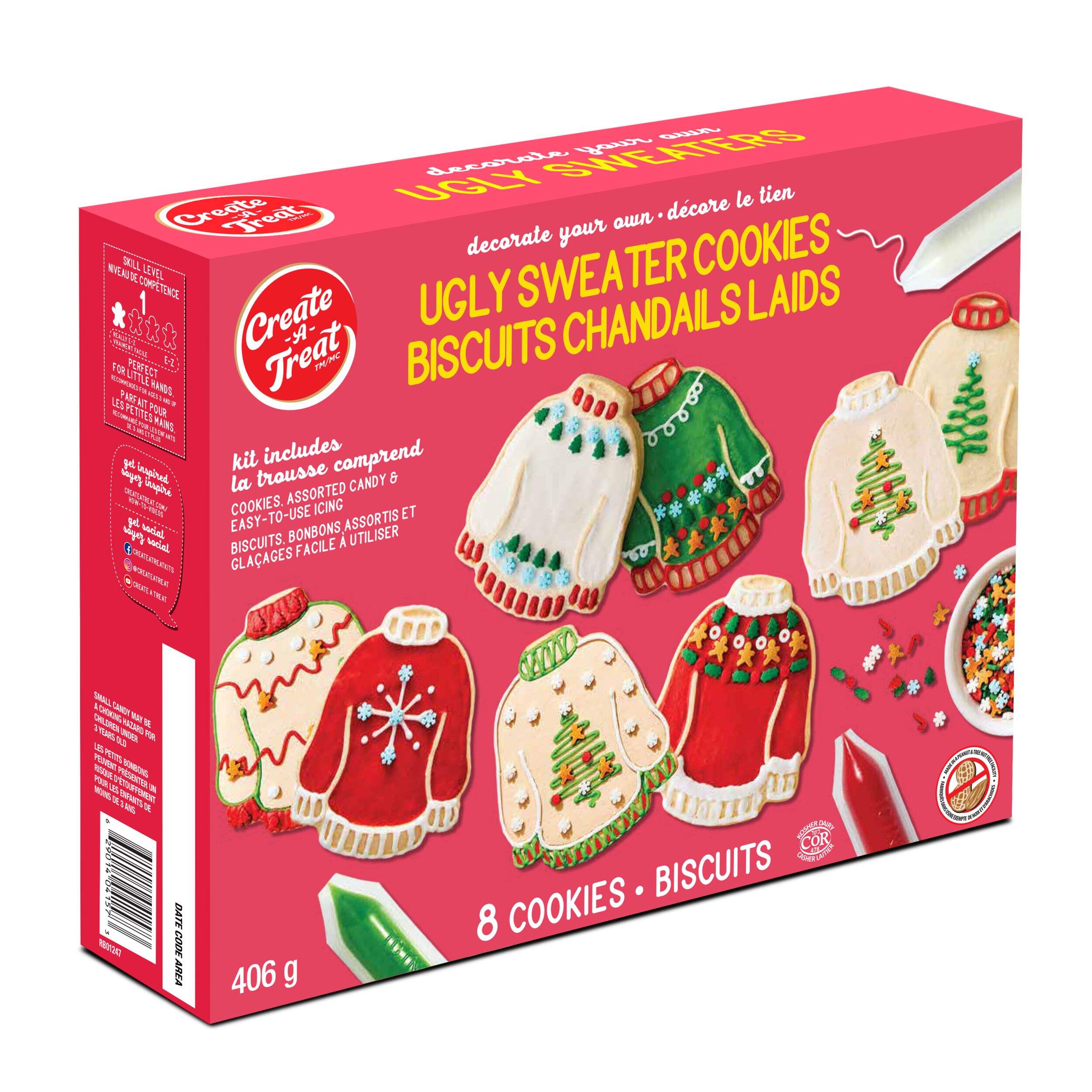 The Create-A-Treat Ugly Sweater Cookie Decorating Kit is the perfect way to get festive with eight delicious vanilla cookies shaped like ugly sweaters. Decorate your cookies this Christmas with festive coloured icings and candy, included in the kit. These cookies are ready for you to customize with holiday cheer.