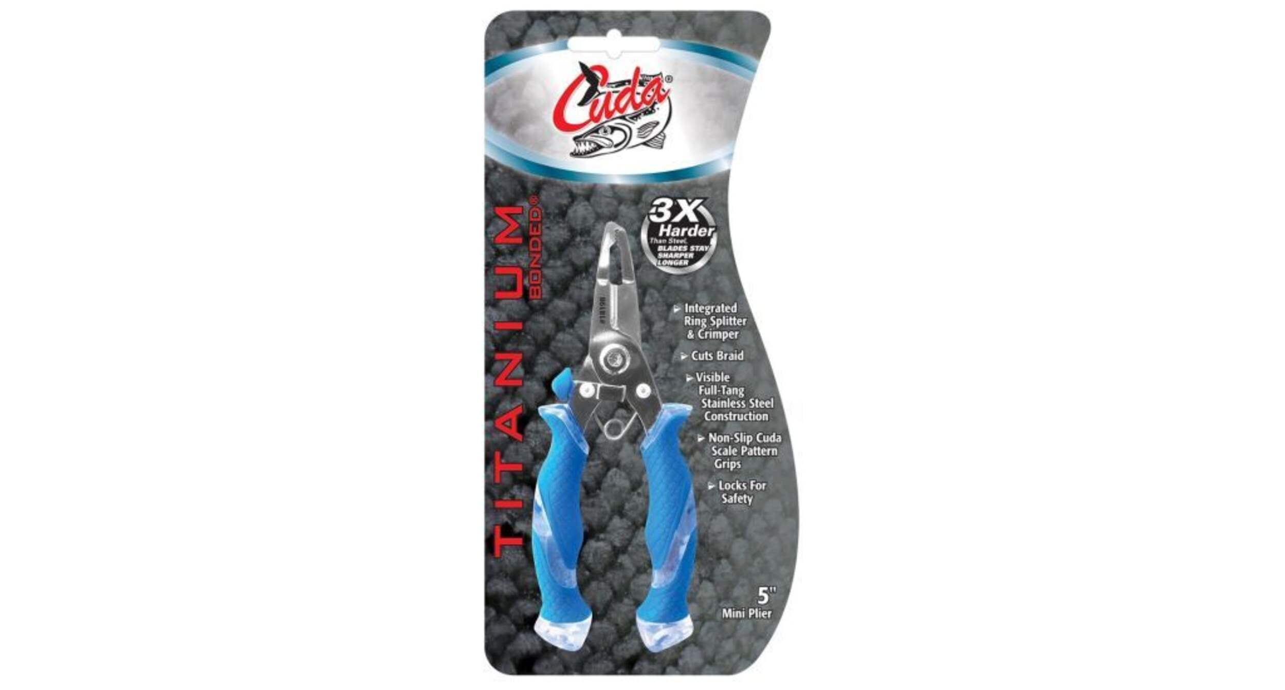 The Cuda 5" Mini Plier is as strong as it is versatile. Constructed of titanium bonded stainless steel for increased corrosion resistance and edge retention, the blades are 3x harder than untreated stainless steel. Also featuring an integrated ring splitter and crimper, this plier can cut braided line with ease and handle a wide range of cutting tasks. The full tang construction is visible through the non-slip handles as well, complimented by the signature Cuda scale pattern to channel water away from your hand and provide a secure grip in all conditions. Complete with a safety lock and Lifetime Warranty, the 5" Mini Plier makes for a fine addition to any tacklebox.