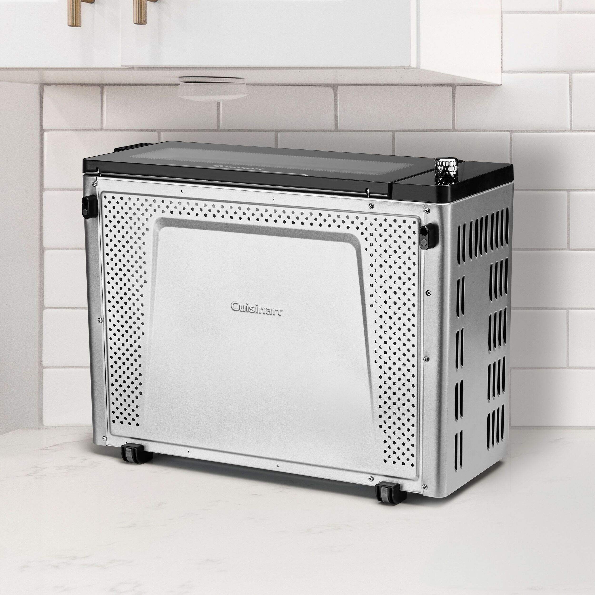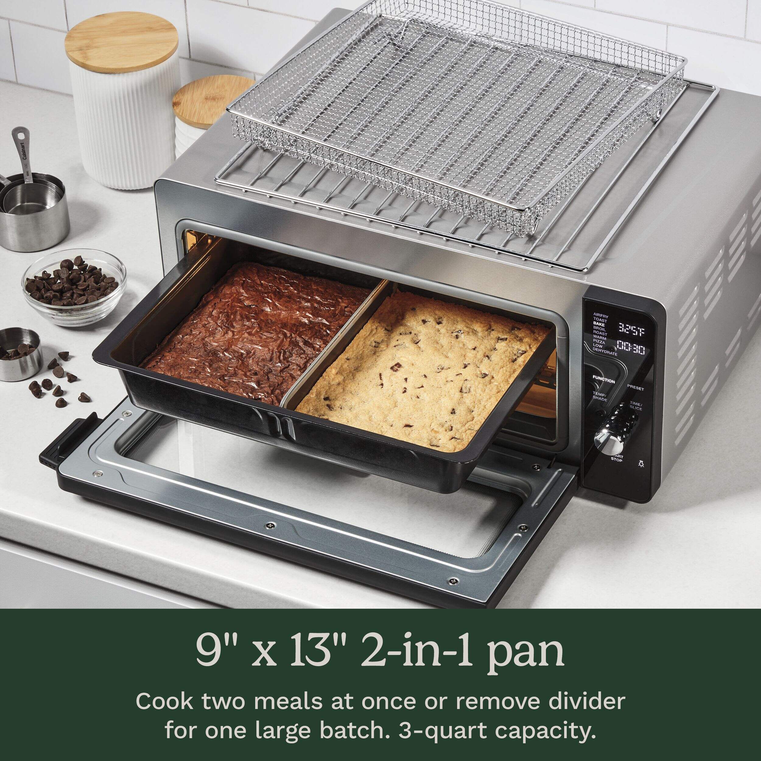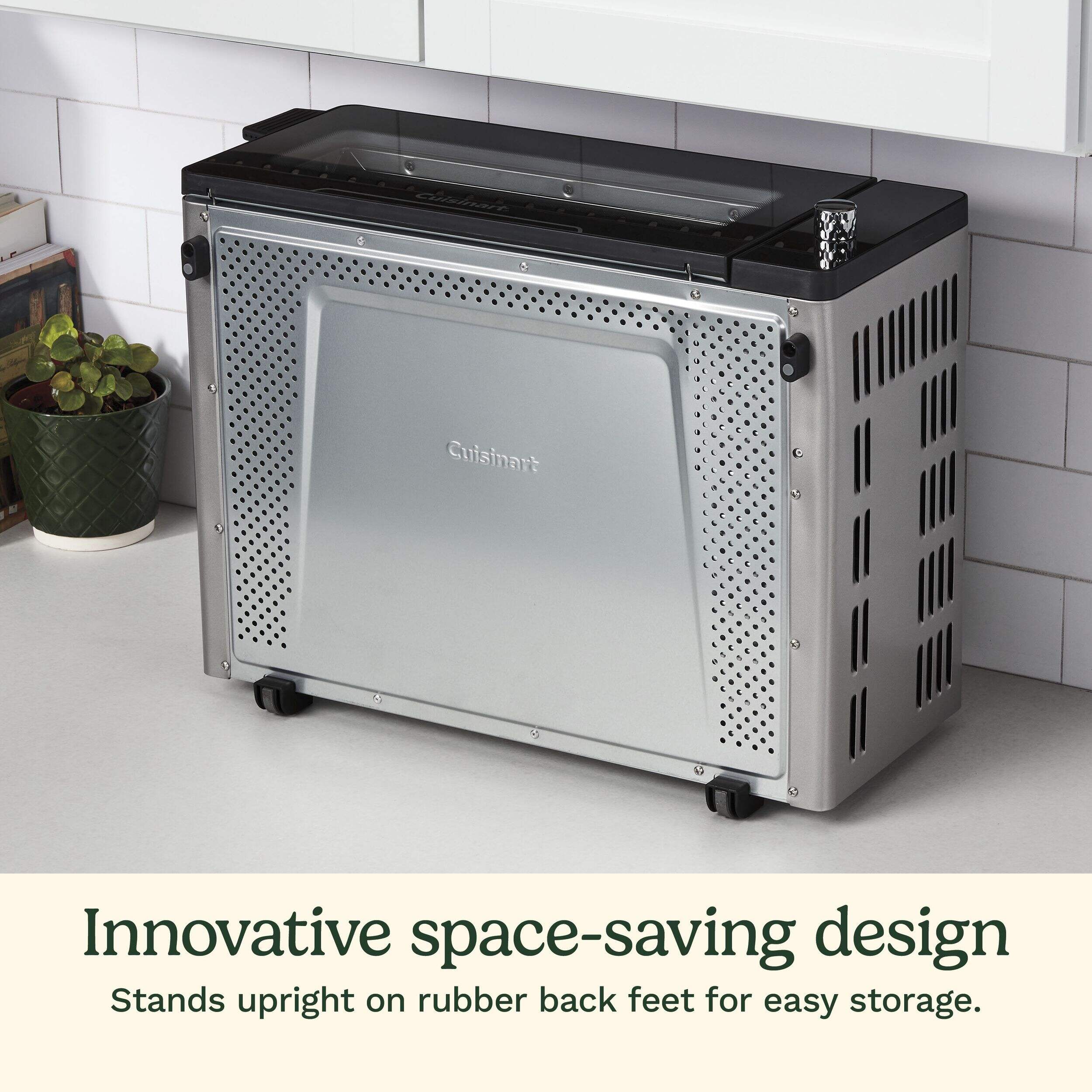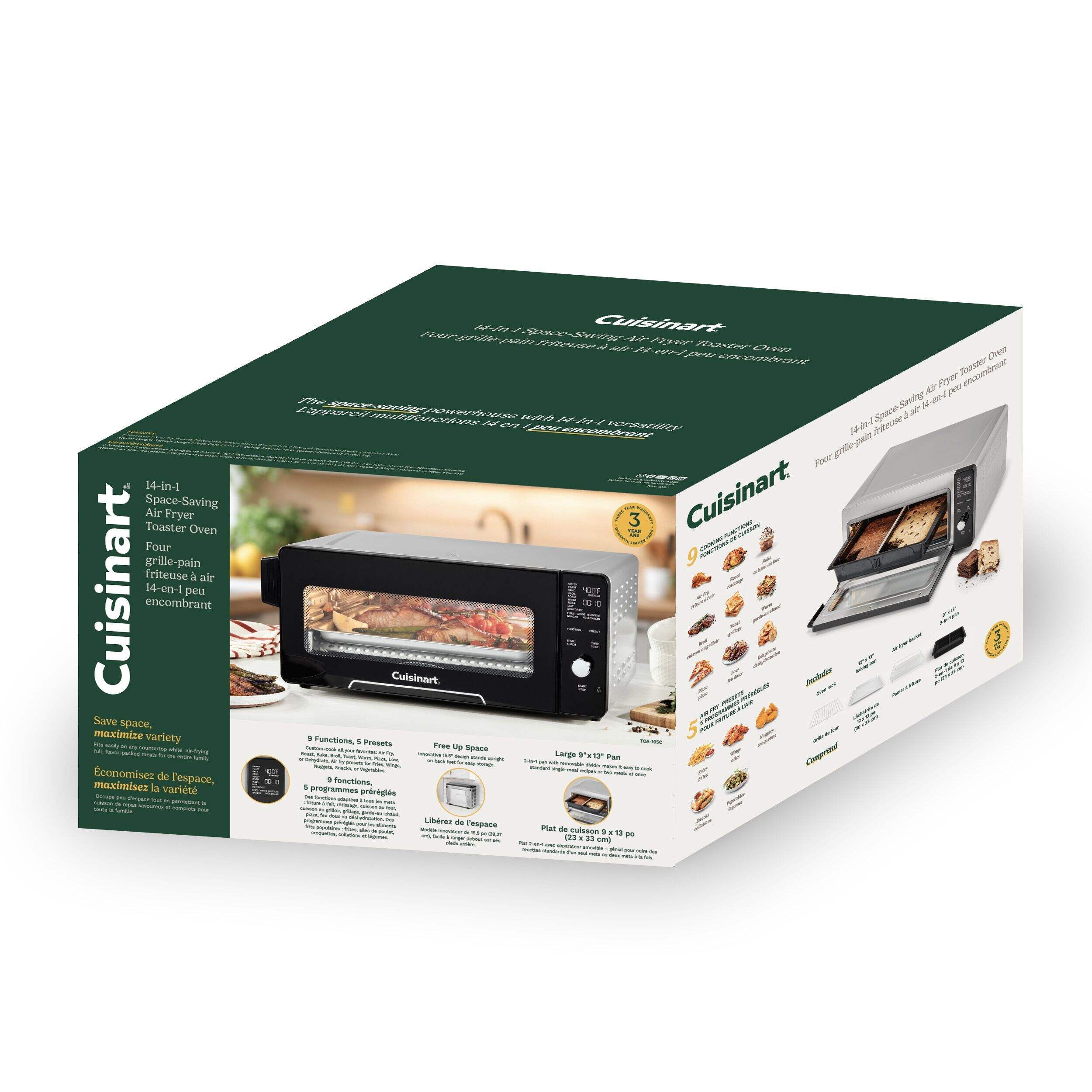 Small in footprint, bold in versatility — this 14-in-1 space-saving Cuisinart Flip Up Air Fryer Toaster Oven is designed to do more with less. With 9 functions and 5 air fry presets, it delivers crisp results, family-sized meals and everyday convenience from your countertop. The included 2-in-1 pan with a removable divider lets you cook two meals at once, or go big for a single batch. Best of all, it stands upright for easy storage, freeing up space without sacrificing performance.