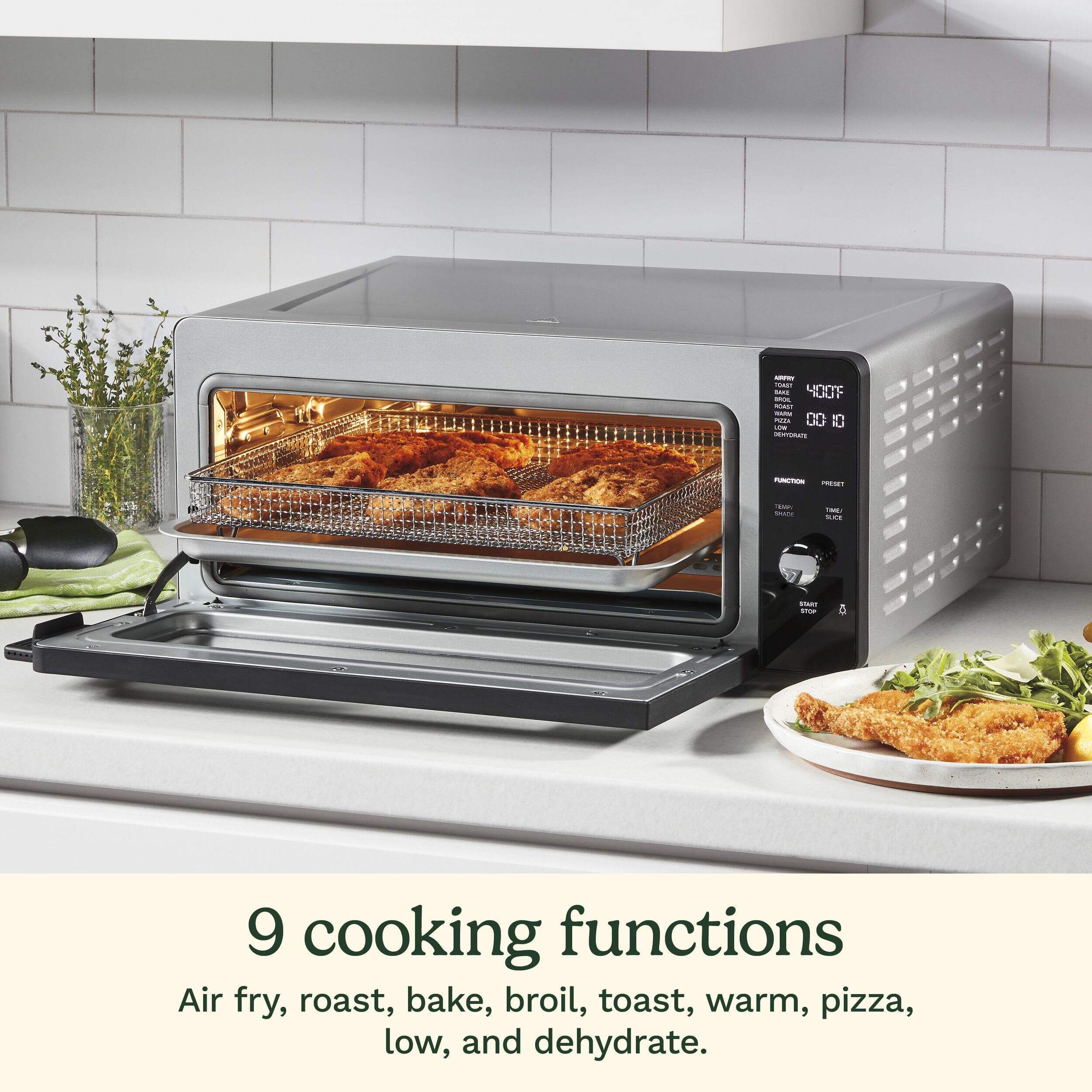 • Functions include: air fry, toast, bake, broil, roast, warm, pizza, low, dehydrate