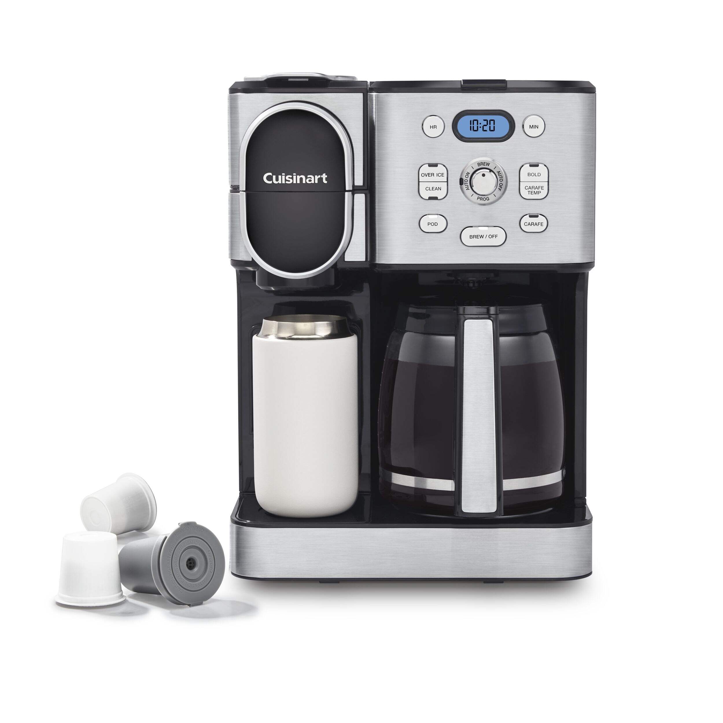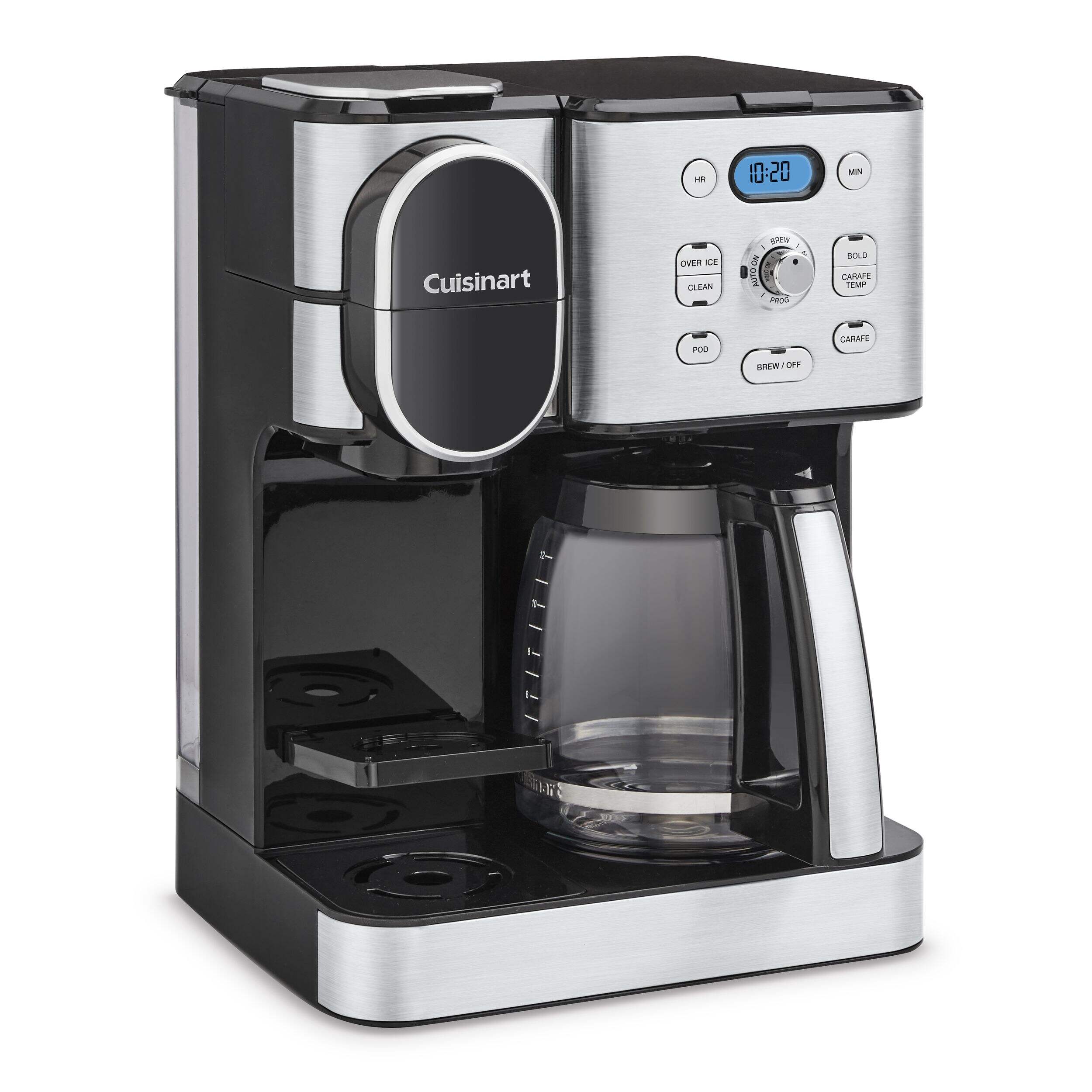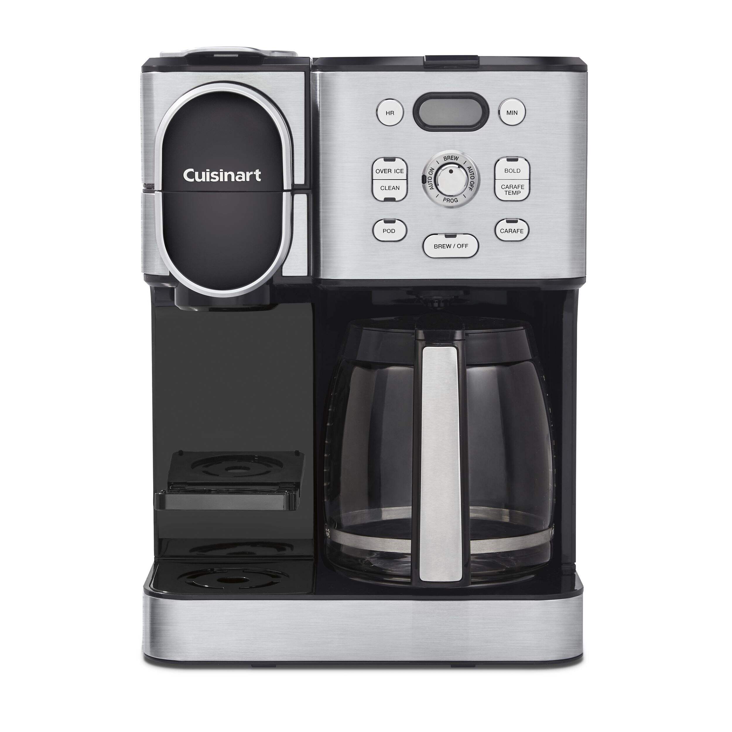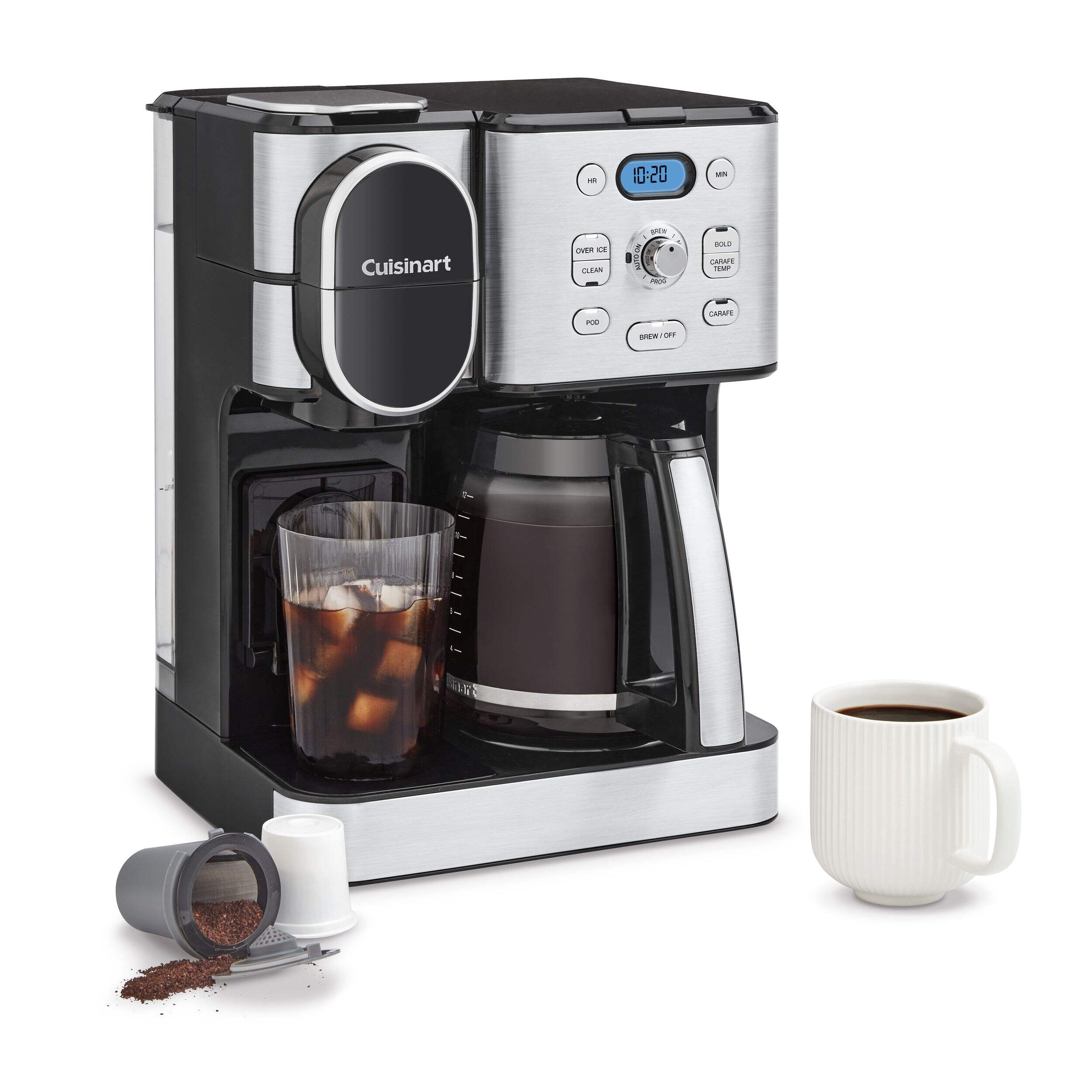 Cuisinart Programmable Single Serve Drip Coffee Maker offers an unmatched brewing experience with the flexibility of both a 12-cup carafe and single-serve brewing options. Perfect for coffee enthusiasts, it allows you to brew hot or iced coffee using any pod, including Keurig K-Cup, or the reusable HomeBarista filter. Advanced features such as Extreme Brew technology deliver coffee 25% faster, while the fully automatic functions include a 24-hour brew start, auto-off, and self-clean. Compact and versatile, this coffeemaker ensures convenience and quality in every brew.