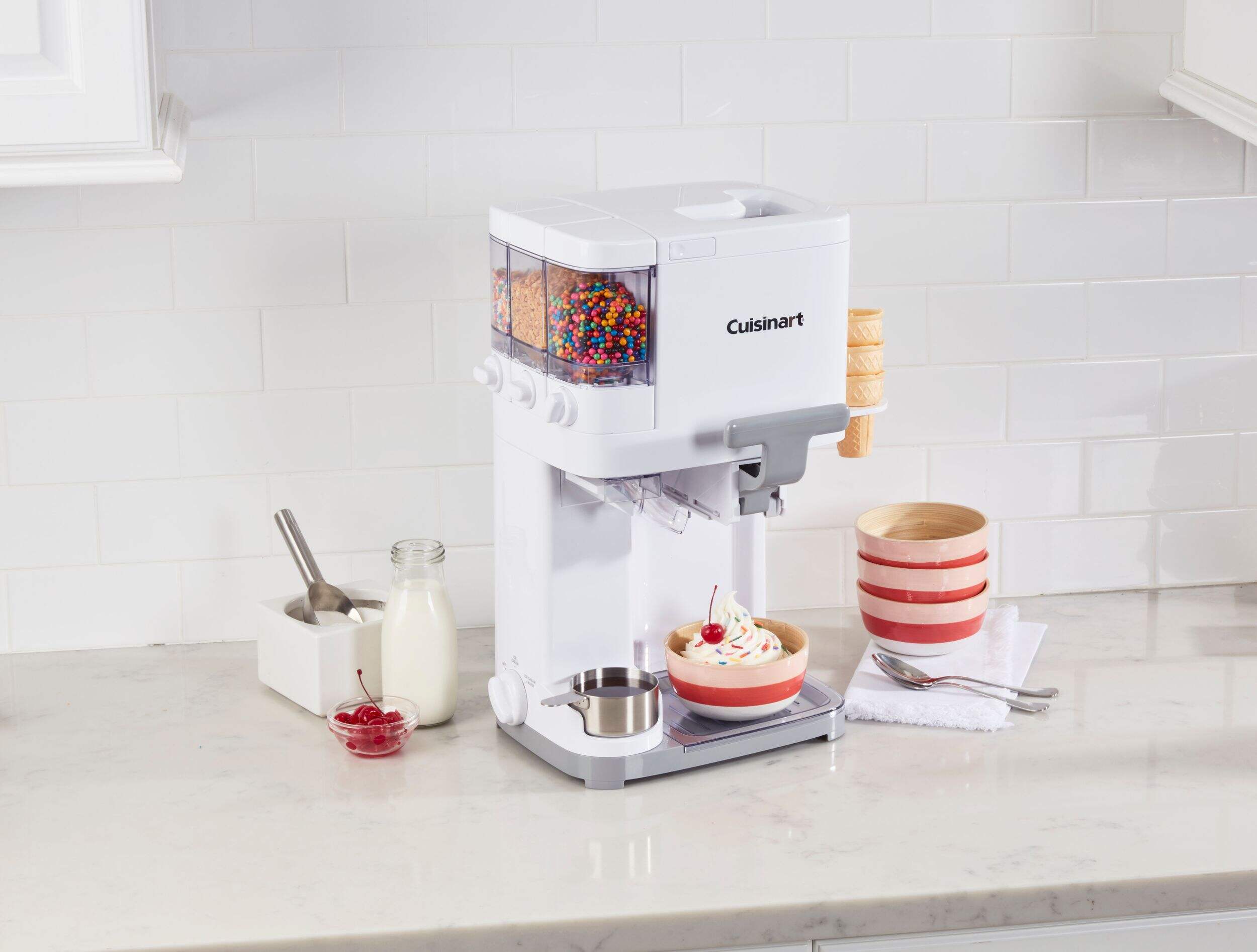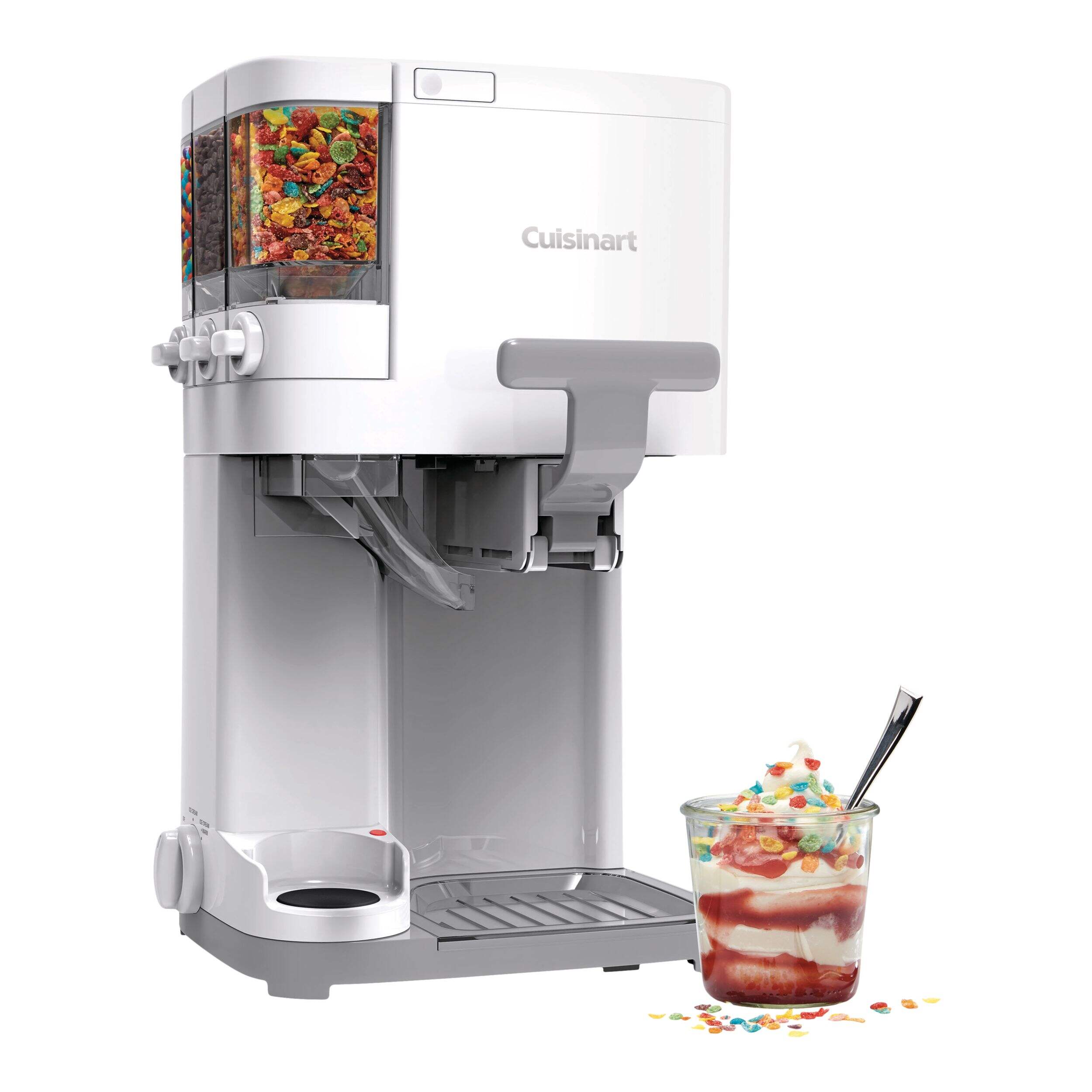 Treat friends and family to soft-serve ice cream made fast and fresh at home! The Mix It In™ Soft Serve Ice Cream Maker by Cuisinart makes it easy to create your own unique flavours. Enjoy luscious ice cream, smooth sorbets, frozen yogurt, and frosty drinks blended to perfection in minutes. For the ultimate ice cream experience, mix in crushed treats from the built-in dispensers and drizzle on hot toppings from the warming cup!