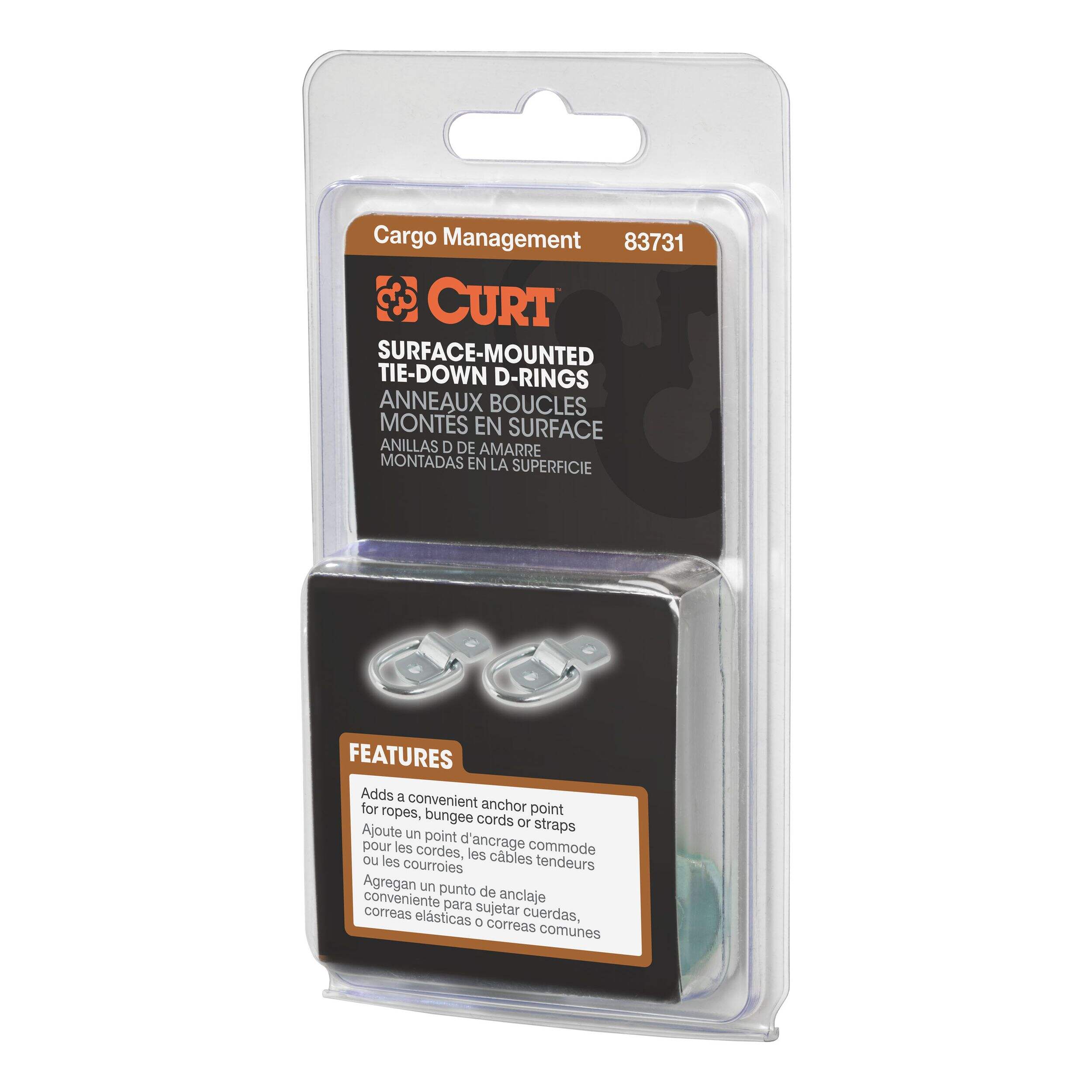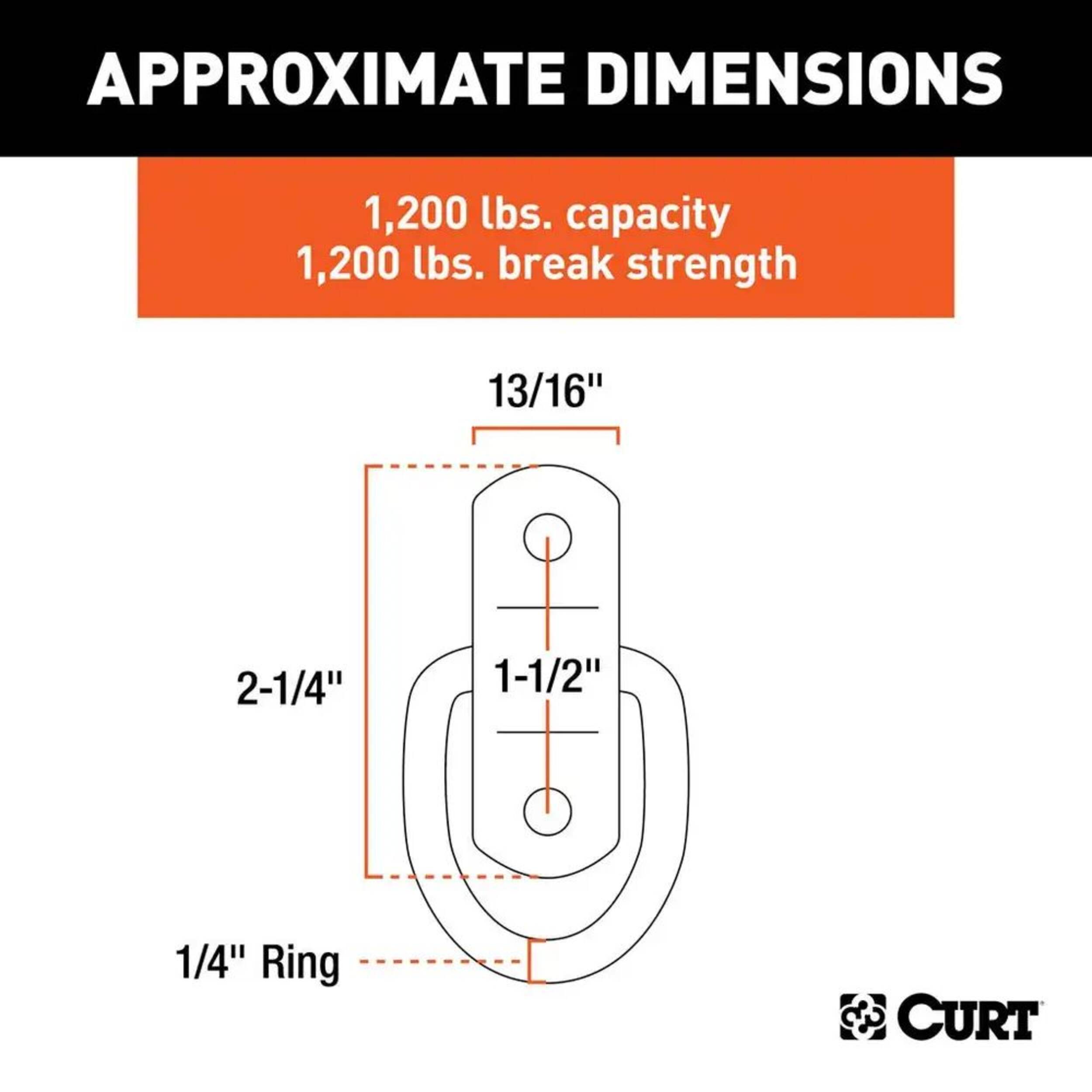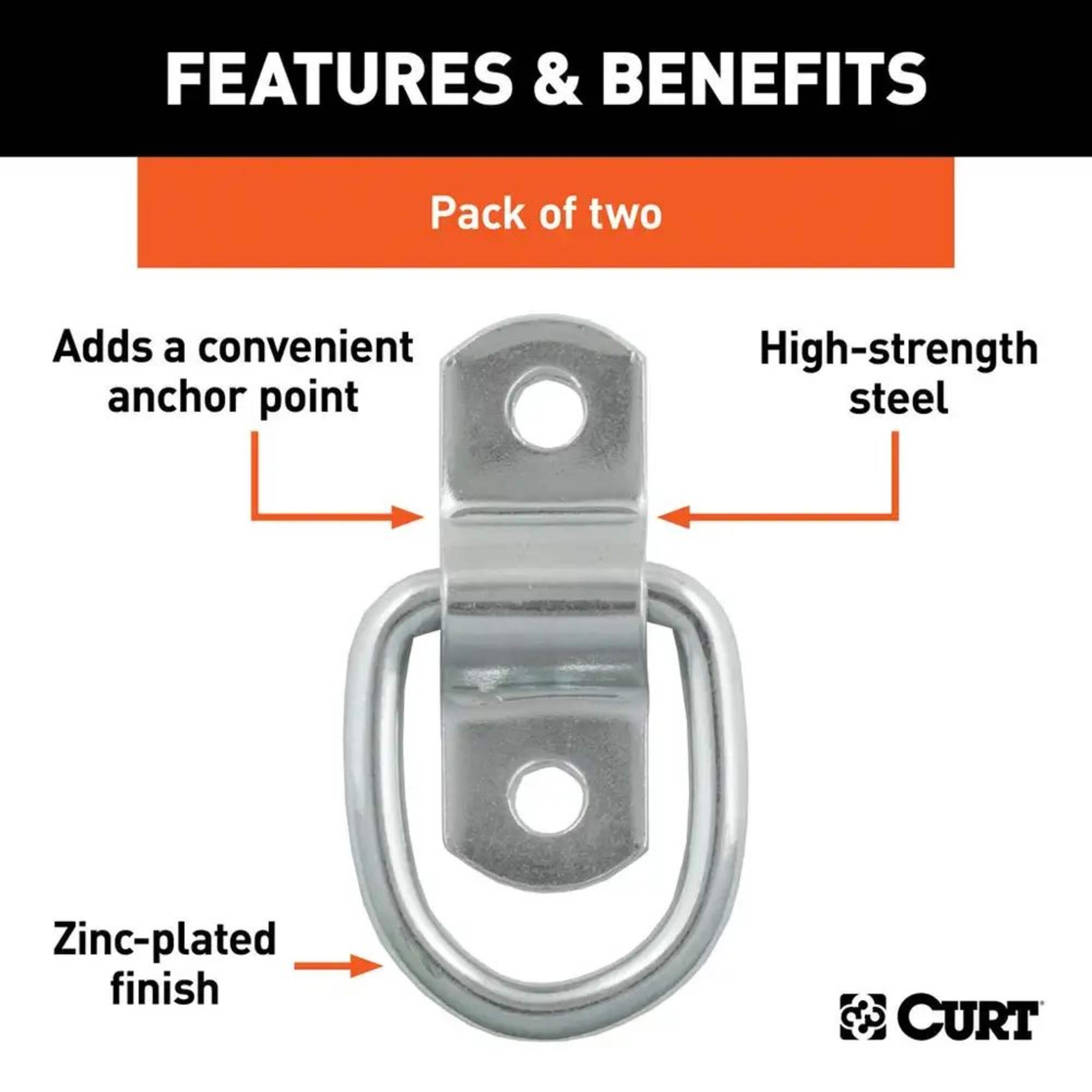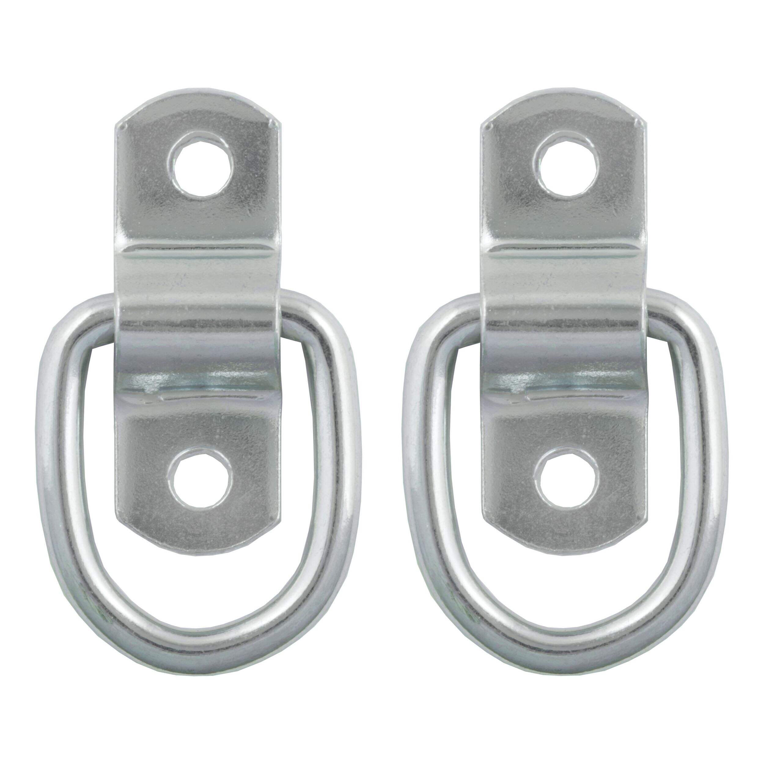 Making sure that your cargo is tied down and fully secure for the journey is important for any towing job. Not only is unsecured cargo a danger to you, your passengers and your fellow drivers, but it can also cause damage to your trailer, pickup truck bed or vehicle cargo area, as well as to the cargo itself. Together with our cargo straps and safety chains, CURT tiedown anchors are easy to mount in any trailer, truck or full-size van, and they help keep your items safe for the road ahead - These particular D-ring tiedown anchors are designed to be surface mounted and add convenient anchoring points for cargo straps, ropes or cables. They comes with a 2-1/4" x 13/16" mounting bracket with two 1/4" diameter mounting holes, spaced 1-1/2" apart, center to center. These rope rings feature zinc-plated steel construction and offer a working load capacity of 1,200 lbs. (2,400 lbs. break strength). Mounting screws are not included in this package.
