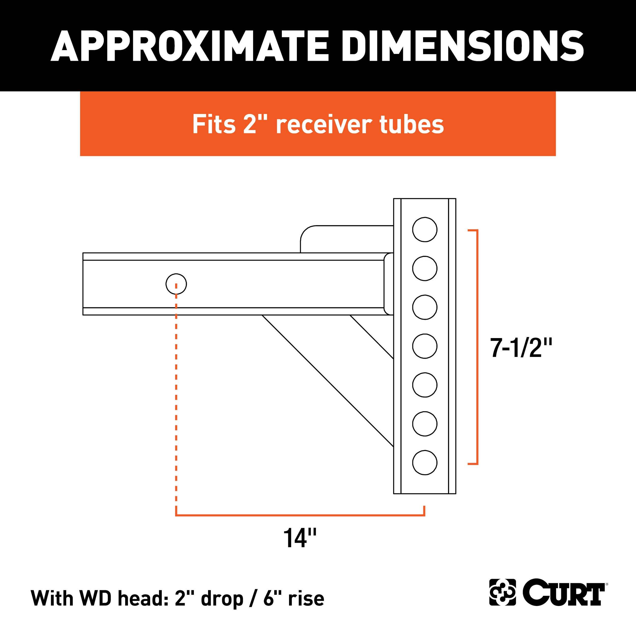 When it comes to enjoying your passion, we think towing equipment should never be the limiting factor. This CURT weight distribution replacement shank is designed for heavy-duty towing, versatile adjustment of your weight distribution hitch and long-lasting reliability. Made from high-strength steel and tested for safety, this WD replacement shank is perfect for a variety of tough jobs and long journeys. It is compatible with all CURT weight distribution hitches and has a 2" shank with a 5/8" hitch pin hole to fit any 2" x 2" receiver tube opening with a 5/8" hitch pin hole, including most CURT class 3, class 4 and Xtra Duty class 5 trailer hitches. While the receiver tube shank measures 2" x 2", the vertical shank offers a universal fit to be compatible with all CURT weight distribution hitches. Holes in the vertical shank are spaced 1-1/4" center-to-center and have a 3/4" diameter, allowing for flexible adjustment of the WD head for precise leveling of the vehicle-trailer combination. This weight distribution shank can be positioned in the rise position for a maximum rise of 6" or flipped into the drop position for a maximum drop of 2". To ensure durability and long-lasting use, CURT weight distribution replacement shanks are constructed from solid steel and shielded with a highly durable carbide black powder coat finish. This protects them from rain, snow, dirt, road salt and much more for lasting corrosion resistance.