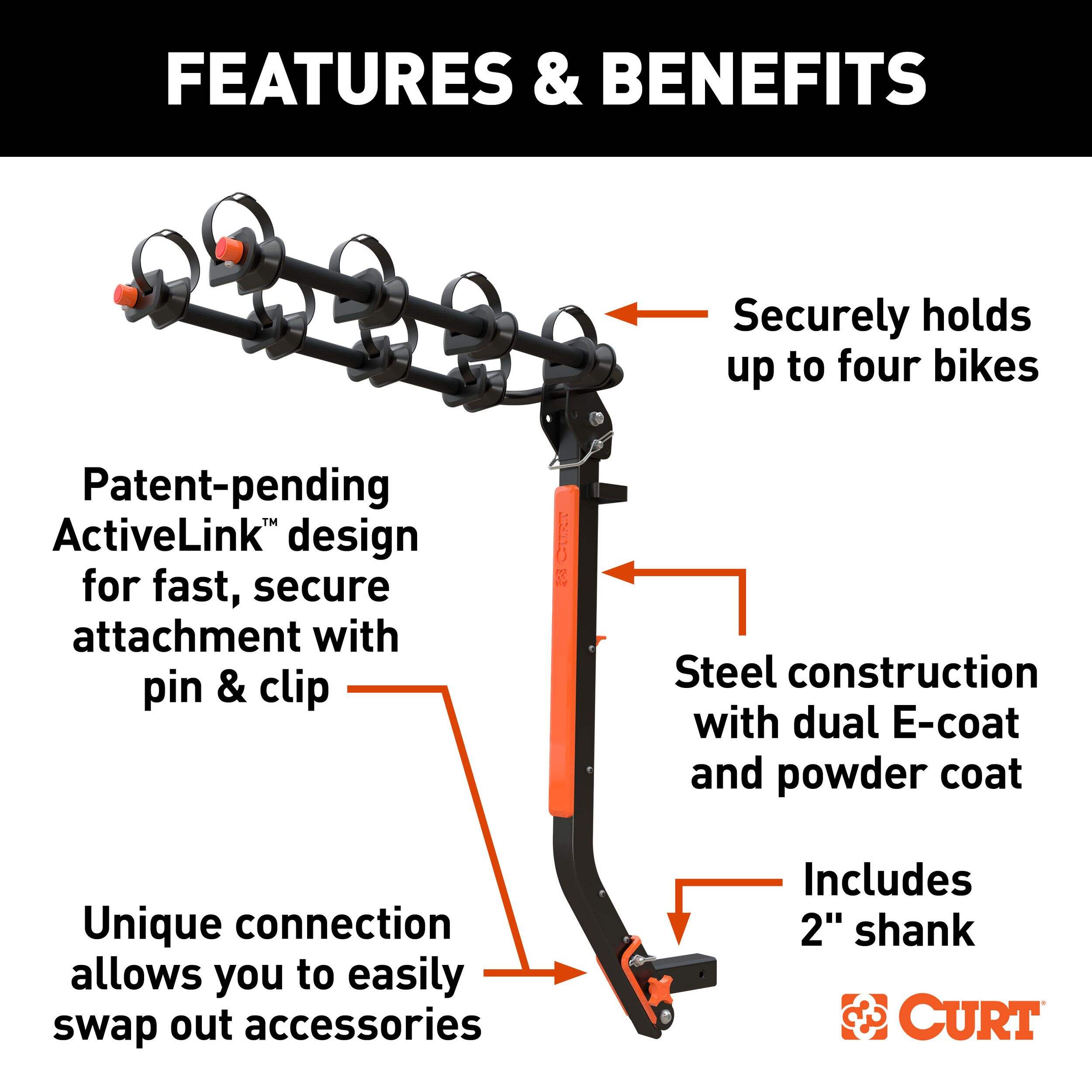 Transport up to four bikes the easy way with the CURT 18411 ActiveLink SE 4-Bike Hitch-Mounted Bike Rack. An essential accessory for anyone who enjoys finding new spots to bike, this rack ensures a secure and easy attachment to your vehicle. With rubber cradles to cushion various frame tube sizes, and a tilt-away function for easy access to your vehicle’s cargo area, this hitch-mounted bike rack is the easy way to take your bikes on the go.